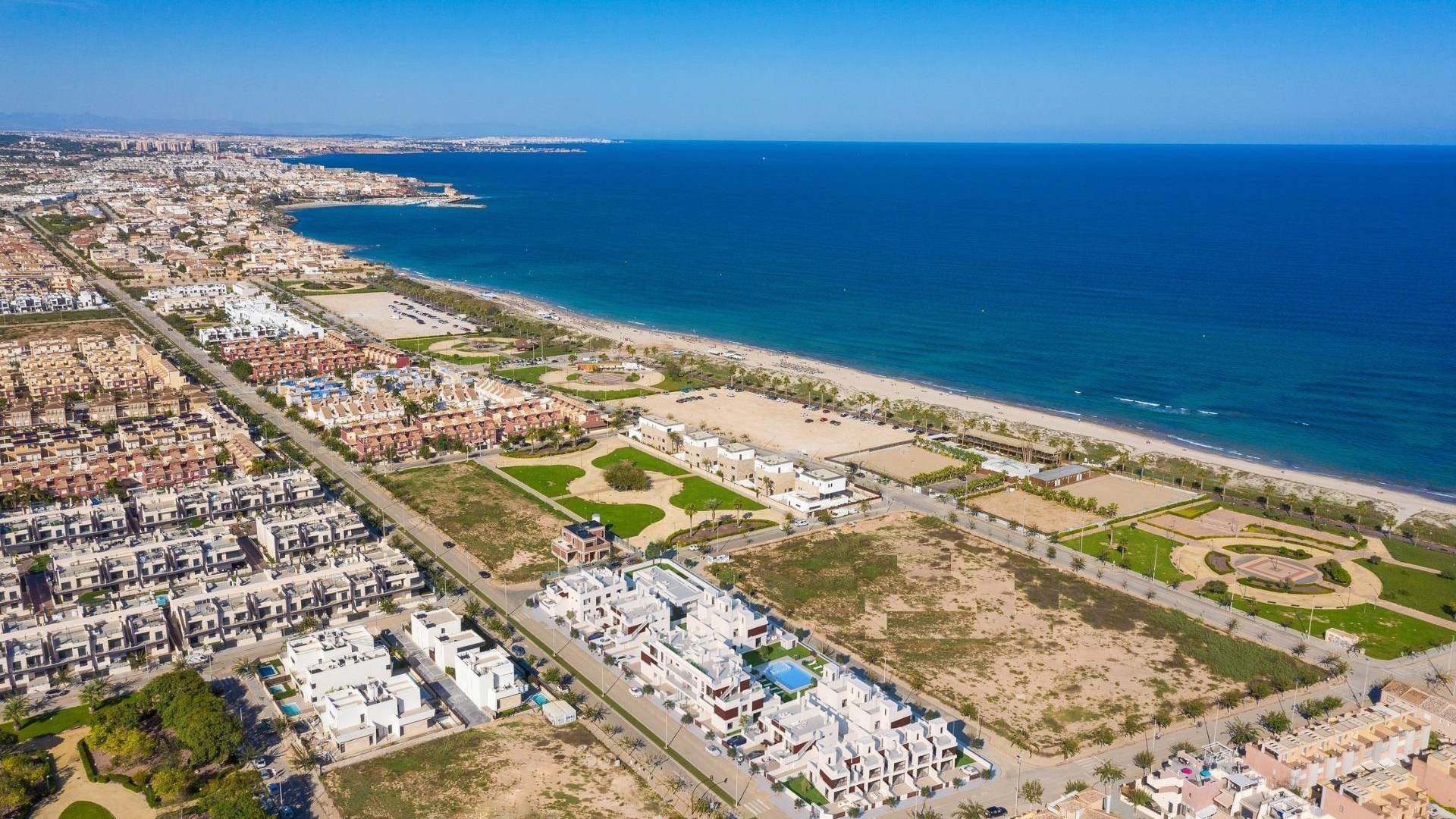Neubauwohnungen nur 200 Meter vom Strand Las Higuericas entfernt Moderne Eigenheime in Torre de la Horadada In der malerischen Küstenstadt Torre de la Horadada gelegen, befindet sich diese neue Wohnanlage in perfekter Lage nur 200 Meter vom atemberaubenden Strand Las Higuericas entfernt. Mit modernen Doppelhäusern, Bungalows im Erdgeschoss mit eigenem Garten, Bungalows im Obergeschoss mit Sonnenterrasse und eleganten Apartments verbindet diese Wohnanlage modernes Design mit einem Hauch von Exklusivität. Die Häuser sind in 2- und 3-Schlafzimmer-Grundrissen erhältlich und erfüllen die unterschiedlichsten Lebensbedürfnisse. Außergewöhnliche Annehmlichkeiten der Gemeinschaft Jede Wohnung verfügt über einen Privatparkplatz, großzügige Terrassen, Grünflächen und Zugang zu einem Gemeinschaftspool. Diese Wohnungen wurden sorgfältig entworfen, um den Komfort und die Bequemlichkeit zu verbessern, und bieten eine perfekte Umgebung zum Entspannen und Genießen. Erstklassige Ausstattung für maximalen Komfort Jede Wohnung umfasst: Motorisierte Jalousien in allen Zimmern. Verstärkte Eingangstüren für zusätzliche Sicherheit. Fußbodenheizung in den Bädern. Badmöbel und Duschabtrennungen. Außenbeleuchtung für Terrassen und Gärten. Geräte: Dunstabzugshaube, Cerankochfeld, Backofen, Kühlschrank, Geschirrspüler, Mikrowelle und Waschmaschine. Die Bungalows im Erdgeschoss und die Solarien sind mit Warm- und Kaltwasserduschen ausgestattet, während alle Wohnungen über ein energieeffizientes aerothermisches System zur Warmwasserbereitung verfügen. Erstklassige Lage in Torre de la Horadada Die Anlage befindet sich in einer lebhaften und doch ruhigen Gegend, von der aus die wichtigsten Einrichtungen und Attraktionen leicht zu erreichen sind: Las Higuericas Strand: Nur 200 Meter entfernt. Flughafen Murcia: Ungefähr 30 km. Lo Romero Golfplatz: Nur 10 km. Dos Mares Einkaufszentrum: 11 km. Hafen von San Pedro del Pinatar: 8 km. Genießen Sie einen einzigartigen Lebensstil an der Küste, der schöne Strände, Restaurants und Freizeitaktivitäten in unmittelbarer Nähe vereint. Ihr Traumhaus erwartet Sie Verpassen Sie nicht die Gelegenheit, ein modernes, gut ausgestattetes Haus in einer der begehrtesten Lagen der Costa Blanca zu besitzen. Kontaktieren Sie uns noch heute, um mehr zu erfahren oder einen Besichtigungstermin zu vereinbaren!