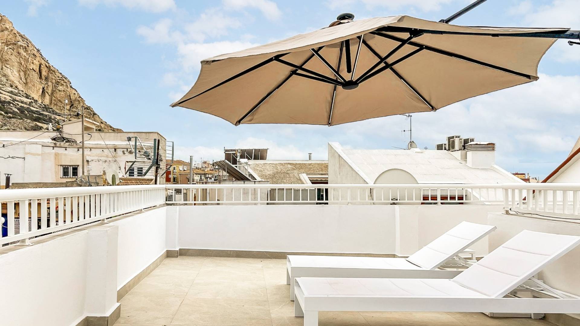 Das Penthouse befindet sich im vierten Stock und bietet 45 m² Wohnfläche sowie 40 m² private Terrassen – eine echte Seltenheit im Stadtzentrum. Die beiden Terrassen bieten Sonne, Privatsphäre und einen freien Blick über Alicante, ideal sowohl zur Eigennutzung als auch zur touristischen Vermietung.