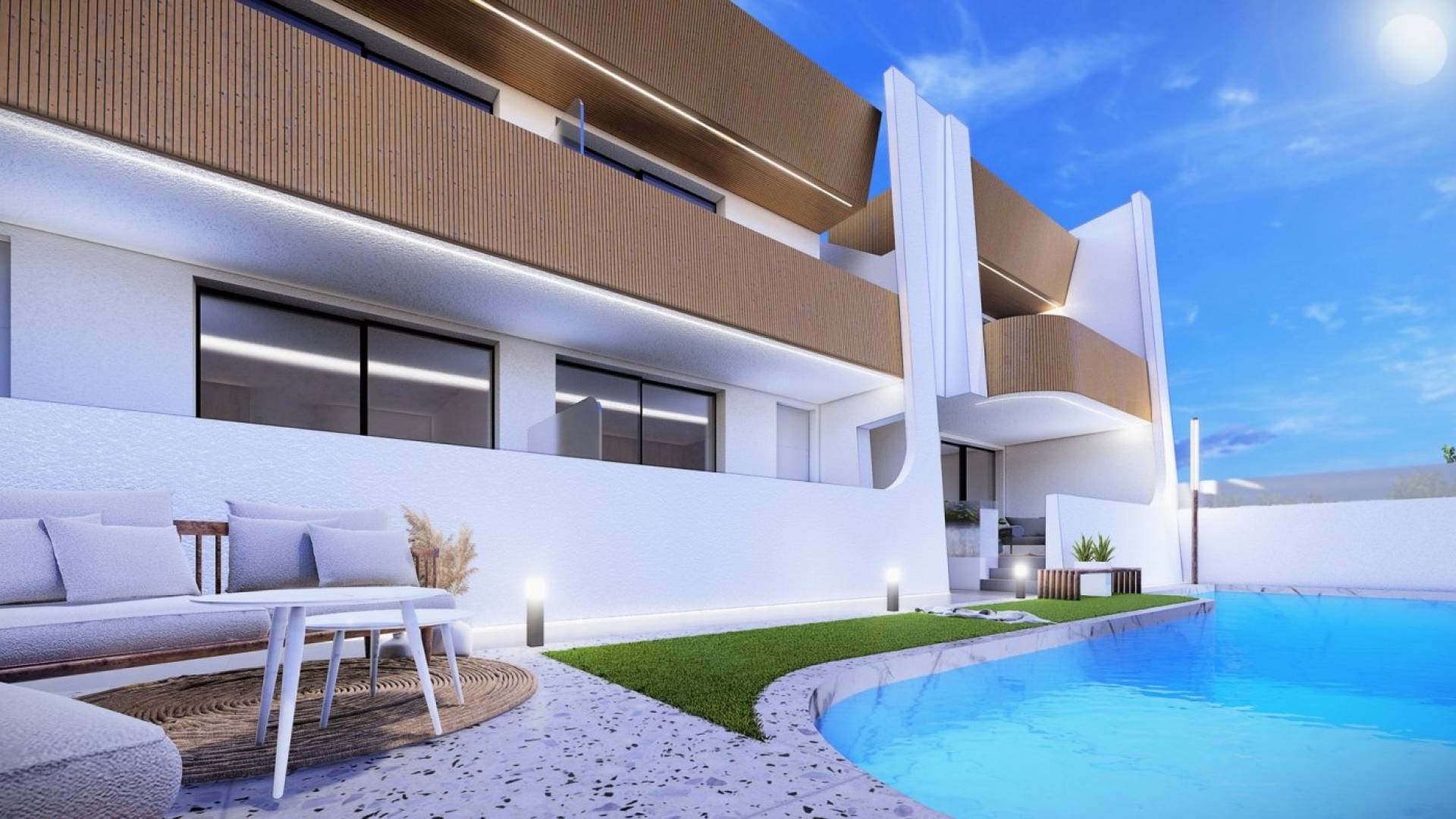 RESIDENCIAL DE APARTAMENTOS DE OBRE NUEVA EN LO PAGAN Residencial de nueva construcción de apartamentos en planta baja con gran terraza delantera y patio trasero o ático con terraza delantera y gran solarium privado en la azotea con pérgola y cocina de verano, situado a sólo 350 metros de la playa. Jardín / Planta Baja: La puerta principal se abre a la amplia zona de estar con zona de comedor situada a un lado. La cocina, totalmente equipada, se encuentra junto a las puertas correderas que permiten la entrada de luz natural. Al lado hay un baño familiar con lavabo, aseo y ducha y 2 dormitorios de tamaño generoso - el dormitorio principal con baño en-suite. Modelo de ático: Una escalera le lleva a la zona de la planta superior con gran terraza privada de baldosas, con puerta de entrada a la propiedad. Al igual que los modelos de la planta baja, un generoso salón/comedor de planta abierta con la cocina de gran tamaño - 2 dormitorios a un lado (el principal con baño en-suite). Se accede al solarium privado de la azotea desde la parte trasera de la cocina. Llave en mano: Nuestras viviendas incluyen toda la iluminación LED interna y externa, máquina de a/c instalada, suelo radiante en ambos baños, cocina equipada con placa de inducción, horno, lavavajillas, paquete completo de muebles y aparcamiento en garaje subterráneo. Hay trasteros opcionales disponibles por un cargo adicional. Todo ello disfrutando de una amplia zona ajardinada comunitaria con piscina. Situado en el borde norte del Mar Menor, Lo Pagan tiene algo que ofrecer a todos. Las playas en Lo Pagan son algunos de los mejores que se encuentran en cualquier lugar alrededor del Mar Menor y se alinean con algunas fantásticas tiendas, restaurantes y bares Chringuito. Al otro lado de la bahía, está el popular Puerto Deportivo, con su fantástico restaurante y parque de atracciones para niños que funciona durante todo el verano. El puerto deportivo está situado cerca del centro de la ciudad, donde se puede explorar la gran variedad de tiendas, iglesias y otros restaurantes y bares que se ofrecen aquí, sirviendo fantástica comida y bebidas hasta altas horas de la noche. También hay una amplia gama de deportes acuáticos y actividades disponibles en Lo Pagan, desde motos acuáticas, paseos en barco, Padel Boarding, Windsurfing, y más. En los meses de verano, también hay un curso de asalto inflable justo al lado de la costa para divertirse con los niños de todas las edades. El gran atractivo de zonas como Lo Pagan es su ubicación en el Mar Menor, con sus aguas cálidas y poco profundas es el lugar perfecto y seguro para que los niños jueguen todo el año, y el alto contenido de sal también tiene grandes beneficios para la salud para todos. Complejo situado a 30 minutos del aeropuerto de Murcia - Corvera y a 1 hora del aeropuerto de Alicante.