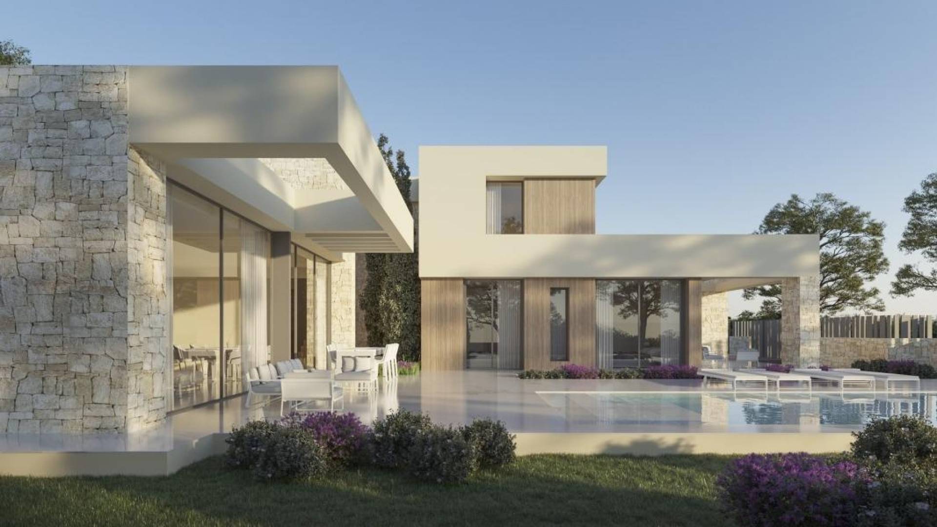 VILLA MODERNA DE OBRA NUEVA EN JAVEA Villa moderna de nueva construcción en una zona tranquila de Jávea. Este bonito proyecto de acabados en piedra, consta de 2 plantas que se comunican con una moderna escalera interior. La planta baja tiene 2 dormitorios con baños en-suite, una cocina, un salón-comedor, un lavadero y un aseo. La cocina está totalmente equipada y está abierta al salón. Unas puertas correderas de cristal dan acceso directo a una gran terraza y a la piscina. En la planta superior hay otro dormitorio con baño. La casa tiene aire acondicionado y calefacción por suelo radiante. Tiene una puerta de entrada automática con una entrada peatonal independiente. Al mismo nivel que la casa principal se encuentra la piscina. Incluye jardín a personalizar por el cliente. Jávea (Xabia) es una localidad alicantina perteneciente a la Comunidad Valenciana. Situada en la Costa Blanca, dista 92 km de Alicante y 105 km de Valencia. Situada entre dos cabos (La Nao y San Antonio) está bañada por las aguas del mar Mediterráneo y resguardada de los vientos continentales por la barrera montañosa del Montgó. Posee, por tanto, un paisaje de contrastes: costa, montaña e interior de huertas y viñedos. Jávea ha sido una población tradicionalmente dedicada al comercio y la pesca, pero la variedad de paisajes que ofrece, junto con su clima suave durante todo el año y su cuidada planificación urbanística la han convertido en uno de los puntos turísticos más importantes de la Comunidad Valenciana, todo ello sin perder el encanto de los pueblos pesqueros del Mediterráneo. Javea (Xabia) se encuentra a 92 km de Alicante.