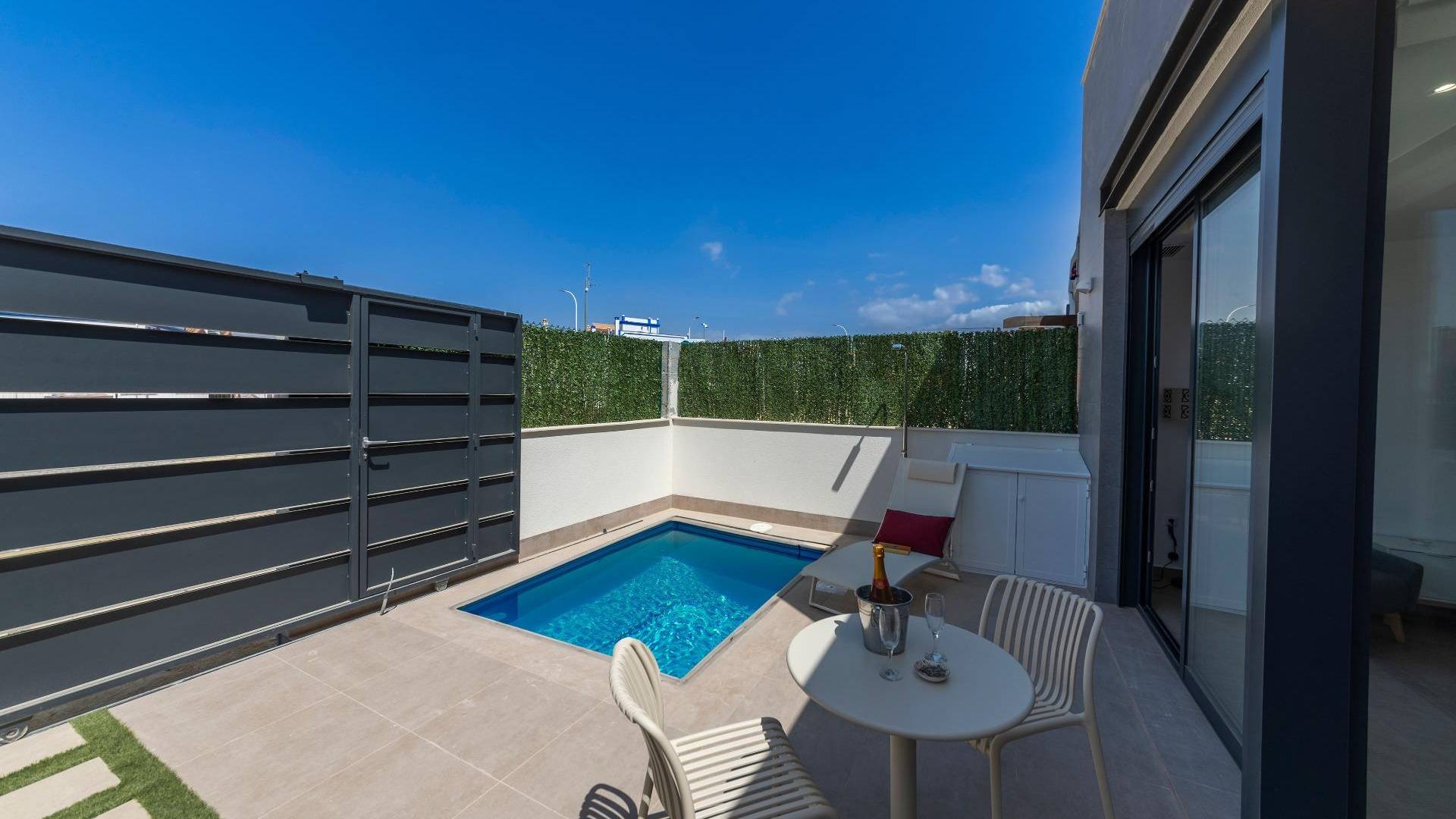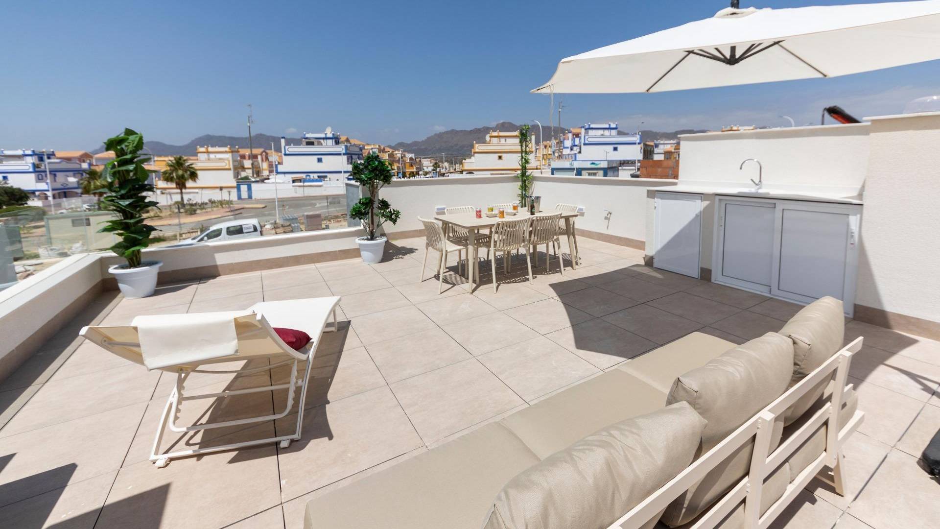 VILLAS DE OBRA NUEVA SAN JUAN DE LOS TERREROS, ALMERIA Obra Nueva de 26 Modernas villas de planta baja con solarium y piscina privada, de 2 y 3 dormitorios, a 500 metros de las playas. En pleno centro, gran acceso a todos los servicios del día a día, como restaurantes, bares con exquisita gastronomía, centros educativos, instalaciones deportivas, supermercados, tiendas y centro comercial a 10 min en coche. Villas situadas a 60 min del Aeropuerto Internacional de Corvera y a 60 min del Aeropuerto Internacional de Almería. El proyecto se va a desarrollar en una parcela elevada donde disfrutará de impresionantes vistas a zonas verdes, situada a tan sólo 500 metros de la playa, cerca de atractivos turísticos muy atractivos como nuestra Geoda, cubierta por enormes cristales de selenita, una variedad transparente o translúcida de yeso, la más grande del mundo que se puede visitar. Campos de golf: Aguilón Golf a 5′ en coche de la urbanización y Golf San Juan a 3′ en coche. Incluido en el precio: Piscina privada con iluminación y ducha exterior. Solarium equipado con cocina de verano. Zona ajardinada con césped artificial y alicatada según plano. Lavadero bajo la escalera con acceso al solarium. Iluminación LED interior y exterior. Tomas de TV en todas las habitaciones y porche. Persianas eléctricas en dormitorios. Portero automático. Sanitarios, espejo con LED y pantalla fija. Armarios empotrados acabados con cajonera y altillo. Cocina amueblada con encimera y frente de Silestone, electrodomésticos (lavadora, horno, vitrocerámica, campana extractora, lavavajillas, frigorífico y aerotermo). Las ventanas correderas son de alta seguridad, doble cámara. Preinstalación de conductos de aire acondicionado con rejillas de retorno. Preinstalación de placas fotovoltaicas. Plaza de garaje con césped artificial y zona de aparcamiento dentro de la parcela. Preinstalación para motor de puerta de parking. Muro perimetral con valla de simple torsión y seto artificial. Gas ciudad. San Juan de los Terreros, en Andalucía, es un destino costero de ensueño. Sus aguas cristalinas invitan a relajarse bajo el sol y disfrutar de la tranquilidad del mar. El estilo de vida en esta encantadora localidad es tranquilo y relajado, con un ritmo pausado que permite apreciar la belleza natural y la rica cultura de la región. Con una amplia oferta de restaurantes, bares y actividades al aire libre, San Juan de los Terreros es el lugar perfecto para disfrutar de la vida junto al mar.