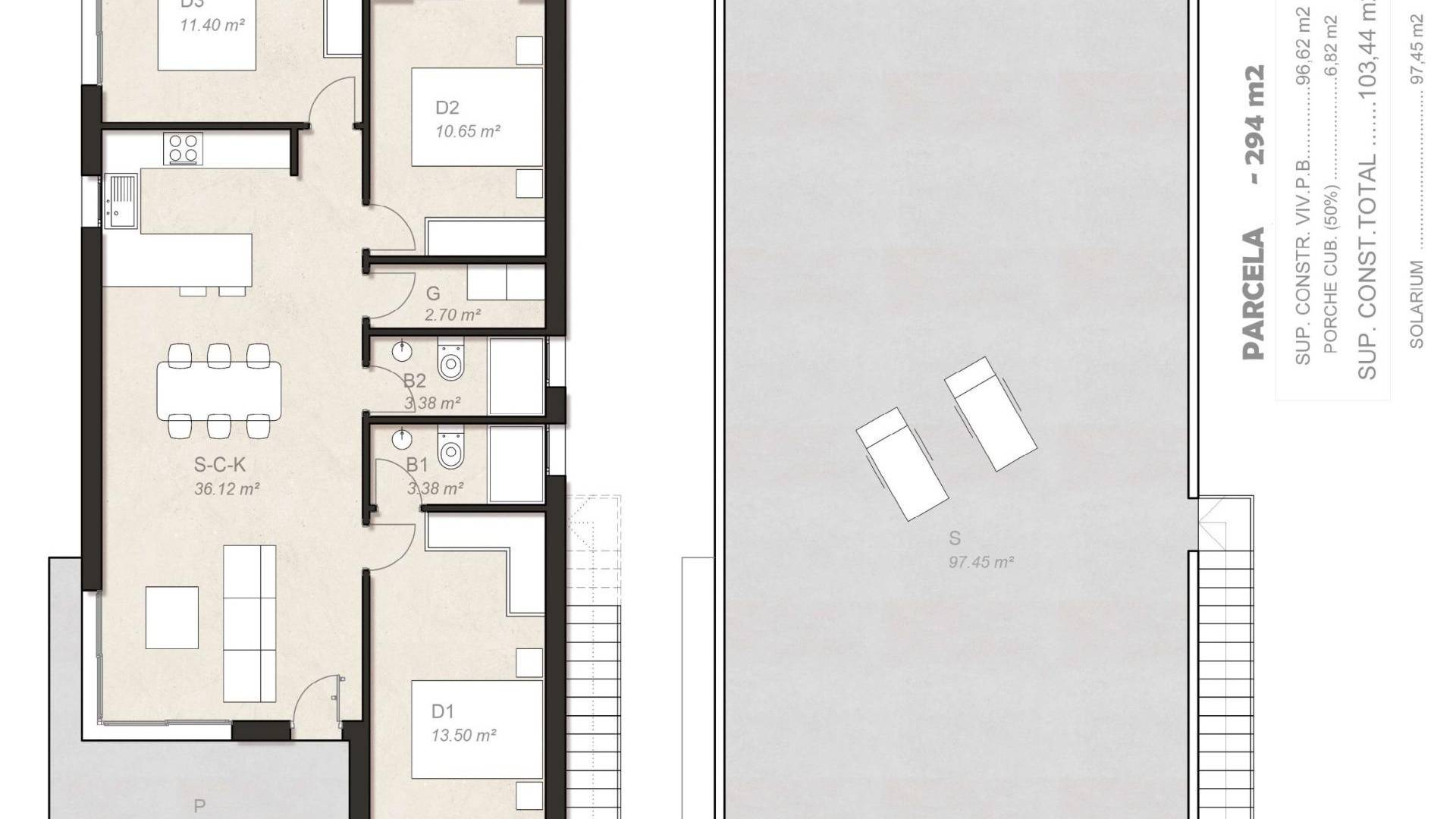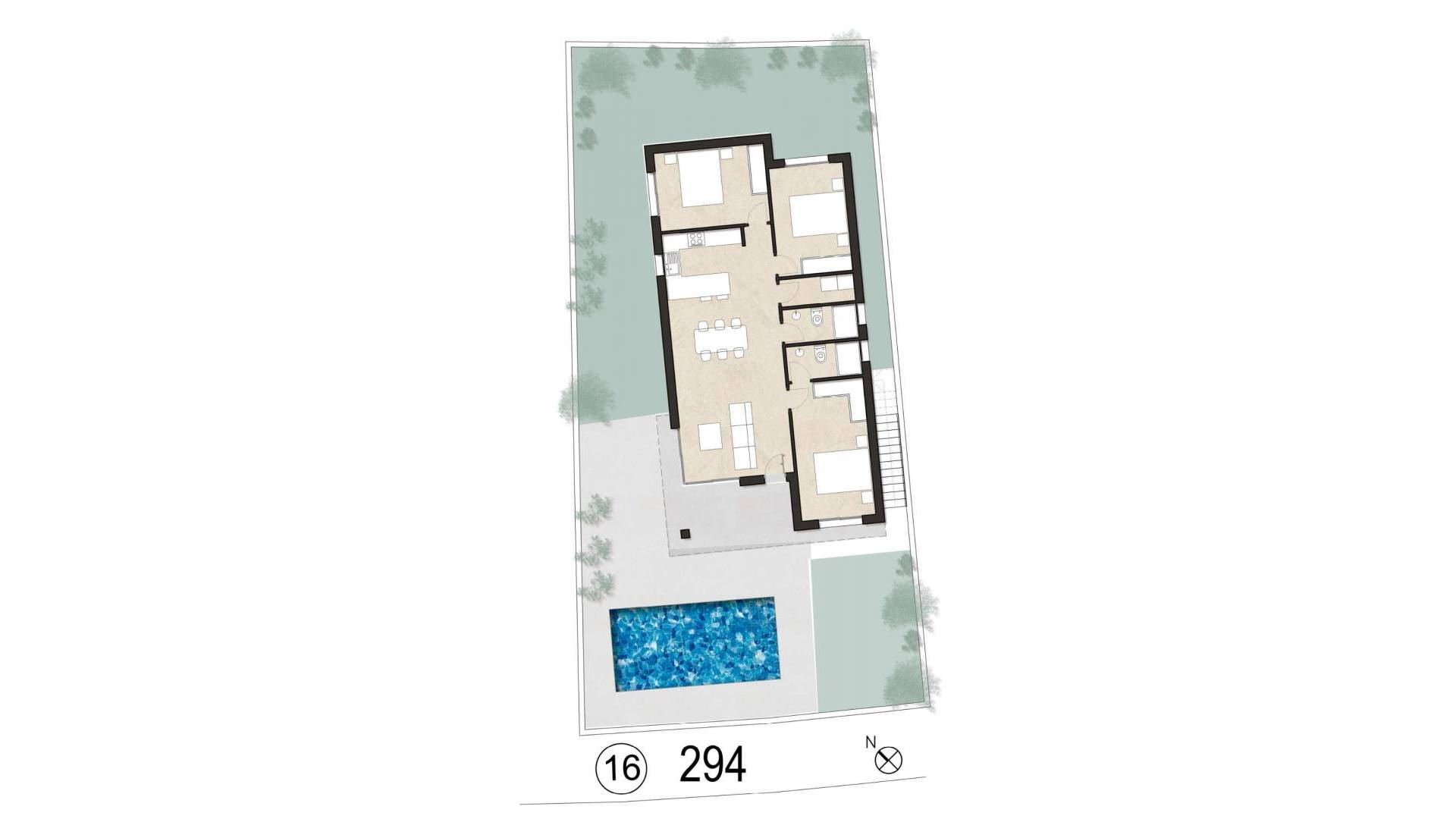 VILLA DE OBRA NUEVA EN PINAR DE CAMPOVERDE Moderna villa de obra nueva en Pinar de Campoverde. Villa construida en 1 planta y dispone de 3 dormitorios, 3 baños, cocina americana con el salón, armarios empotrados, terraza, amplio solarium, jardín privado con la piscina opcional y plaza de garaje. Preinstalación de aire acondicionado por conductos de fibra con rejillas en dormitorios y salón, con preinstalación independiente por niveles. Instalación de suelo radiante eléctrico en baños. Muebles de cocina con puertas lacadas en blanco brillo, con sistema de freno en puertas. Bancada de cocina de Silestone o equivalente con variedad de colores a elegir. Electrodomésticos que incluyen: frigorífico, horno-vitro-campana extractora, lavavajillas de 45 cm y lavadora de 5 kg. Puerta blindada de acceso a vivienda de seguridad con 3 puntos de cierre, marca Dierre o similar. Puertas y ventanas de aluminio lacado en gris con doble acristalamiento, todas con persianas térmicas de aluminio, persianas motorizadas en la carpintería de salón y dormitorio principal, según CTE. Villa situada en Pinar de Campoverde (Alicante), rodeados de servicios, instalaciones deportivas, cerca de varios Campos de Golf como Las Colinas y Lo Romero Golf, además de estar a 10 minutos del Mar Menor y playas del Mediterráneo. Las preciosas playas de Torre de la Horadada y Mil Palmeras con paseo marítimo de arena fina se encuentran a 10 minutos en coche. Los aeropuertos de Corvera (Murcia) y Alicante se encuentran a 40 y 55 minutos respectivamente.