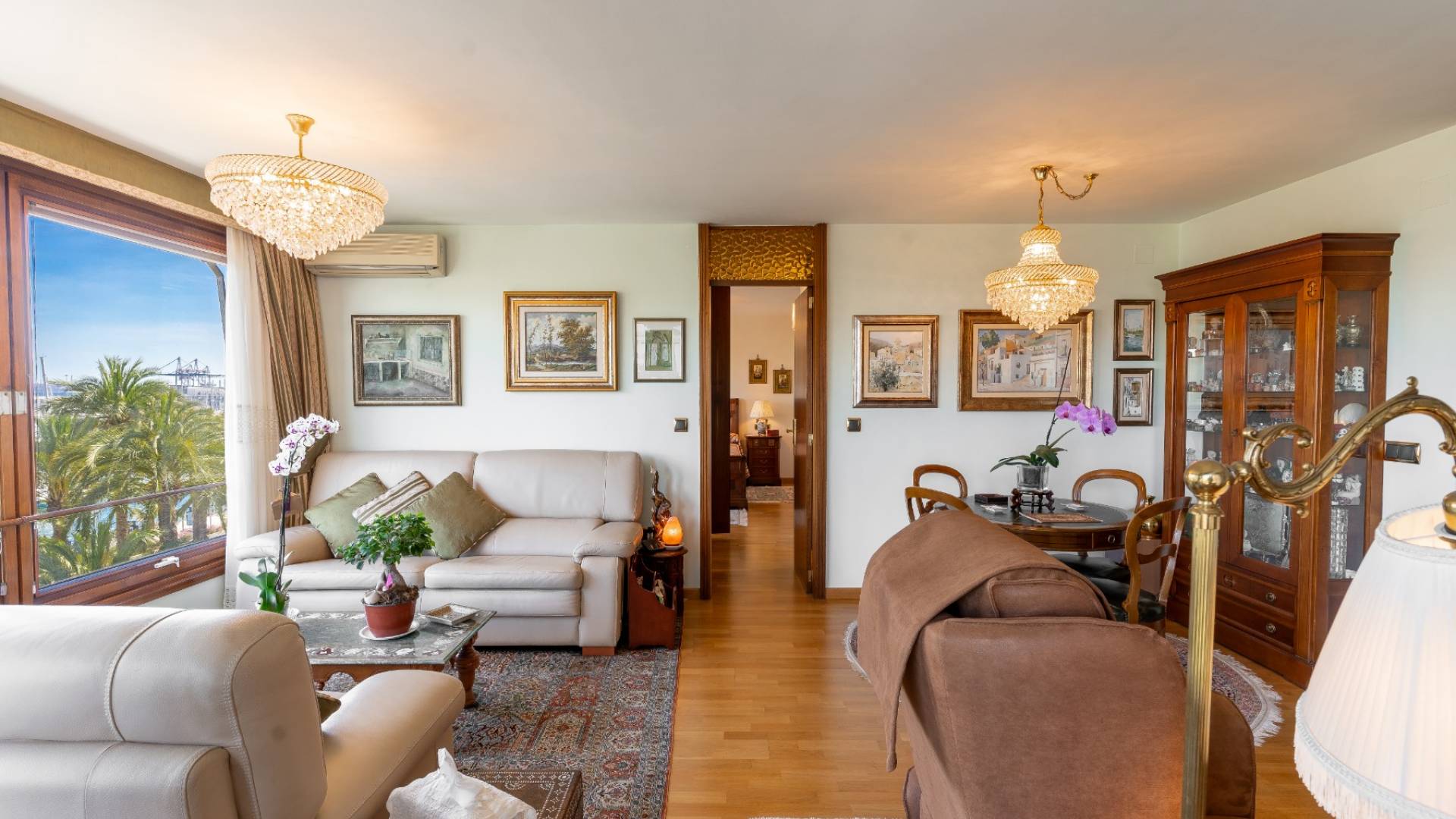 El salón es simplemente espectacular: tres grandes ventanales en esquina permiten que la luz bañe cada rincón y revelan unas vistas de postal. A esto se suma un comedor independiente, perfecto para celebraciones o comidas en familia con el mar como telón de fondo.