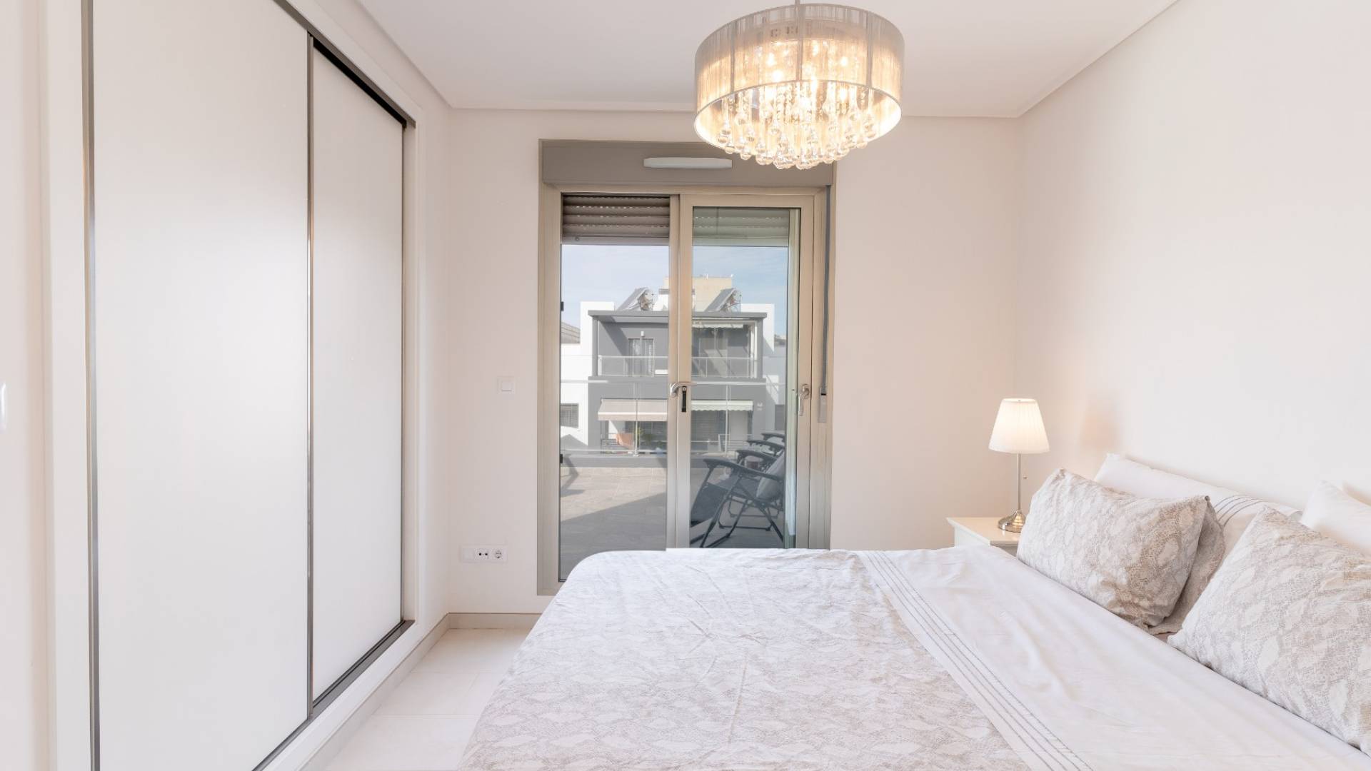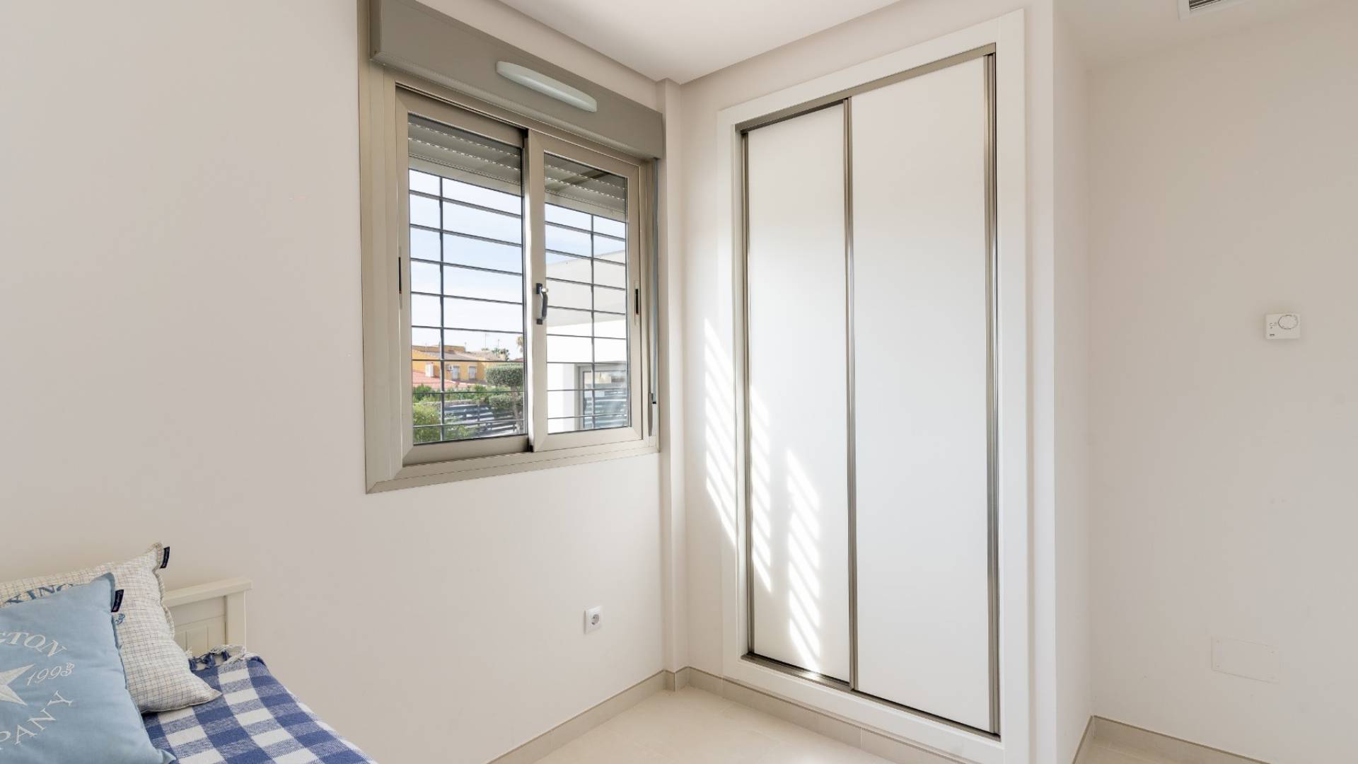 La planta superior alberga el dormitorio principal con baño en suite, armarios empotrados y cama king-size. Desde aquí se accede al solárium privado, un espacio ideal para tomar el sol, relajarse o disfrutar de momentos al aire libre con total privacidad.