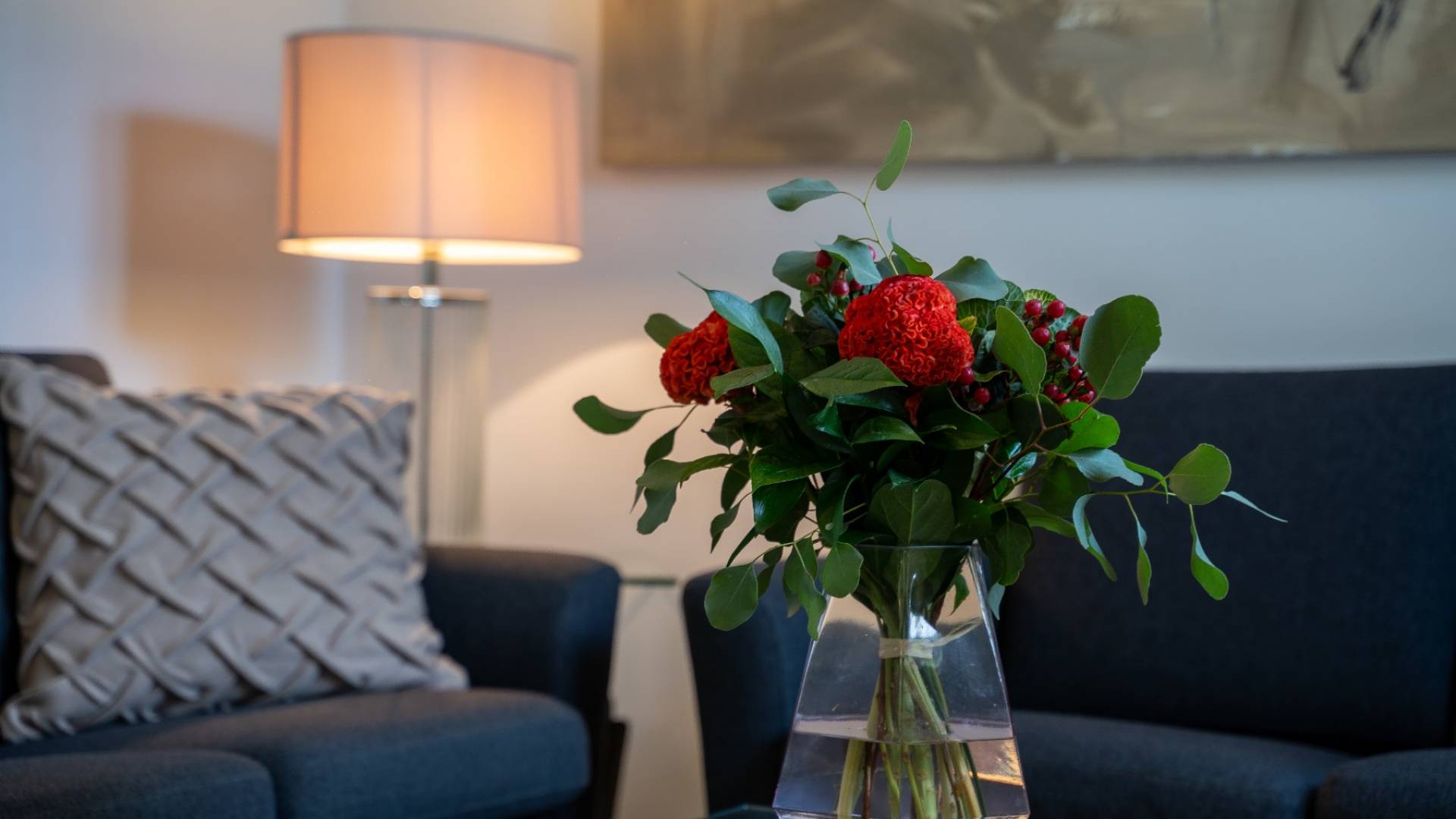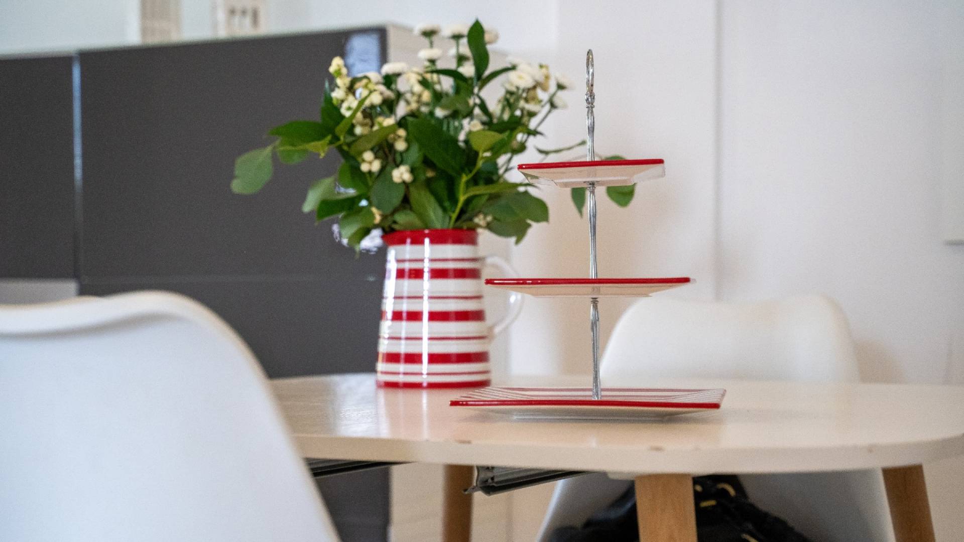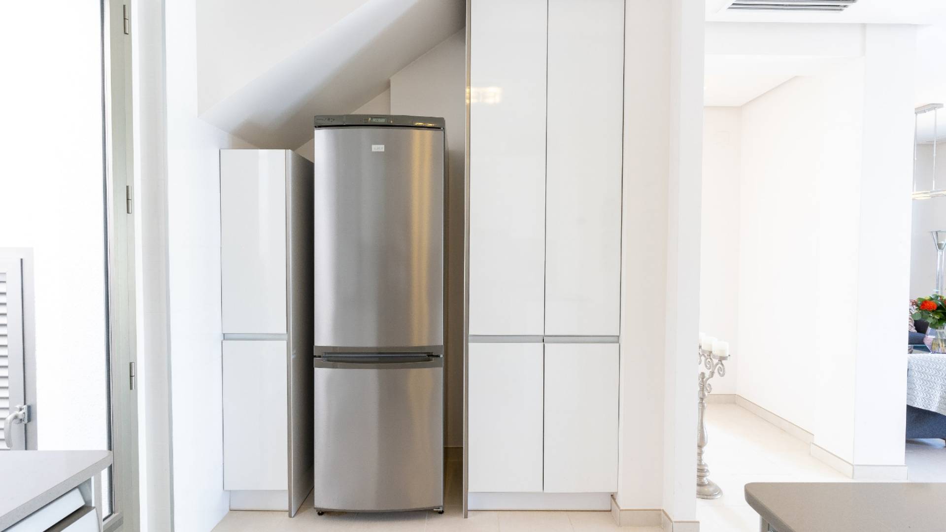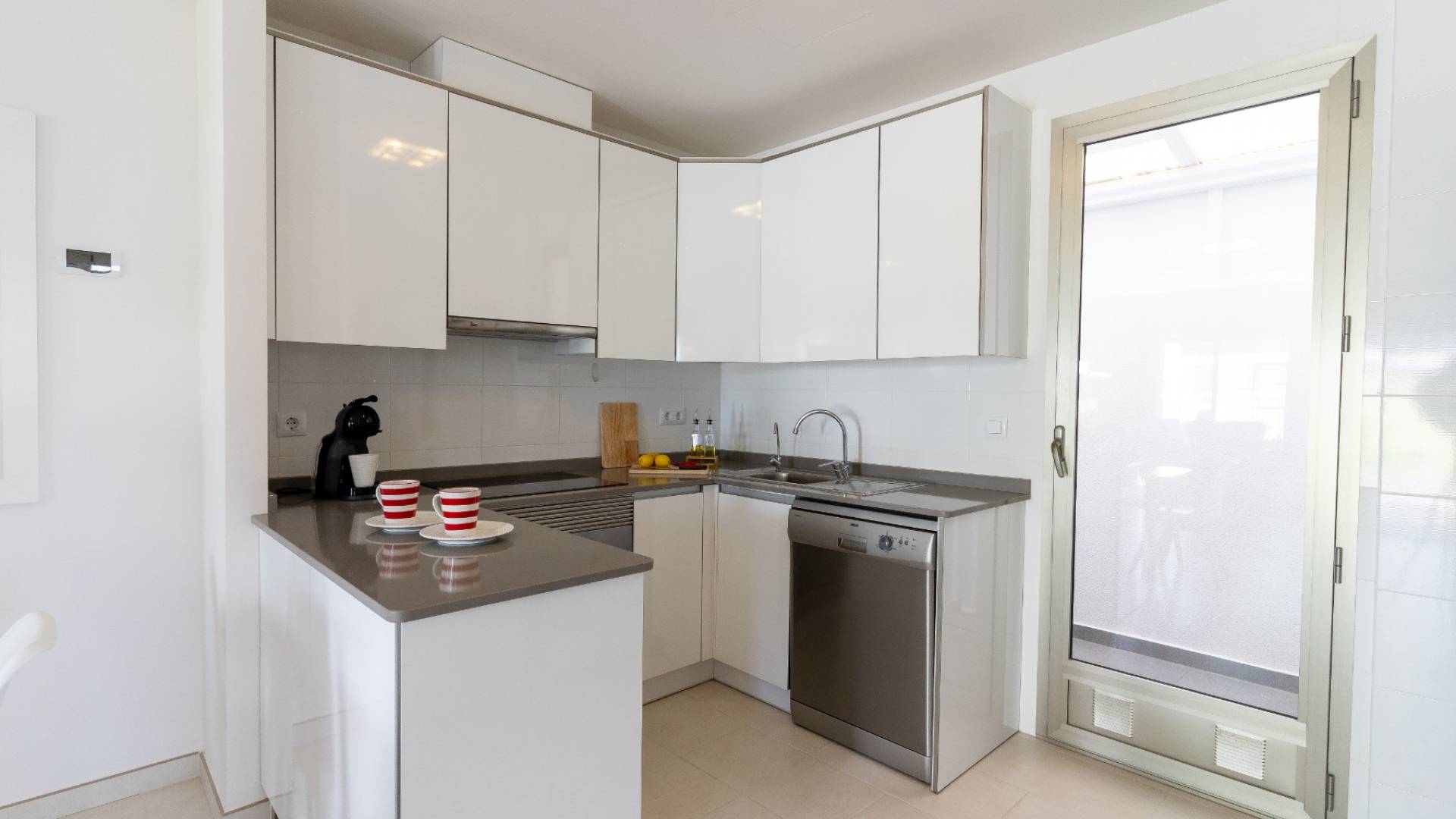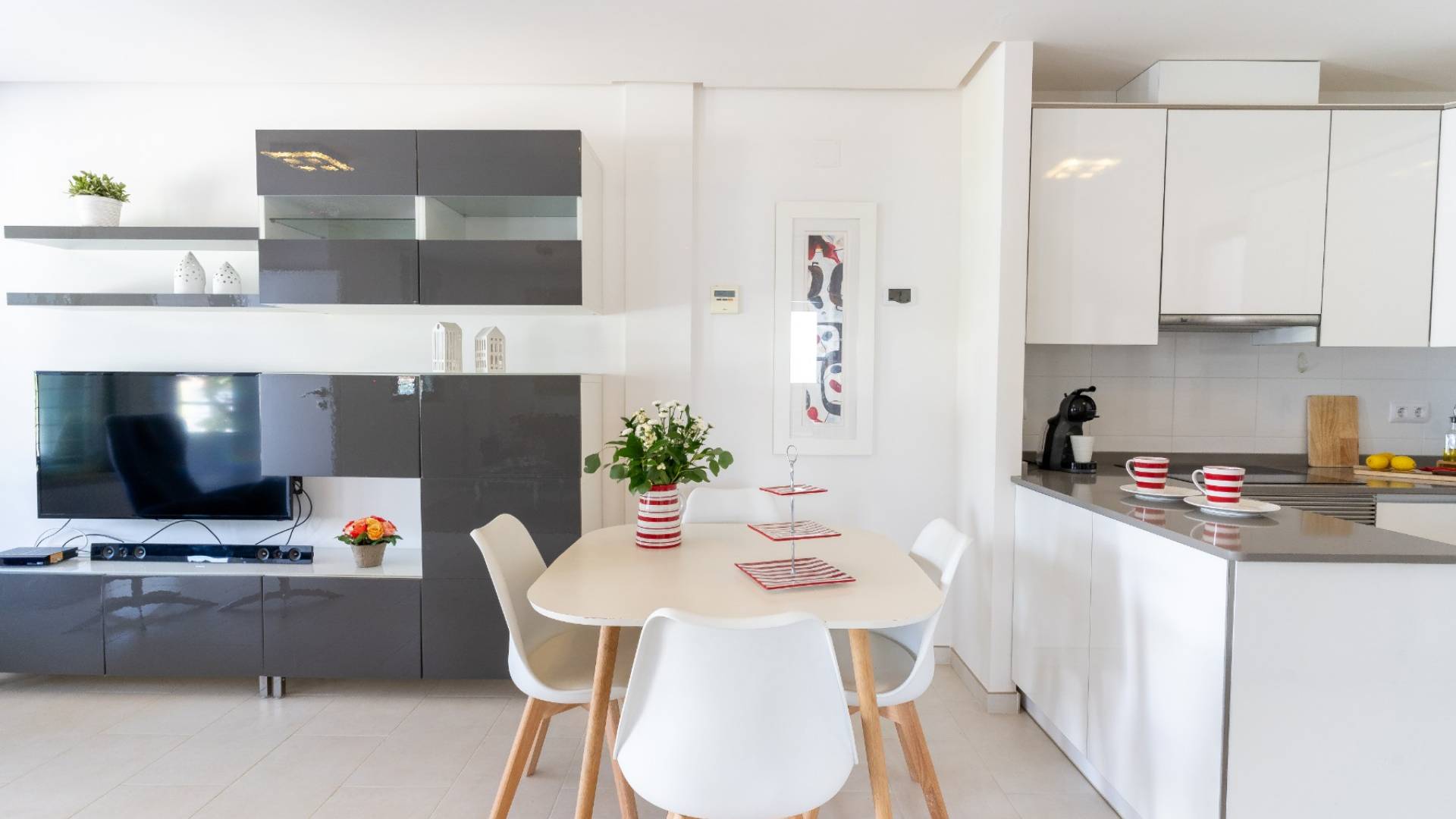 En el interior, la vivienda ofrece un diseño de concepto abierto que conecta el salón, el comedor y la cocina moderna con barra americana. El salón, ampliado tras abrir uno de los dormitorios, ofrece un espacio más amplio y acogedor, decorado con un elegante estilo escandinavo.