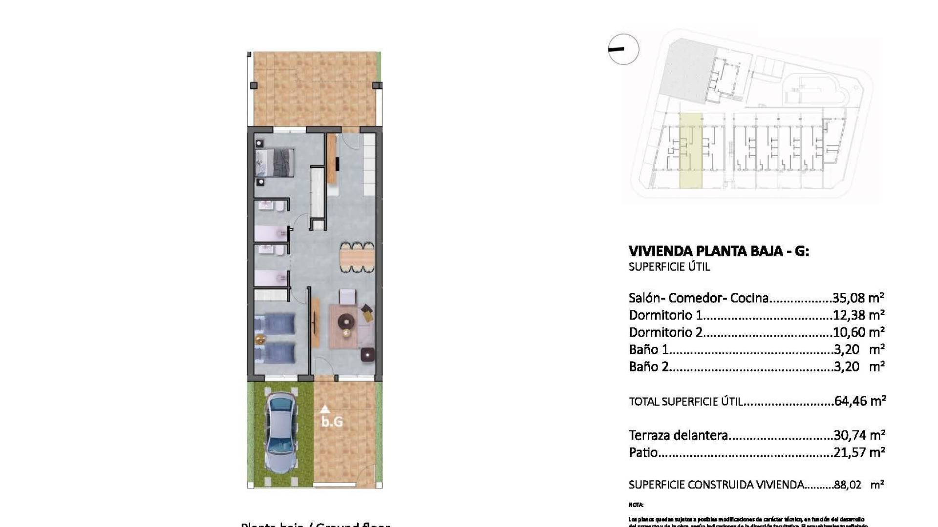 Exclusivos Bungalows de Obra Nueva en Pilar de la Horadada – Ubicación Privilegiada Un Residencial Único para Disfrutar del Mediterráneo Bienvenido a este exclusivo residencial de 16 bungalows y un adosado en esquina de 2 y 3 dormitorios, diseñados para quienes buscan calidad de vida y confort en la Costa Blanca. Ubicado a solo unos pasos del centro de Pilar de la Horadada, este moderno complejo ofrece un entorno tranquilo, con todas las comodidades al alcance. Las viviendas están diseñadas para maximizar el bienestar de sus propietarios: Plantas bajas con jardín delantero y patio trasero. Plantas altas con terraza privada y solárium con vistas espectaculares. Un adosado en esquina, con más amplitud y privacidad. El residencial cuenta con una amplia piscina comunitaria rodeada de zonas verdes, ideales para relajarse bajo el sol mediterráneo. Diseño Moderno y Acabados de Alta Calidad Cada vivienda ha sido cuidadosamente diseñada para ofrecer luminosidad, funcionalidad y estilo contemporáneo. Puerta de entrada acorazada para mayor seguridad. Cocina de concepto abierto, integrada en el salón para mayor comodidad. Baños modernos con platos de ducha e instalación de mamparas de vidrio templado. Preinstalación de aire acondicionado en salón y dormitorios. Producción de agua caliente mediante aerotermo individual para mayor eficiencia energética. Plantas altas con preinstalación de cocina exterior en los soláriums. Además, la urbanización dispone de zona de aparcamiento para bicicletas y una plaza de parking privada por vivienda. Pilar de la Horadada – Un Lugar para Vivir Todo el Año Situado en la provincia de Alicante, Pilar de la Horadada es un destino ideal para quienes buscan combinar tranquilidad, naturaleza y servicios de primer nivel. Sus hermosas playas, como la Playa de las Higuericas, se encuentran a pocos minutos, ofreciendo arena dorada y aguas cristalinas del Mediterráneo. Este residencial goza de una ubicación inmejorable, con acceso a supermercados, tiendas, restaurantes y espacios de ocio, todo a poca distancia a pie. La zona también cuenta con rutas de senderismo, carriles bici y una gran oferta deportiva. Distancias Claves a los Principales Puntos de Interés Playa de Torre de la Horadada – 3 km (5 min en coche). Campo de Golf Lo Romero – 5 km (10 min en coche). Centro Comercial La Zenia Boulevard – 15 km (15 min en coche). Aeropuerto de Corvera (Murcia) – 40 km (40 min en coche). Aeropuerto de Alicante – 55 km (55 min en coche). Reserve Hoy su Vivienda en la Costa Blanca No pierda la oportunidad de adquirir una vivienda de obra nueva en una ubicación inmejorable. Contáctenos hoy mismo para más información y para programar una visita.
