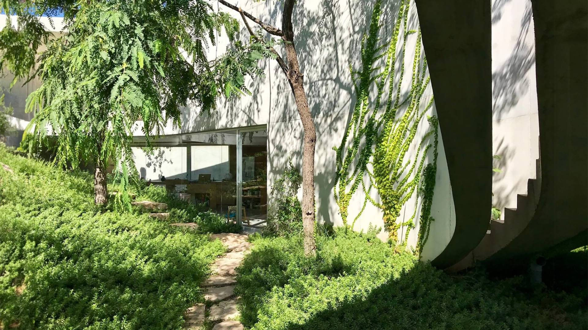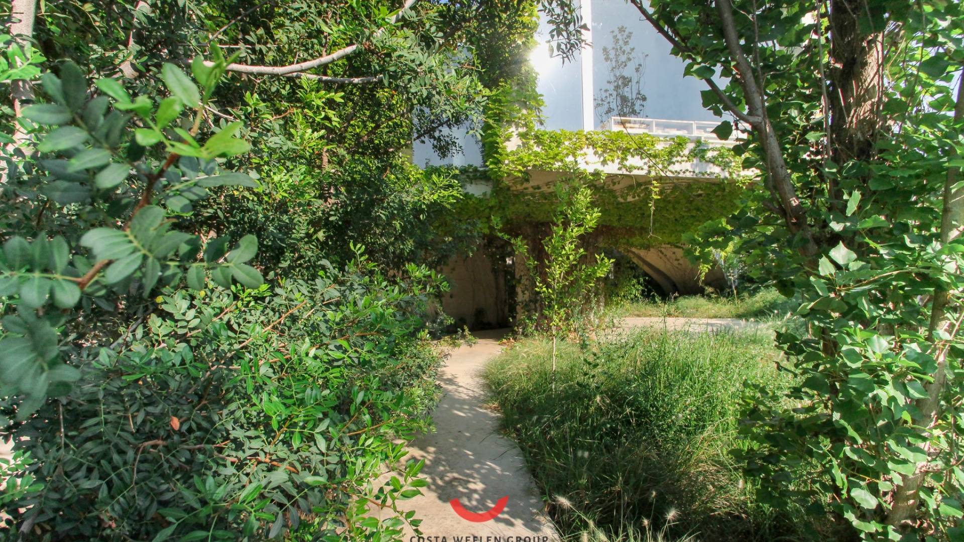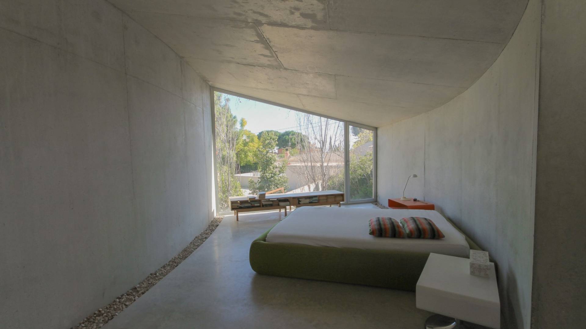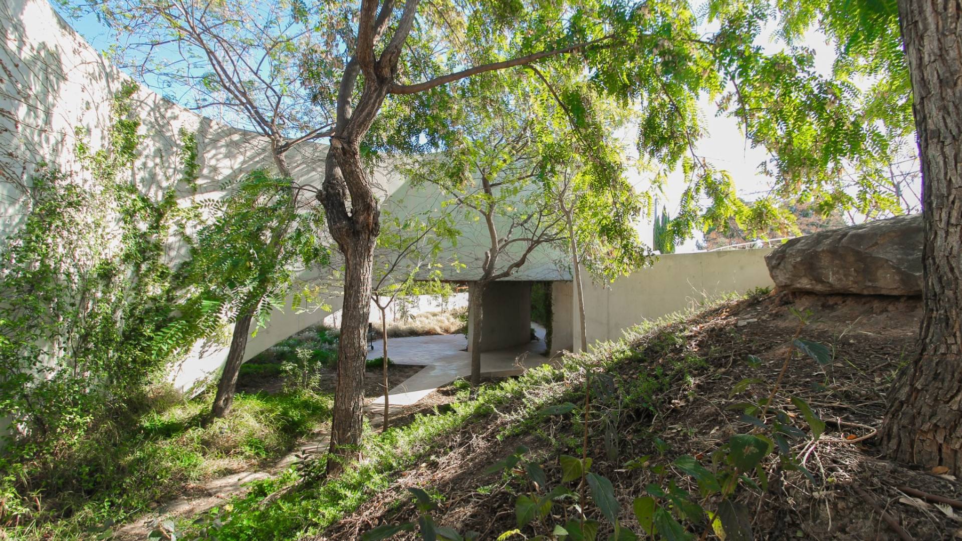 La arquitectura se adapta orgánicamente a los límites de la parcela, configurando su forma a través de muros que delinean el espacio y generan una conexión fluida entre el interior y el exterior. A través de una serie de patios, la distribución de los espacios se articula de manera natural, transformando la vivienda en un jardín habitable. Los muros de hormigón desnudo, en espera de ser conquistados por la vegetación, refuerzan esta fusión entre arquitectura y naturaleza.