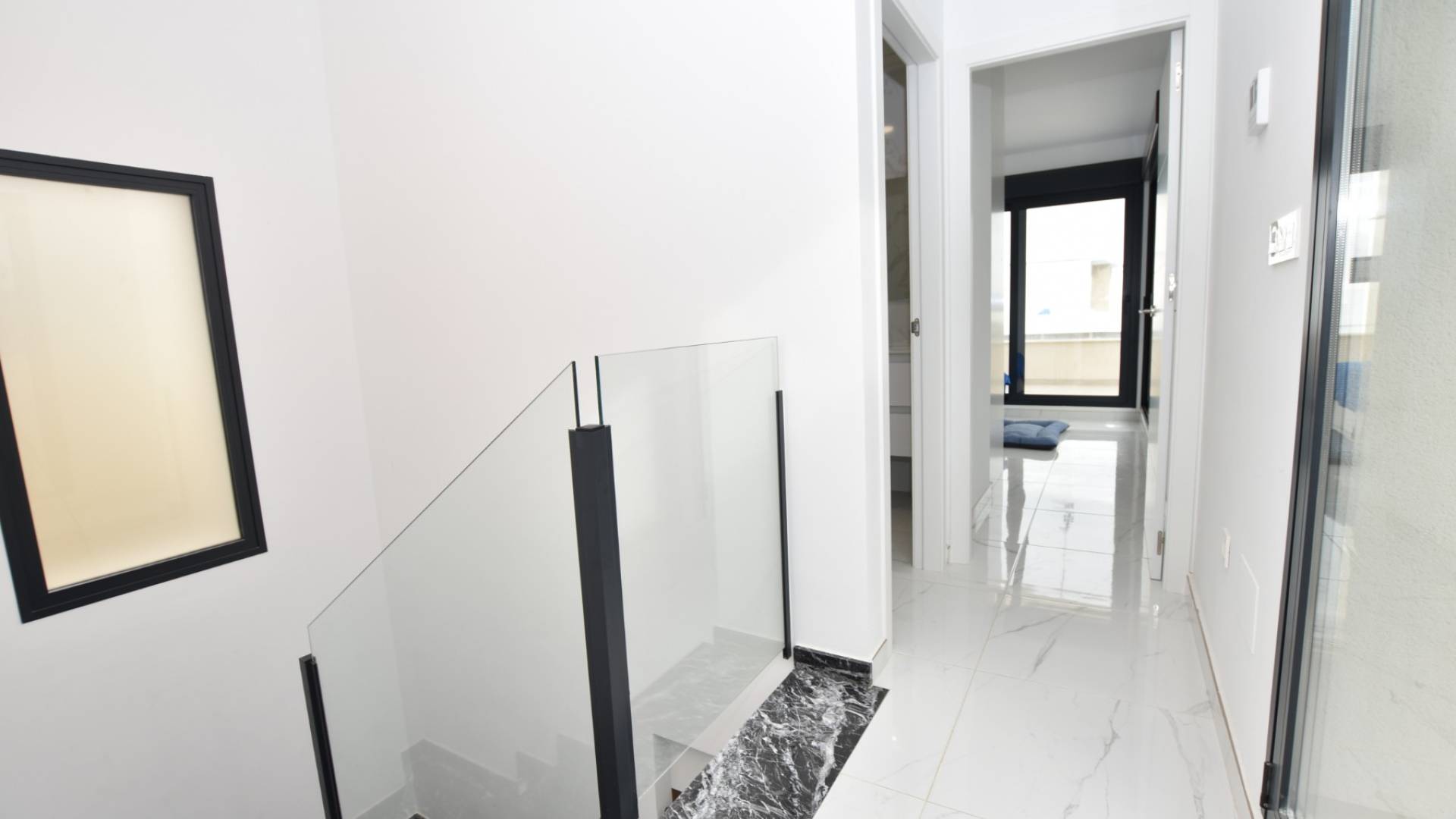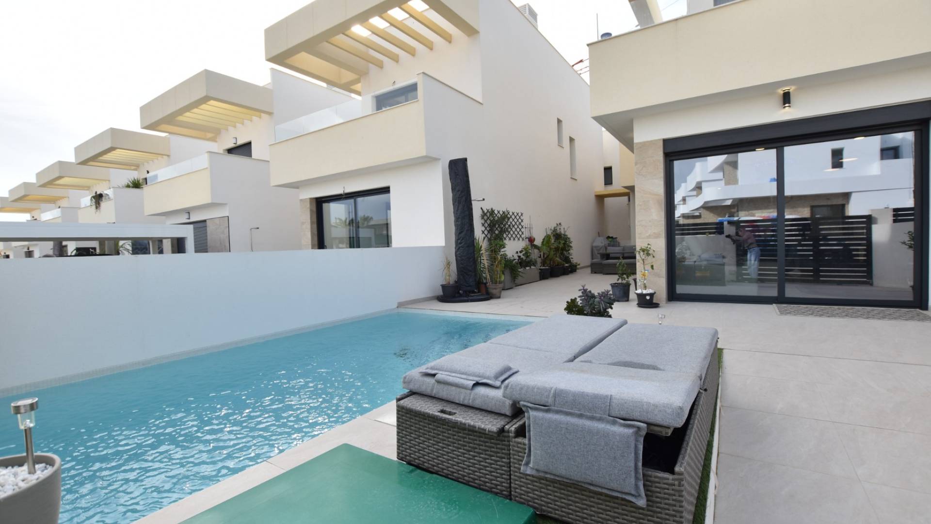 Villa independiente de estilo moderno, prácticamente nueva y finalizada en 2025, situada en la consolidada urbanización de La Herrada, en Los Montesinos. Una propiedad que destaca por su diseño contemporáneo, su funcionalidad y su excelente ubicación en la Costa Blanca. Desde la llegada a la vivienda, se aprecia su cuidada estética, con líneas limpias, piscina privada y aparcamiento dentro de la parcela, ofreciendo comodidad y privacidad. En el interior, la vivienda dispone de un amplio y luminoso espacio de concepto abierto que integra salón, comedor y cocina, creando un ambiente ideal tanto para el uso diario como para reuniones sociales. En esta misma planta se encuentra un aseo de cortesía. El dormitorio principal se sitúa en la planta baja, contando con vestidor y baño en suite con ducha, lo que permite una distribución muy cómoda para quienes buscan una vivienda con estancias principales en una sola planta. En la planta superior se encuentran dos dormitorios dobles, ambos con armarios empotrados y excelente entrada de luz natural, además de un baño familiar moderno. Desde esta planta se accede a una amplia terraza, perfecta para disfrutar del exterior. Desde la terraza, una escalera exterior conduce al solárium privado situado en la azotea. Este espacio ofrece amplias vistas abiertas al entorno natural, incluyendo vistas a las dos lagunas saladas, convirtiéndose en un lugar ideal para relajarse, tomar el sol o disfrutar de veladas al aire libre. La propiedad se vende con la mayor parte del mobiliario incluido y dispone de aire acondicionado en toda la vivienda, permitiendo su uso inmediato. La ubicación es excelente, con supermercado, bares y restaurantes a solo cinco minutos a pie. Las playas de Guardamar del Segura y Torrevieja se encuentran a unos quince minutos en coche, y Vistabella Golf está a aproximadamente diez minutos.