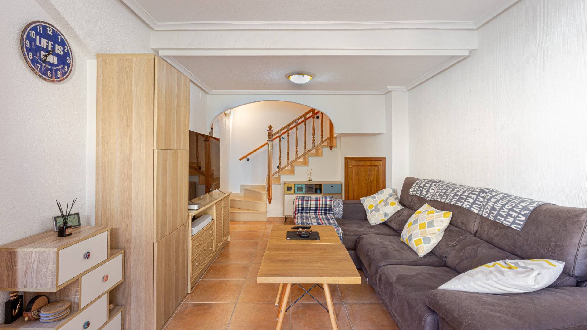 Esta casa adosada en venta de 86 m² se encuentra en El Mojón, una de las zonas costeras más tranquilas de Pilar de la Horadada, a solo 300 metros del mar, cerca de playas, del paseo marítimo y de parques, y rodeada de todos los servicios: supermercados, restaurantes, farmacias y zonas deportivas.La vivienda está distribuida en dos plantas y ofrece una excelente comodidad:Planta baja: amplio salón-comedor de 22 m², perfecto para disfrutar en familia; cocina independiente equipada; un dormitorio en esta planta con acceso cómodo; un baño completo; y un trastero ideal para almacenar bicicletas, material de playa o enseres. Además, cuenta con una terraza delantera para relajarse al aire libre.Primera planta: dispone de dos dormitorios luminosos, ambos con armarios empotrados que optimizan el espacio, un baño completo y una terraza privada con vistas despejadas.En la azotea se encuentra un solárium privado, perfecto para tomar el sol, crear una zona chill out o disfrutar de la brisa del mar.Gracias a su excelente ubicación, esta propiedad es ideal tanto como residencia habitual como para disfrutar de vacaciones en la Costa Blanca Sur. La cercanía al mar, al paseo marítimo y a zonas verdes la convierte en una gran oportunidad para quienes buscan vivir cerca de la playa con todos los servicios a mano.