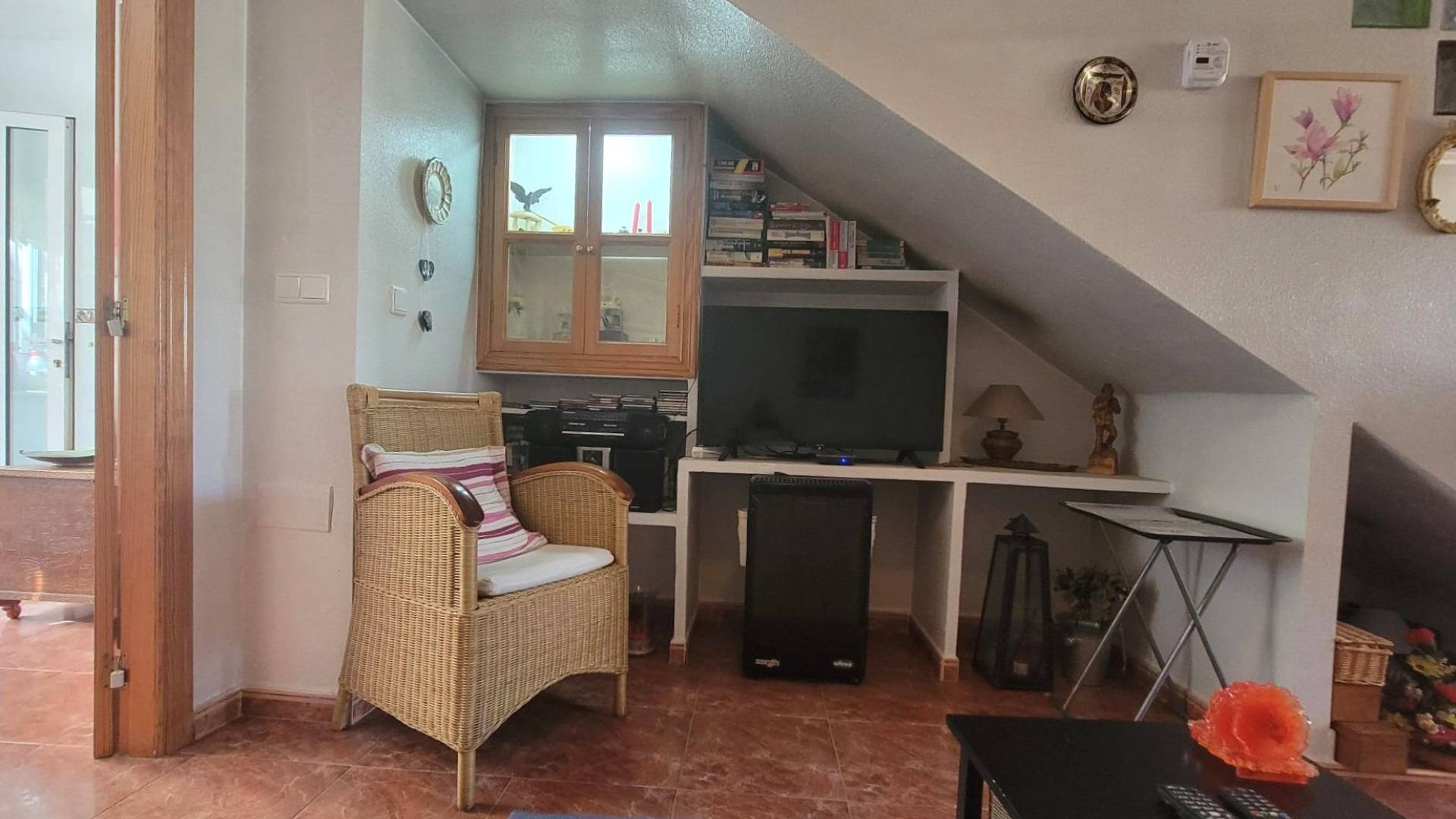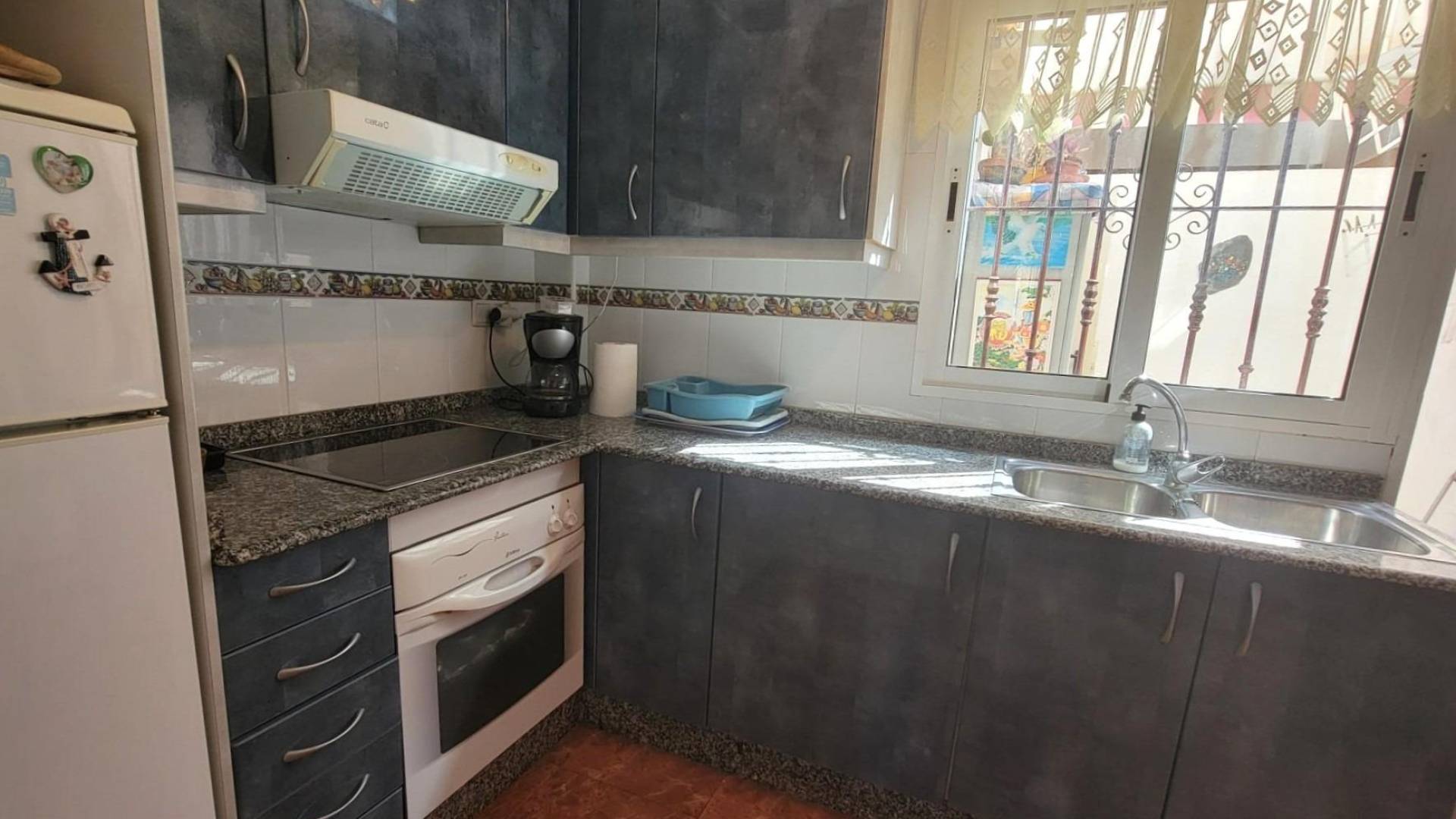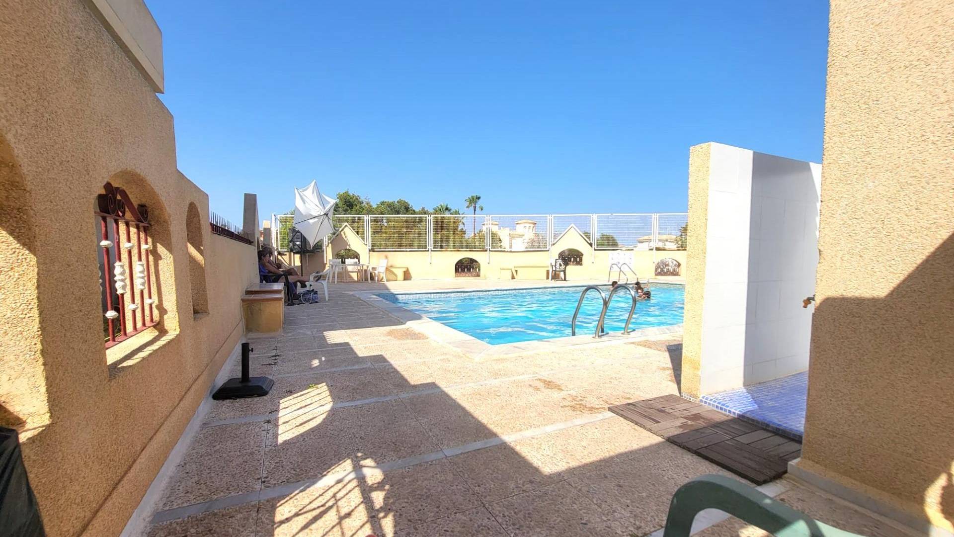 Gran vivienda adosada de 3 plantas en bonito residencial con una piscina y otra gran piscina climatizada con sauna, jardines, en Playa Flamenca a unos 5 minutos en coche de las playas y unos 30 minutos a pie del Centro Comercial Zenia Boulevard. Dispone de una gran terraza delantera, un amplio salón comedor con una chimenea, una cocina independiente totalmente equipada con salida a un patio privado con un lavadero y un cuarto de baño con un plató de ducha. La primera planta dispone de dos dormitorios dobles con armarios empotrados y un amplio cuarto de baño (con bañera). Desde el dormitorio principal, se accede a una terraza con vistas a la piscina. Y la última planta dispone de una buhardilla con un dormitorio doble y un cuarto de baño. El precio incluye también un gran garaje cerrado (unos 23 m2) con un trastero en el sótano comunitario. Vivienda amueblada. Aires acondicionados. En buen estado, listo para entrar a vivir. Todo ello ubicado en una zona agradable en Playa Flamenca, cerca de todos los servicios, comercios, supermercados, restaurantes, cafeterias, paradas de autobuses, etc... Además, allí cerca está el popular mercadillo de Playa Flamenca que se celebra todos los sábados por las mañanas, perfecto para pasar la mañana entre compras, tapas y buen ambiente.