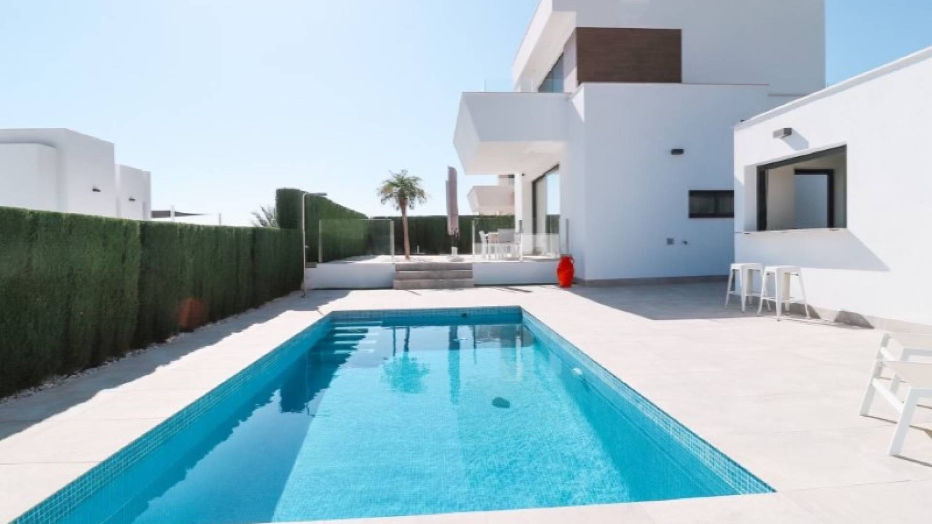 Esta es realmente una bonita casa con un diseño moderno, la casa está ubicada en Polop y tiene una vista absolutamente fantástica del Mediterráneo y las montañas cercanas.Esta magnífica propiedad es casi nueva, fue construida en 2017.La casa está construida con altos estándares en mente y tiene 3 dormitorios, 3 baños con calefacción por suelo radiante y un lavadero. Un dormitorio y un baño están en la planta baja.La sala de estar y la cocina en una sala de estar de planta abierta con acceso directo a la zona del jardín.En el jardín hay una hermosa piscina y un bar en la piscina, la piscina también se puede calentar si le gusta el agua tibia durante el período invernal.Las células solares están instaladas en el techo, por lo que la casa es casi autosuficiente en electricidad.Polop es una ciudad situada en la provincia de Alicante, España. Es una metrópoli en la Comacra de la Marina Baixa en Alicante. Se encuentra al noreste de la provincia de Alicante y limita con la Callosa d'en Sarrià asistida por el río Guadalest. Entre los accidentes geológicos importantes de la ciudad se encuentran la Sierra del Monte Ponoig y sus barrancos. Estos fluyen hacia el este.Polop es un pequeño y encantador pueblo español, muchos extranjeros viven aquí, junto con muchos españoles. La ciudad tiene un ambiente estupendo y agradable con una vista preciosa. Se puede acceder a la ciudad a través de la AP-7 o la N-332 desde Alicante, tomando la ruta CV-70 hasta Benidorm. La principal fuente de ingresos de la mayoría de los habitantes de Polop es la agricultura. Las almendras y los olivos se encuentran entre los principales cultivos. Además, los cítricos y los caquis también son una gran parte de la agricultura. ref:VIL_2