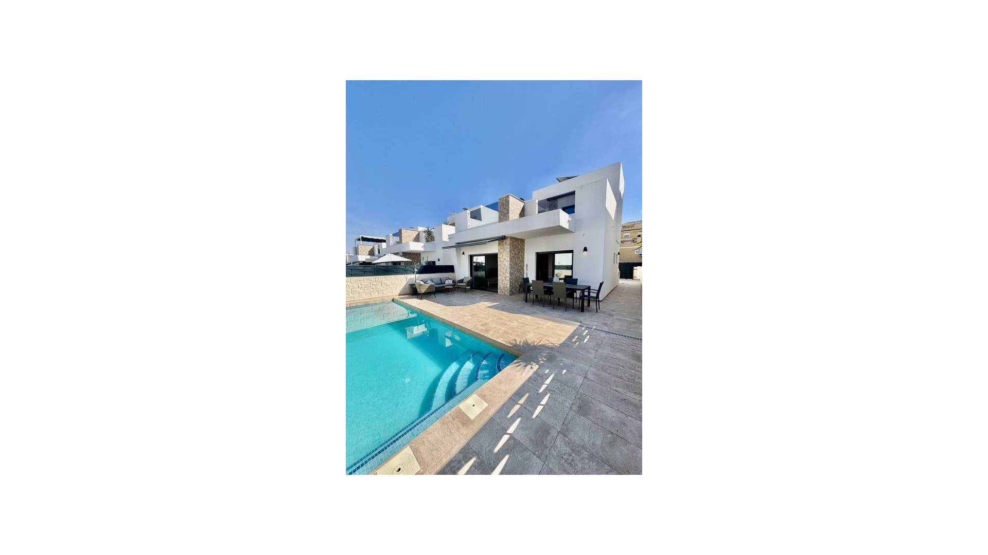 Descubra la vida de lujo en la Costa Blanca con esta hermosa villa moderna en Benijófar. Ubicada cerca del centro, esta propiedad combina la elegancia contemporánea con la vida al aire libre y las impresionantes vistas a la montaña, perfecta como vivienda permanente, refugio vacacional o inversión para alquiler.Características:Amplio y luminoso interior con 2 dormitorios y 2 baños (posibilidad de un 3er dormitorio)Piscina privada y múltiples terrazas para la relajación y el entretenimiento.Cocina exterior totalmente equipada para comer al aire libre.Vistas panorámicas a la montaña desde la terraza de la azotea.Plazas de aparcamiento privadas y cómodas zonas de almacenamiento.Esta villa ofrece la combinación perfecta de comodidad, estilo y ubicación. Disfrute de la soleada vida al aire libre, la tranquilidad de la naturaleza y la proximidad a tiendas, restaurantes y servicios locales.¡Programe una visita hoy y experimente usted mismo el estilo de vida lujoso que esta villa tiene para ofrecer!