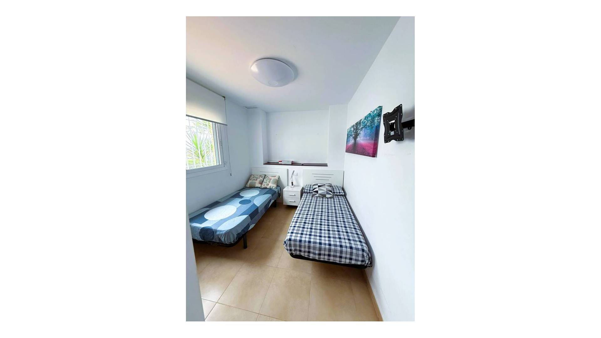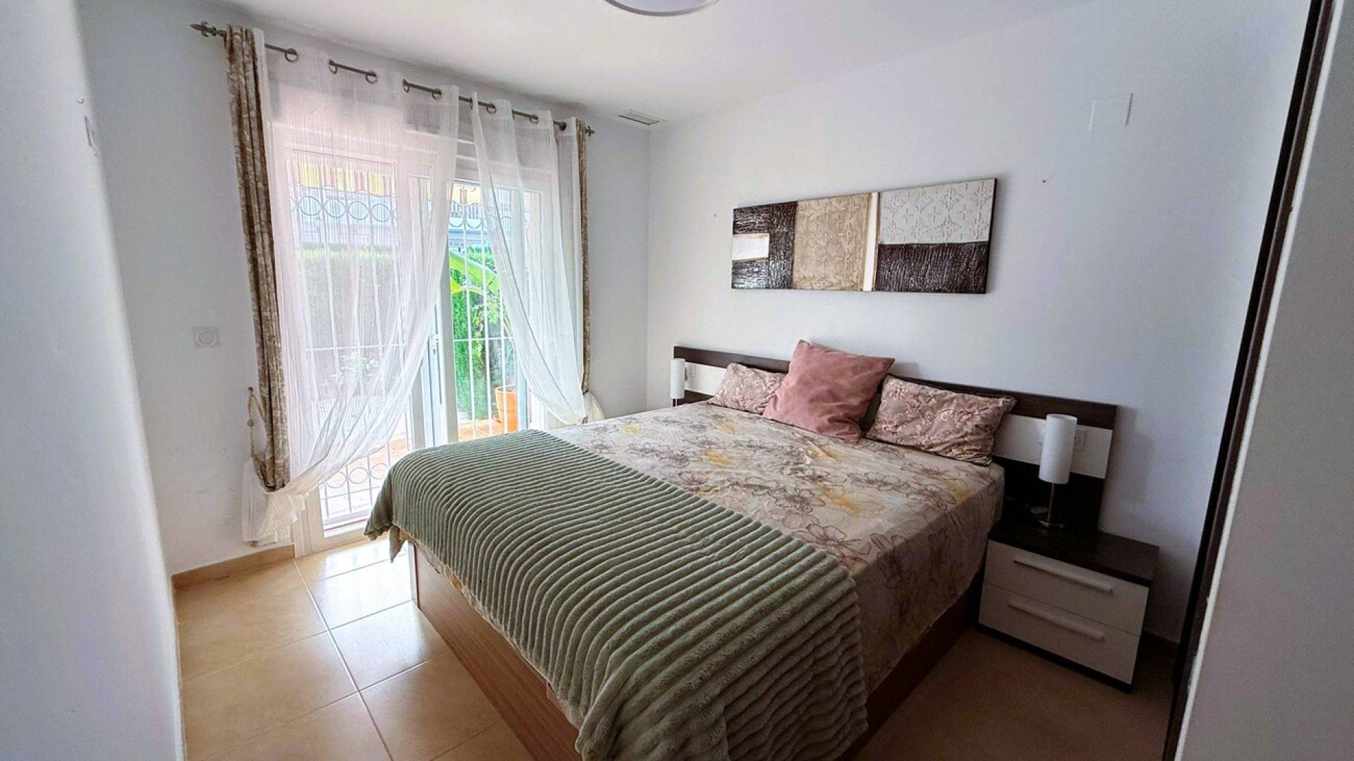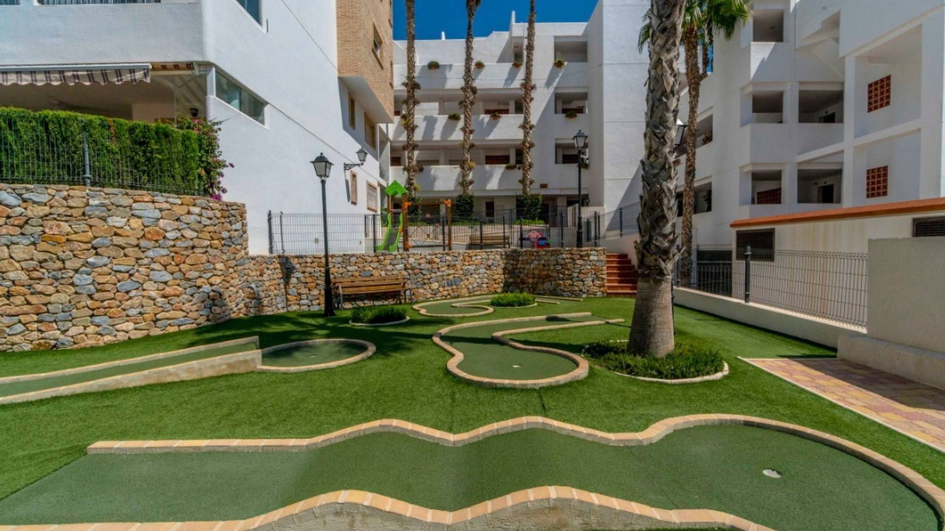 Este apartamento en planta baja consta de tres dormitorios, dos baños y un salón con cocina americana. Desde el salón tenemos entrada a la terraza con jardín. Junto a la cocina hay un lavadero/trastero. La propiedad se vende amueblada, con electrodomésticos y aire acondicionado por conductos. El complejo cerrado tiene un parking para los residentes. El complejo ofrece una gran piscina, jacuzzi y zonas verdes. Está cerca de los centros comerciales La Fuente y Villamartín Plaza, varios supermercados, bares y restaurantes.