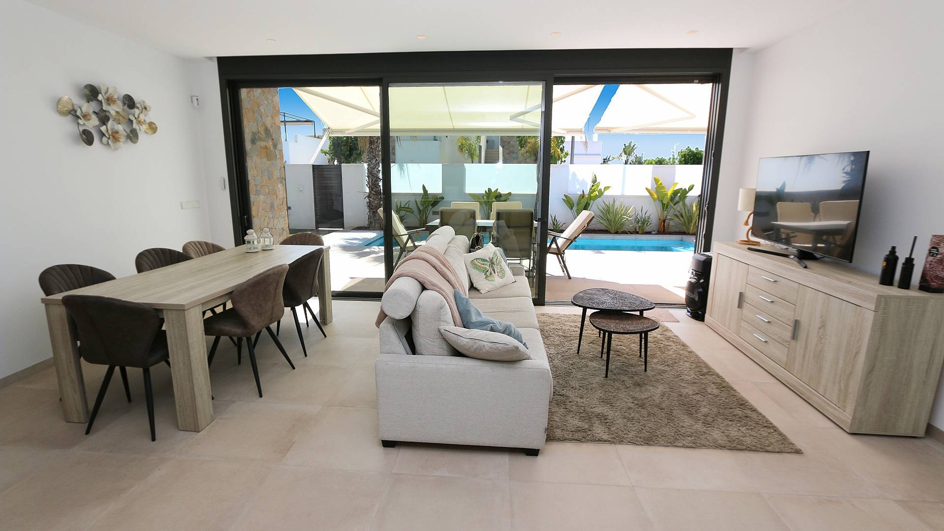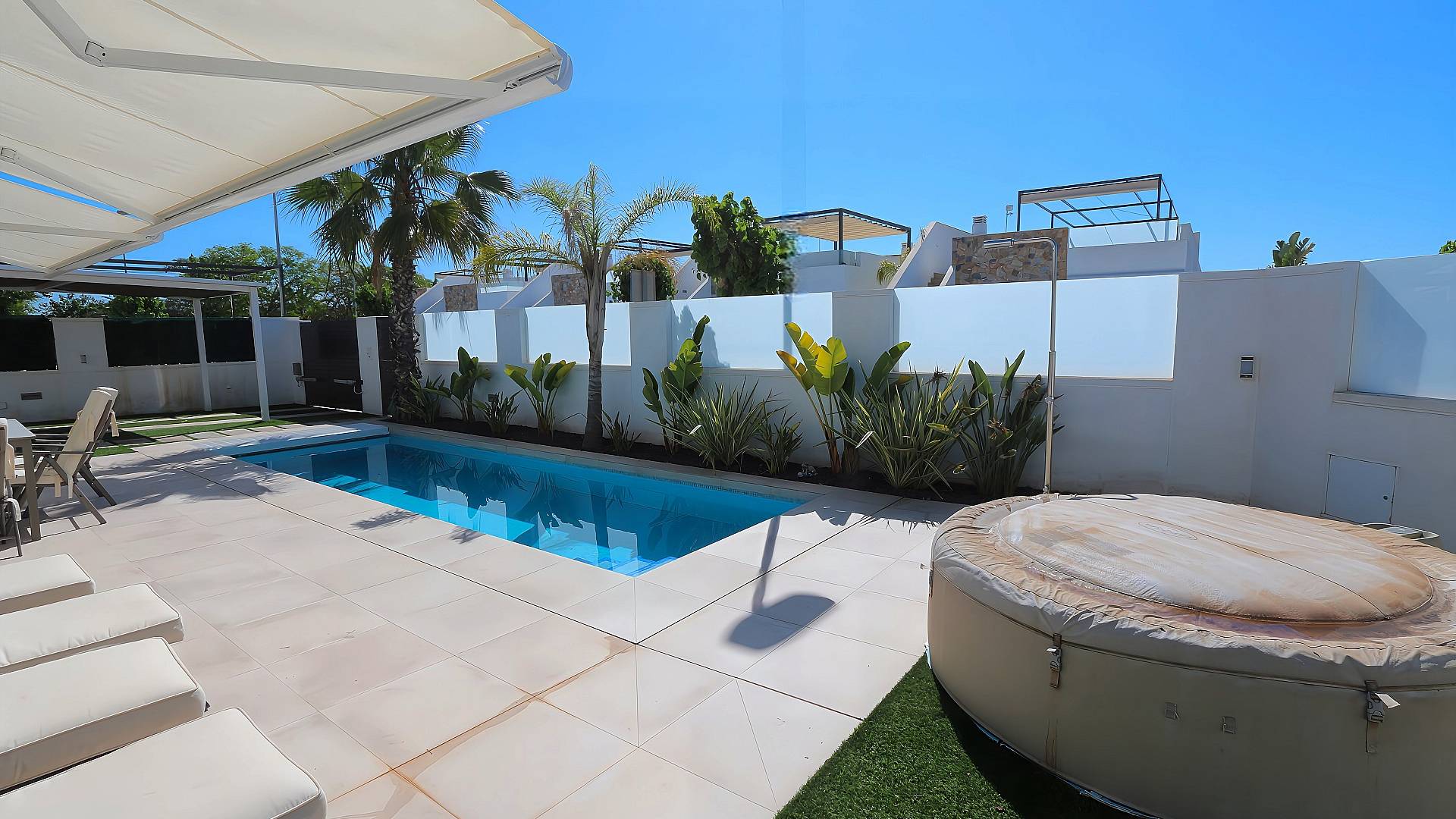 . Lujosa villa bungalow independiente – ¡lista para entrar a vivir y disfrutar del sol! ¿Buscas comodidad, estilo y privacidad? ¡Entonces esta villa bungalow independiente con 3 dormitorios y 2 baños es perfecta para ti! Situada en la tranquila parte exterior de la urbanización, disfrutarás del sol durante todo el día .La villa está impecablemente decorada y se vende completamente amueblada – ¡solo tienes que hacer las maletas y empezar a disfrutar! En el interior encontrarás una cocina moderna equipada con electrodomésticos Siemens de alta gama, y en el exterior te espera una piscina privada climatizada.¿Extras? ¡Por supuesto! Puerta de acceso eléctrica, toldo eléctrico, carport y un jardín de bajo mantenimiento. Todo pensado para ofrecerte la máxima comodidad.Características destacadas:3 amplios dormitorios2 elegantes bañosCocina equipada con electrodomésticos SiemensPiscina privada climatizadaPuerta de acceso eléctrica y toldo eléctricoCarportSe vende completamente amuebladaUbicación soleada y tranquilaEsta villa es ideal como segunda residencia de lujo o para vivir todo el año. ¡Ven a verla pronto, oportunidades como esta no duran mucho!¿Interesado/a? ¡Contáctanos para una visita!