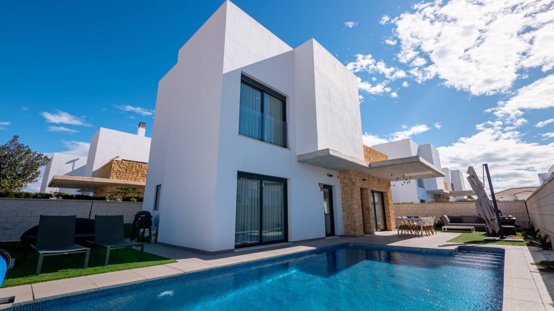 ???? En Venta en Exclusiva: Moderna Villa Orientada al Suroeste en Ciudad QuesadaUbicaciónRodeada de pintorescos campos de limoneros, esta impresionante villa moderna está perfectamente situada cerca de todas las comodidades de Ciudad Quesada, a tan solo 6 km del mar. Disfruta de la tranquilidad de la naturaleza estando a pocos minutos de tiendas, restaurantes y todos los servicios esenciales.Características DestacadasHermosas vistas desde la azotea hacia el mar, las salinas y el paisaje circundantePersianas eléctricas en toda la vivienda para mayor confort y seguridadAmplia piscina privada climatizadaAcogedor jardín que rodea la villaPlaza de aparcamiento privadaDistribuciónPlanta BajaLuminoso y amplio salón con abundante luz natural y acceso directo al jardín y la zona de piscinaCocina abierta y totalmente equipada con electrodomésticos Bosch de alta calidad1 dormitorio convenientemente situado en la planta baja1 baño completoLavandería y espacio de almacenamientoPrimera Planta2 amplios dormitorios, uno de ellos con acceso a una gran terraza orientada al sur1 baño completoDesde la terraza, una escalera conduce al solárium en la azotea, un lugar perfecto para relajarse con tumbonas y disfrutar de las vistas panorámicas al mar y a las salinasOtras CaracterísticasCuarto de almacenamiento y lavandería con puerta trasera de seguridadPiscina climatizada, ideal para disfrutar durante todo el añoPersianas eléctricas en toda la viviendaAparcamiento privadoDescripciónEsta moderna y elegante villa combina lujo, confort y funcionalidad en un solo espacio. El salón con cocina abierta equipada con electrodomésticos Bosch ofrece un ambiente cálido y acogedor. Con tres dormitorios y dos baños, su distribución es ideal tanto para familias como para quienes buscan comodidad y sofisticación.Vive el auténtico estilo de vida mediterráneo, con terrazas bañadas por el sol, una piscina privada climatizada y vistas tranquilas — todo ello a poca distancia de los animados servicios de Ciudad Quesada y de las hermosas playas de la Costa Blanca.ContactoPara más información o para concertar una visita, contacta con nuestro equipo de ventas.Estaremos encantados de responder a tus preguntas y organizar una visita privada.