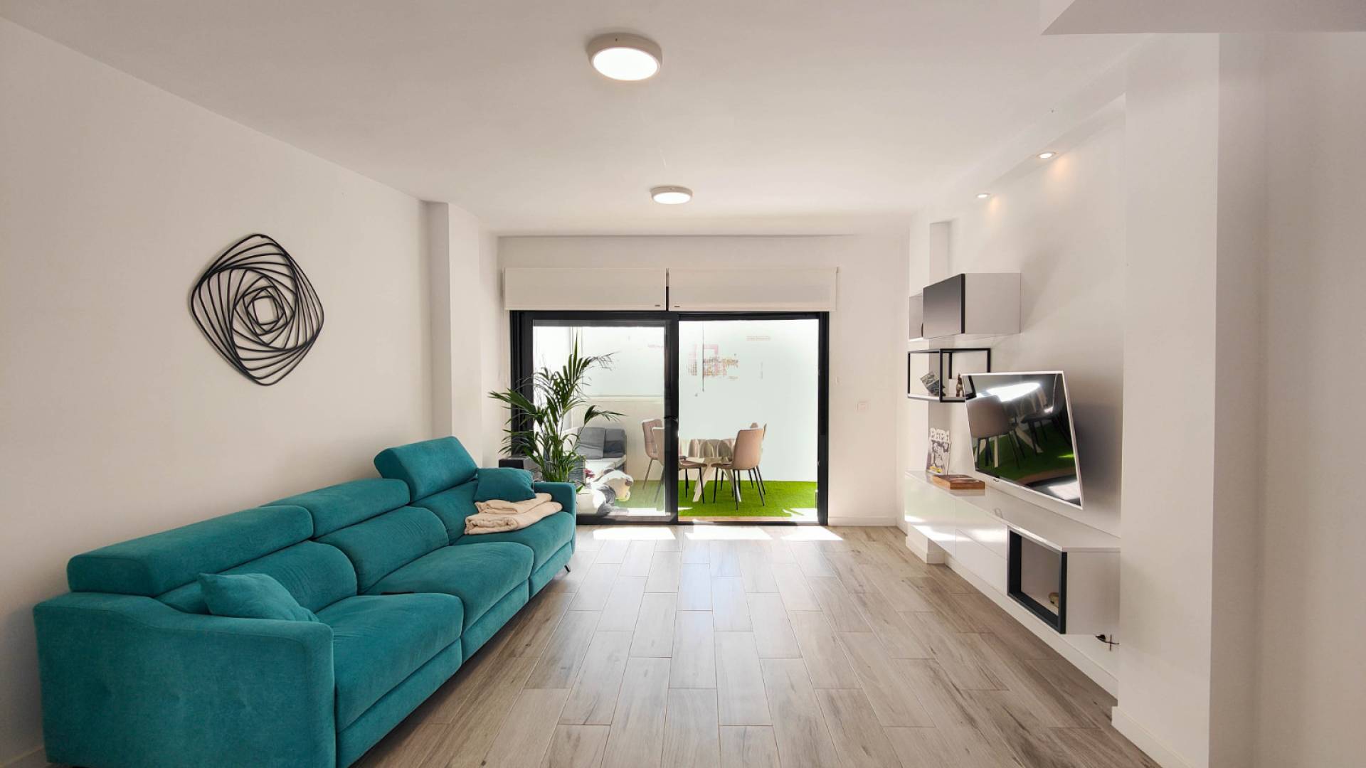 Descubre este moderno apartamento en planta baja construido en 2019, luminoso y diseñado para disfrutar del estilo de vida mediterráneo. Con 3 amplios dormitorios y 2 baños, todos los dormitorios cuentan con armarios empotrados, ofreciendo gran capacidad de almacenamiento. La cocina de alta calidad está equipada con encimera de silestone e isla central, perfecta para cocinar y compartir momentos en familia. El suelo porcelánico con imitación madera aporta elegancia y calidez a cada espacio. El apartamento dispone de aire acondicionado por conductos para garantizar confort durante todo el año. Se vende parcialmente amueblada. Uno de sus grandes atractivos es la terraza acristalada de unos 8 m² orientada al sur, con césped artificial, desde donde se disfruta de vistas a la piscina comunitaria. Desde esta terraza se accede directamente al garaje privado y cerrado, ubicado justo debajo de la vivienda, lo que añade comodidad y seguridad. Además, cuenta con una espectacular terraza de unos 70 m² que rodea el apartamento, ideal para relajarse, tomar el sol o crear diferentes zonas de ocio al aire libre. La vivienda se encuentra a solo 900 metros de la playa, en una ubicación privilegiada. Este apartamento es una oportunidad única para quienes buscan calidad, espacio y cercanía al mar.