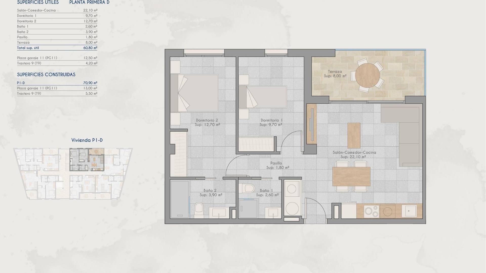 Apartamentos de nueva construcción en venta en Lo Pagan (San Pedro del Pinatar) cerca de la playa Vida mediterránea moderna en Lo Pagan Descubra estos elegantes apartamentos de nueva construcción en venta en Lo Pagan, una encantadora zona costera dentro de San Pedro del Pinatar, en la hermosa Costa Cálida. Situada en el conocido barrio de Los Cuarteros, esta promoción residencial ofrece un estilo de vida privilegiado a solo 500 metros de la playa y cerca de todos los servicios esenciales, restaurantes, tiendas y zonas de ocio. Lo Pagan es famosa por su relajado ambiente costero, las tranquilas aguas del Mar Menor y más de 300 días de sol al año. La zona combina el encanto tradicional español con las comodidades modernas, lo que la convierte en un destino ideal tanto para vivir como para pasar las vacaciones. Apartamentos contemporáneos con terrazas y soláriums privados La promoción ofrece una selección de apartamentos en planta baja y planta intermedia con amplias terrazas, así como exclusivos áticos con soláriums privados en la azotea. Los soláriums incluyen una pérgola y una zona de barbacoa, lo que crea el entorno perfecto para comer al aire libre y relajarse bajo el sol del Mediterráneo. Cada propiedad ha sido diseñada para combinar la arquitectura contemporánea con el cálido estilo mediterráneo. La cocina abierta se integra a la perfección con el salón y el comedor, creando espacios luminosos y confortables. Las amplias terrazas amplían las zonas interiores y son el lugar perfecto para desayunar al aire libre o celebrar reuniones por la noche. Los dormitorios cuentan con armarios empotrados y los modernos cuartos de baño están totalmente equipados, ofreciendo comodidad y elegantes acabados en toda la vivienda. Características de calidad e instalaciones comunitarias Estas viviendas se han construido prestando atención a los detalles e incluyen especificaciones de alta calidad para garantizar el confort y la eficiencia. Cocina totalmente amueblada y equipada con electrodomésticos Baños completamente equipados con acabados modernos Aire acondicionado por conductos totalmente instalado Plaza de aparcamiento privada y trastero incluidos en cada propiedad Los residentes también pueden disfrutar de excelentes instalaciones comunitarias, como una piscina rodeada de zonas de relax y un gimnasio totalmente equipado, ideal para mantener un estilo de vida activo durante todo el año. Excelente ubicación en la Costa Cálida Esta promoción goza de una ubicación estratégica cerca de playas, campos de golf y destinos clave a lo largo de la costa. Playa de Villananitos 0,5 km Real Club Náutico de Lo Pagán 0,5 km Lo Romero Golf 10 km Aeropuerto Internacional de Murcia 40 km Cartagena 35 km Las playas cercanas del Mar Menor, como la Playa de La Puntica, son conocidas por su arena fina y sus aguas tranquilas, ideales para nadar, navegar y practicar deportes acuáticos. Su nueva casa junto al mar le espera Disfrute del sol, las playas y un vibrante estilo de vida costero en una de las zonas más codiciadas de la Costa Cálida. Póngase en contacto con nosotros hoy mismo para obtener más información sobre estos apartamentos de nueva construcción en Lo Pagán y asegúrese su lugar junto al mar.