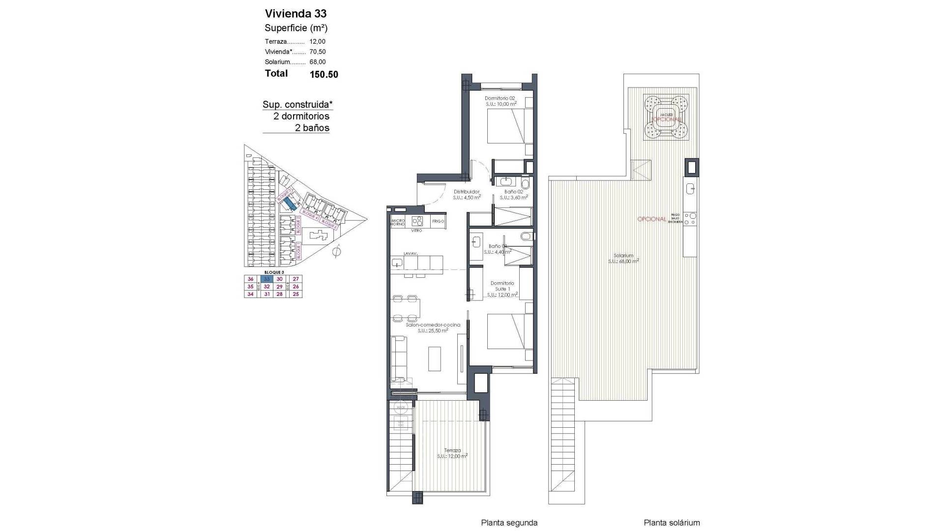 Apartamentos de nueva construcción en La Serena Golf-Los Alcázares, cerca de la playa Vida moderna frente al campo de golf en la Costa Cálida Descubra este exclusivo complejo residencial de nueva construcción situado en La Serena Golf, en Los Alcázares. Esta urbanización contemporánea cuenta con 66 elegantes apartamentos de 2 o 3 dormitorios y 2 baños, uno de ellos en suite, diseñados para ofrecer comodidad, elegancia y un excepcional estilo de vida mediterráneo a solo 300 metros del Mar Menor. Los Alcázares es una encantadora localidad costera conocida por su ambiente relajado, sus playas de arena y su largo paseo marítimo. Con más de 300 días de sol al año, la zona ofrece un entorno perfecto para la vida al aire libre, los deportes acuáticos y el golf. La localidad también cuenta con una amplia selección de restaurantes, tiendas, puertos deportivos e instalaciones deportivas, lo que la convierte en un destino muy deseable tanto para la residencia permanente como para las vacaciones. Apartamentos con terrazas, jardines y soláriums privados El complejo residencial ofrece varios tipos de propiedades que se adaptan a diferentes estilos de vida. Los compradores pueden elegir entre apartamentos en planta baja con jardines privados, viviendas en plantas intermedias con amplias terrazas o áticos con terrazas y grandes soláriums en la azotea. Los soláriums incluyen una ducha exterior y ofrecen la opción de añadir una cocina de verano y un jacuzzi privado, creando un espacio ideal para relajarse y divertirse mientras se disfruta de las vistas abiertas al campo de golf y al paisaje circundante. Cada vivienda ha sido diseñada con interiores luminosos y espacios diáfanos que conectan a la perfección con las zonas exteriores. Servicios estilo resort y zonas comunes excepcionales Una de las características más distintivas de esta promoción es su concepto de estilo resort. Los residentes pueden disfrutar de una espectacular piscina estilo laguna de aproximadamente 190 m2 con acceso estilo playa y zonas de relax con camas balinesas. Las instalaciones comunes adicionales incluyen jardines paisajísticos, una zona de spa, gimnasio y sauna situados en el sótano. El complejo también ofrece un parque infantil, dos pistas de petanca y aseos comunes cerca de la zona de la piscina, creando un ambiente acogedor para los residentes y los invitados. Acabados de calidad y características modernas Los apartamentos están construidos con materiales modernos y especificaciones de alta calidad diseñadas para ofrecer comodidad y estilo. Cocina totalmente equipada con electrodomésticos de acabado en cristal blanco Baños con tocadores, mamparas de ducha y espejos retroiluminados Persianas motorizadas Paquete de iluminación básico Aire acondicionado por conductos totalmente instalado Plaza de aparcamiento subterráneo para cada propiedad Aparcamiento subterráneo para bicicletas y trasteros opcionales Ubicación privilegiada cerca de la playa y el golf Playa del Mar Menor a 0,3 km Golf La Serena junto a la urbanización Centro de Los Alcázares a 2 km Cartagena a 22 km Murcia a 40 km Aeropuerto Internacional de la Región de Murcia a 30 km Aeropuerto de Alicante-Elche a 90 km Las tranquilas y poco profundas aguas del Mar Menor son ideales para nadar, navegar y practicar paddle surf durante todo el año. Asegure su vivienda en La Serena Golf Resort Estos modernos apartamentos combinan la vida junto a la playa, vistas al campo de golf desde la mayoría de las unidades y comodidades estilo resort en una de las zonas más atractivas de la Costa Cálida. Póngase en contacto con nosotros hoy mismo para recibir más información o concertar una visita y asegurar su nueva vivienda en La Serena Golf-Los Alcázares.