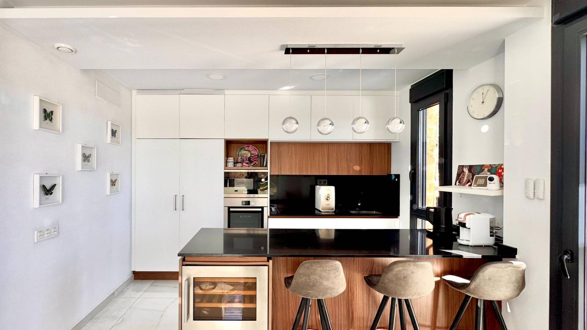 villa independiente moderna construida en 2021, lista para entrar a vivir y completamente amueblada, situada en una zona tranquila y soleada cerca de la playa y de todos los servicios. esta elegante vivienda combina espacio, luz y confort y es ideal tanto para vivir todo el año como para disfrutarla como segunda residencia en la costa blanca. la villa cuenta con 285 m² construidos y 185 m² útiles, distribuidos en dos plantas más un amplio sótano. en el interior encontramos cuatro dormitorios y cuatro baños, con una distribución moderna y abierta y grandes ventanas panorámicas que aportan mucha luz natural. en el exterior se puede disfrutar de un jardín privado con piscina, varias terrazas y un precioso solárium en la azotea con jacuzzi. gracias a su orientación sur la vivienda disfruta de sol durante casi todo el día. la propiedad también dispone de aire acondicionado, calefacción eléctrica individual, armarios empotrados, trastero y plaza de aparcamiento privada. los paneles solares aportan mayor eficiencia energética y reducen los costes de electricidad. la ubicación es ideal: la playa se encuentra a solo cinco minutos en coche, supermercados a cinco minutos y un centro comercial a unos diez minutos. el aeropuerto de alicante está a aproximadamente 45 minutos. una villa moderna y confortable, perfecta para disfrutar del estilo de vida mediterráneo.