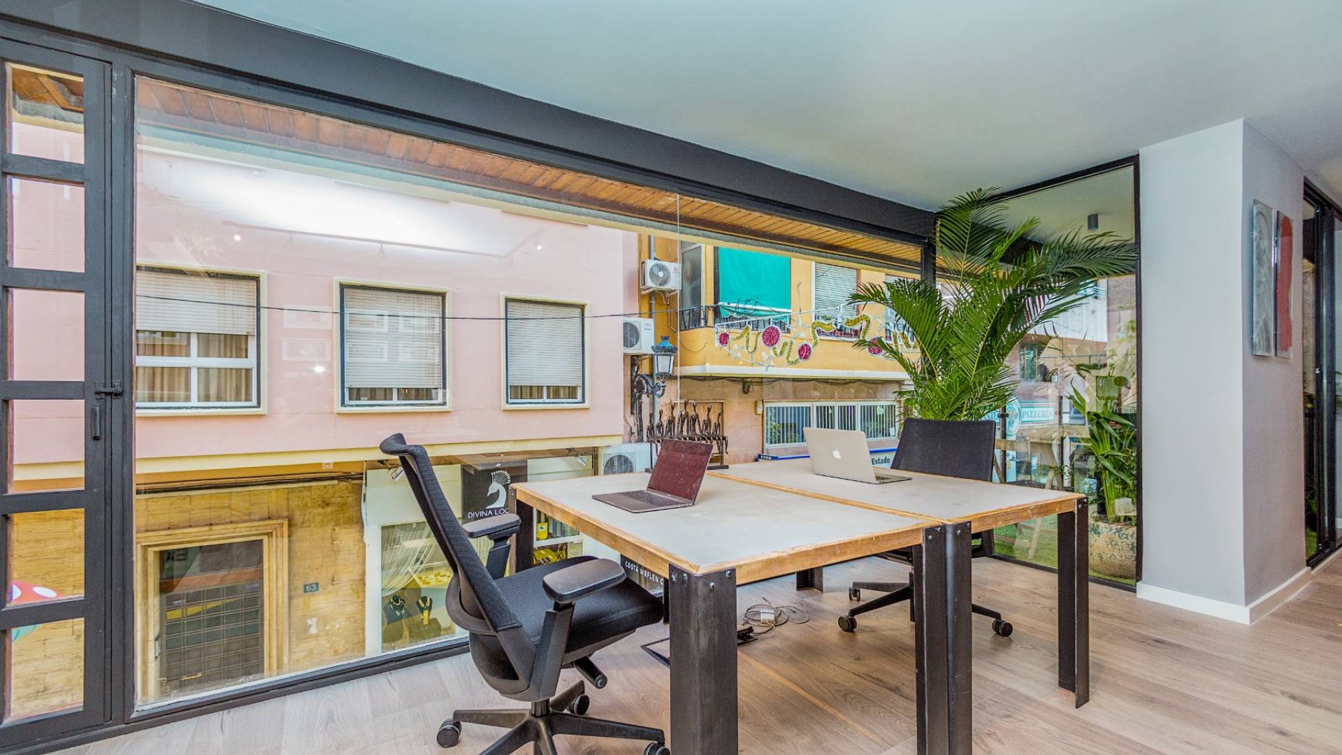 Los grandes ventanales proporcionan abundante luz natural y vistas a la Calle San Francisco y Calle Barón de Finestrat, creando un entorno de trabajo atractivo en pleno centro de Alicante.