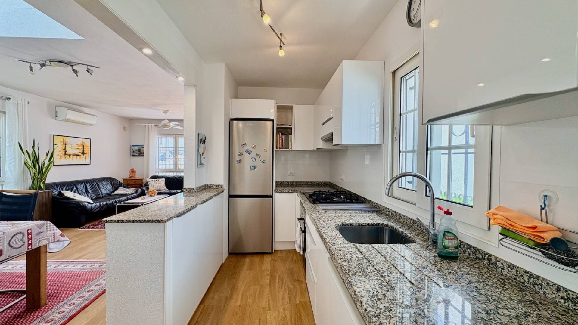 Descubre esta encantadora vivienda tipo “Carmen” situada en el exclusivo conjunto residencial “Rioja”, en la prestigiosa zona de Villamartín Golf, una de las áreas más valoradas de Orihuela-Costa. La propiedad, orientada al sur, destaca por su luminosidad y su excelente distribución. Cuenta con una superficie construida de 102,75 m² distribuidos en planta baja y buhardilla, ofreciendo espacios cómodos y versátiles. En la planta baja dispone de dos dormitorios y un baño completo, además de varias estancias funcionales y acceso mediante escalera interior a la planta superior. La buhardilla alberga un tercer dormitorio con baño en suite, ideal como zona privada, dormitorio principal o espacio independiente para invitados. En el exterior, la vivienda ofrece todo lo necesario para disfrutar del clima mediterráneo: una terraza, un amplio jardín privado de más de 140 m² y un fantástico solárium perfecto para relajarse o tomar el sol durante todo el año. Desde la vivienda se puede apreciar el Mar Mediterráneo en el horizonte, un valor añadido que aporta aún más encanto al entorno. La vivienda se vende completamente amueblada y equipada con electrodomésticos, lista para entrar a vivir. Además, dispone de calefacción central de gas y aire acondicionado en ambas plantas, garantizando el máximo confort en cualquier época del año. El residencial cuenta también con piscina comunitaria, ideal para disfrutar en familia. La ubicación es simplemente inmejorable: a menos de 5 minutos encontrarás todo tipo de servicios, como restaurantes, bares y supermercados. Para los amantes del golf, la zona ofrece hasta cuatro campos cercanos, incluyendo el reconocido Campo de Golf Villamartín. Y en menos de 10 minutos en coche podrás llegar a las hermosas playas de la Costa Blanca. Vivir en Villamartín significa disfrutar de sol, tranquilidad, servicios de calidad y un ambiente internacional durante todo el año. Muy cerca también se encuentra el popular centro comercial La Zenia Boulevard, con una amplia oferta de ocio, compras y restauración. Una oportunidad perfecta tanto como vivienda habitual, casa de vacaciones o inversión con alta rentabilidad.