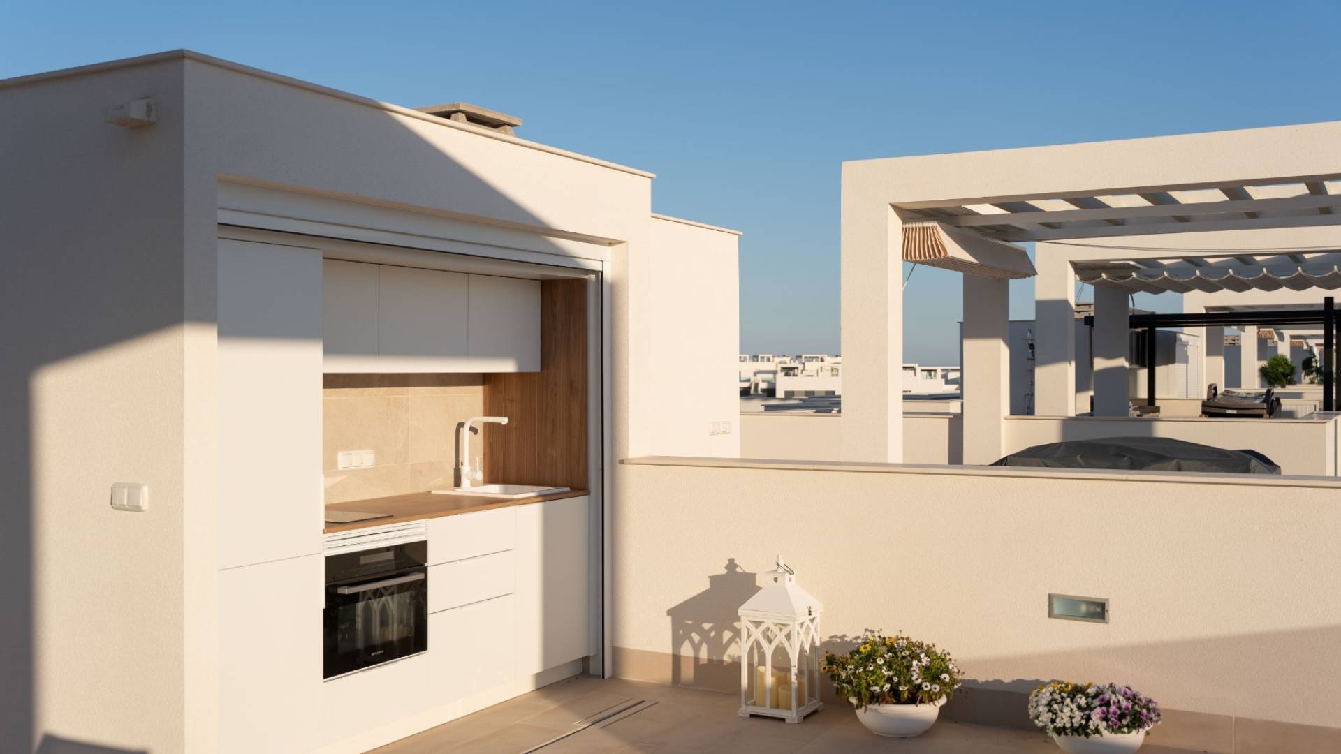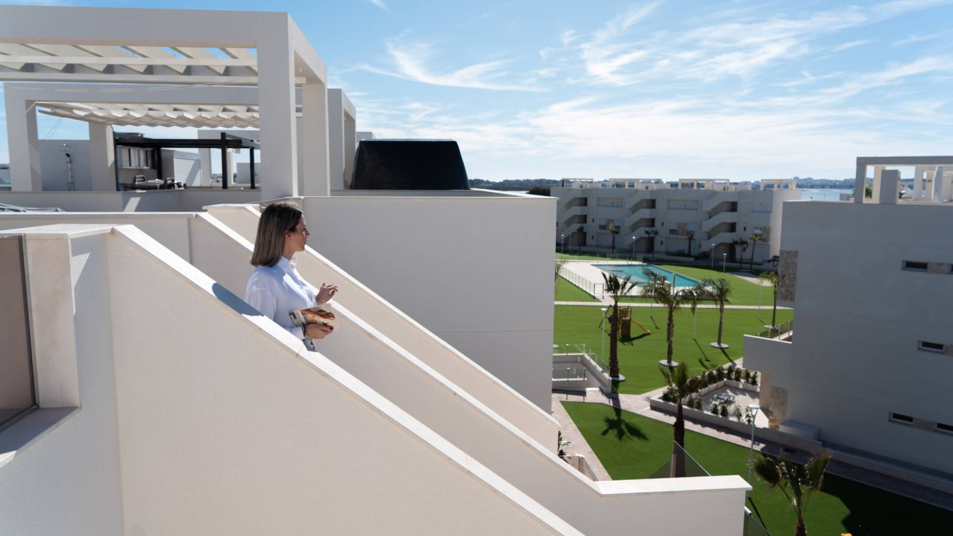 A leap forward with respect to our previous residential complexes, including a glassed-in GYM-Spa area with views of green areas, swimming pools and from its terrace overlooking the salt lagoon of La Mata, paddle tennis court, etc. Additionally and thanks to the five floors of some of the blocks that create the residential, all of which are south facing, we include in our luxury penthouses, fully equipped kitchen on the solarium, outdoor shower (hot/cold water), and jacuzzi area, to complete the unique experience of living in front of a unique and unrepeatable natural environment.