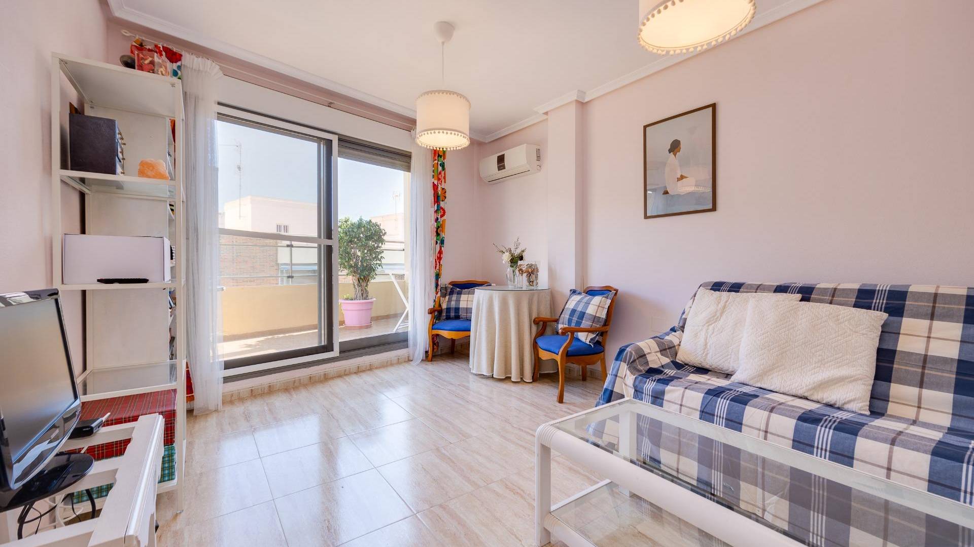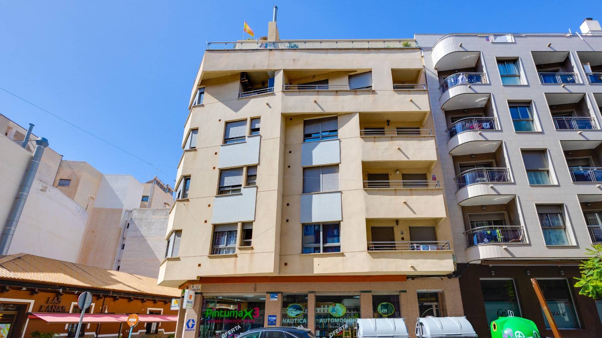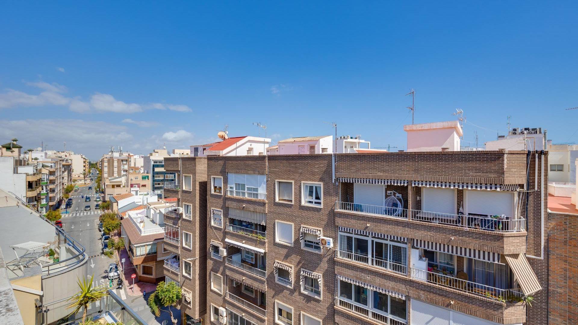 Este ático, situado en una quinta planta con ascensor, ofrece una ubicación privilegiada en el mismo centro de Torrevieja, permitiendo disfrutar de la cercanía al mar y de todos los servicios urbanos a pie de calle. La vivienda destaca por su excelente aprovechamiento del espacio y, sobre todo, por su gran entrada de luz natural gracias a una orientación este que garantiza sol directo durante toda la mañana. Se distribuye en un salón-comedor funcional con cocina abierta, un diseño diáfano que aporta amplitud y conecta directamente con una terraza privada, ideal para disfrutar de los desayunos al aire libre. La zona de descanso se distribuye de manera práctica en dos dormitorios: uno principal doble y un segundo dormitorio individual. El baño es completo y cuenta con un cómodo plato de ducha. Sin duda, el elemento diferenciador de esta propiedad es su gran solárium privado ubicado en la planta superior. Se trata de un espacio privado y despejado que ofrece vistas impresionantes, convirtiéndose en el lugar perfecto para relajarse, tomar el sol o disfrutar de cenas al fresco con total independencia en pleno corazón de la ciudad. Por su proximidad al puerto, al Club Náutico y a la zona comercial, esta propiedad representa una inversión sólida y versátil. Si busca una vivienda luminosa, práctica y con un solárium excepcional en el centro, este ático es una visita obligada.