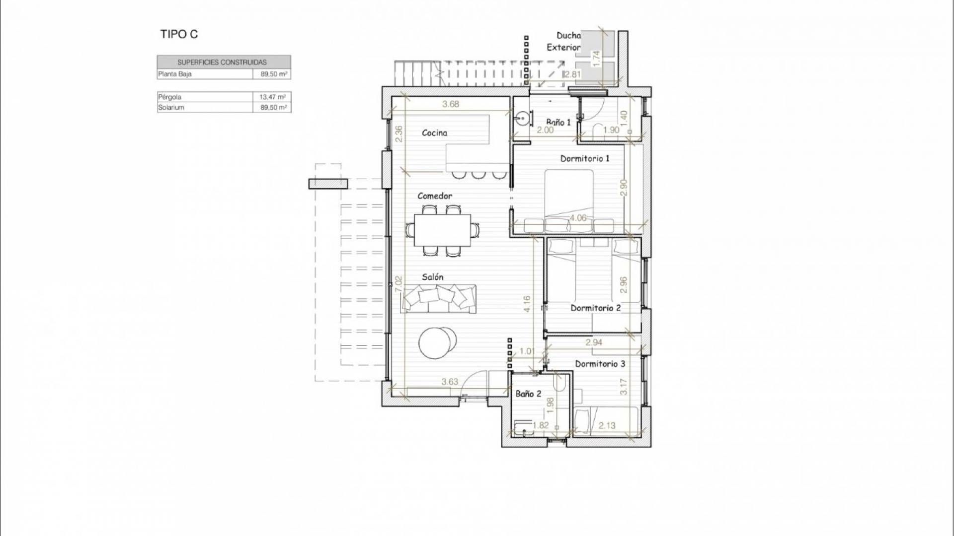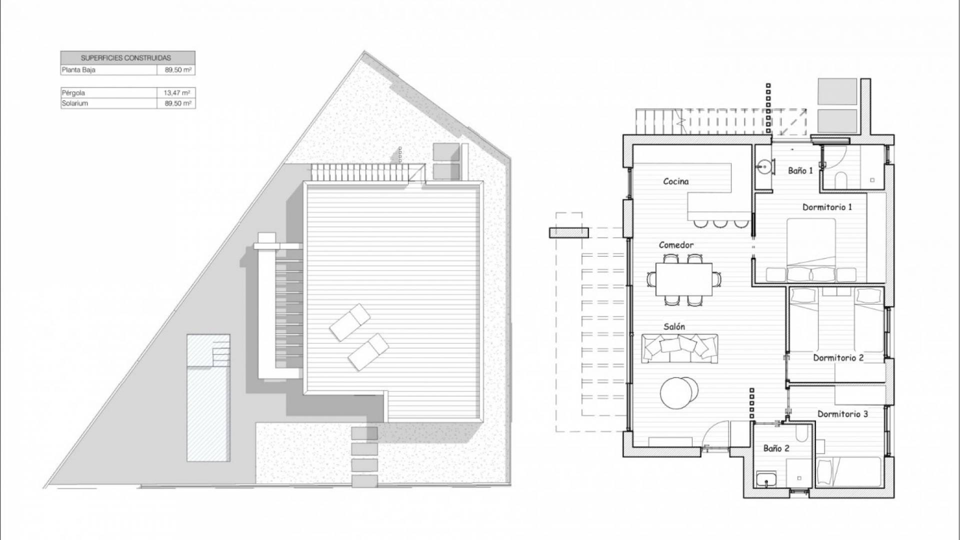 VILLAS DE OBRA NUEVA EN SAN MIGUEL DE SALINAS Residencial de nueva construcción de 5 villas independientes (3 tipos diferentes A, B y C) situado en San Miguel de Salinas. Villas de diseño moderno creadas para disfrutar del sol español. Las villas tienen 3 dormitorios, 2 baños, cocina abierta con amplio salón, armarios empotrados, terraza. Cada villa tiene una parcela independiente, plaza de aparcamiento y piscina. Una opción para un solarium a un costo adicional. San Miguel de Salinas situado cerca de los campos de golf Las Colinas y Campoamor, ofrece unas vistas excepcionales de las lagunas de Torrevieja y La Mata. San Miguel de Salinas es un municipio de la Comunidad Valenciana, España. Situado en el sur de la provincia de Alicante, en la comarca de la Vega Baja del Segura cerca de la Región de Murcia. El aeropuerto de Alicante se encuentra a 35 minutos en coche y el aeropuerto de Murcias Corvera está a una hora en coche.