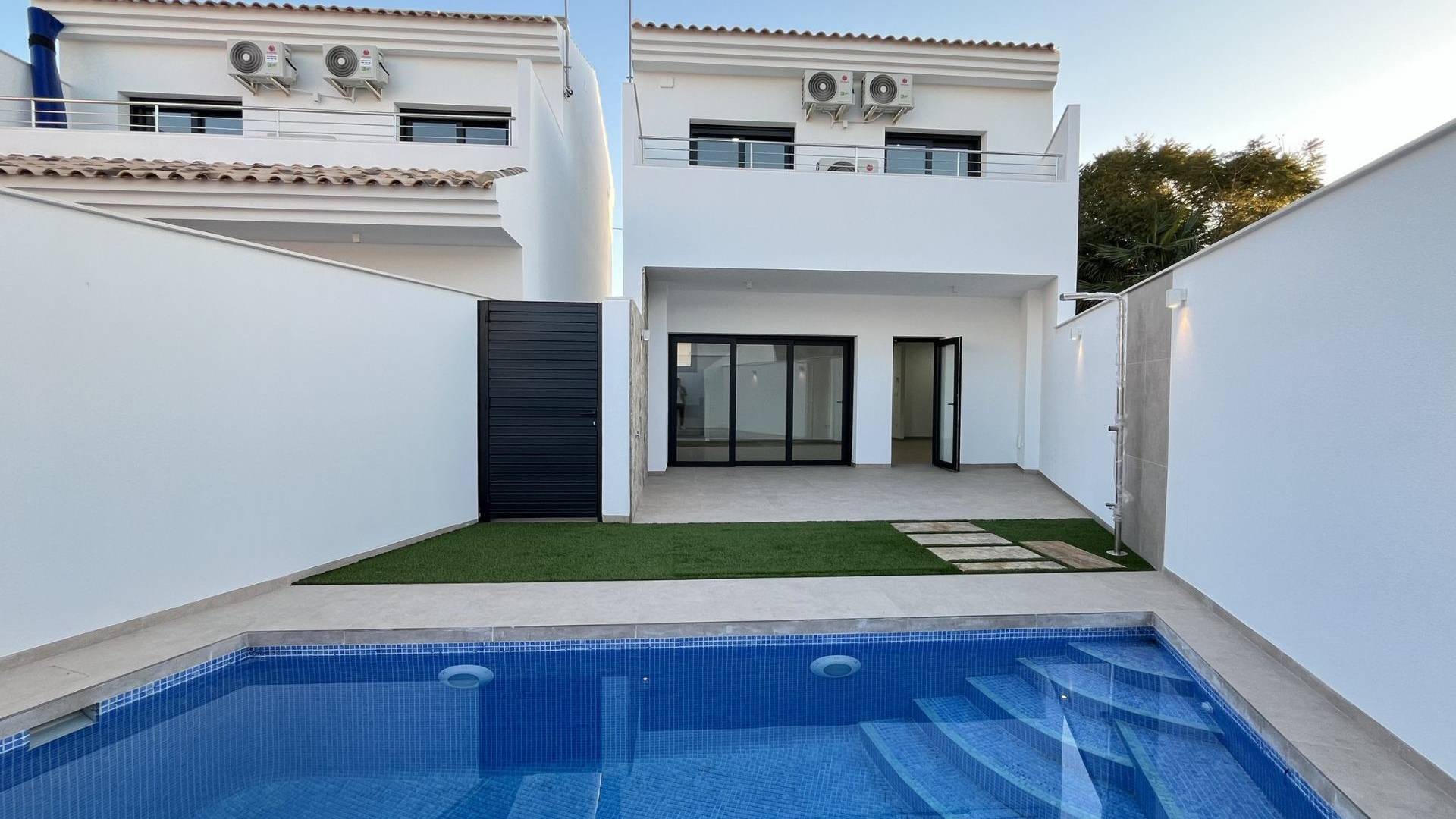 Villa neuve clé en main avec piscine privée à seulement 500 m de la plage à San Pedro del Pinatar Nouvelle construction exclusive dans un emplacement privilégié sur la Costa Cálida Découvrez cette villa neuve exceptionnelle à San Pedro del Pinatar, à seulement 500 mètres des plages de sable de Villananitos. Cette propriété clé en main offre un mélange parfait entre design moderne, finitions luxueuses et emplacement imbattable sur la très prisée Costa Cálida en Espagne. Que vous recherchiez une maison de vacances, une résidence principale ou un investissement à haut rendement, cette villa répondra à toutes vos attentes. Aménagement spacieux et élégance moderne Située sur un terrain de 240 m², cette villa offre une surface construite de 145 m² répartis sur deux niveaux. Elle comprend : Trois chambres spacieuses, dont une au rez-de-chaussée avec salle de bains attenante Deux salles de bains complètes avec douches à l'italienne et matériaux haut de gamme Un WC invités au rez-de-chaussée Cuisine ouverte avec appareils électroménagers Bosch haut de gamme Grand salon lumineux avec vue directe sur la terrasse de la piscine Quatre terrasses idéales pour la vie en plein air et les réceptions Chaque espace est conçu pour le confort, l'élégance et la fonctionnalité, avec une excellente isolation et une climatisation centralisée pour une température agréable toute l'année. Piscine privée et vie en plein air Profitez pleinement de la vie méditerranéenne avec votre propre piscine privée, une douche extérieure et plusieurs terrasses pour prendre le soleil, lire ou dîner en plein air. L'éclairage extérieur moderne rehausse l'ambiance, rendant cet endroit parfait pour des soirées relaxantes sous les étoiles. Il y a également un parking privé sur le terrain et une grande buanderie avec des branchements pour un lave-linge, un sèche-linge et un système aérothermique économe en énergie pour l'eau chaude. Emplacement stratégique sur la côte Situé à San Pedro del Pinatar, une charmante ville connue pour son atmosphère espagnole authentique et ses équipements modernes : Plage de Villananitos - 0,5 km Centre commercial Dos Mares - 3 km Parcours de golf de Roda - 7 km Port de plaisance de Lo Pagán - 1,5 km Centre-ville de Murcie - 47 km Cartagena – 34 km Cet emplacement privilégié offre un accès facile aux plages, aux terrains de golf, aux commerces, aux restaurants et aux principaux réseaux de transport, ce qui en fait un lieu idéal pour les loisirs et la vie quotidienne. Ne manquez pas cette opportunité clé en main Si vous rêvez d'une maison élégante et prête à emménager près de la mer, cette villa à San Pedro del Pinatar est le choix idéal. Contactez-nous dès aujourd'hui pour organiser une visite ou demander plus d'informations.