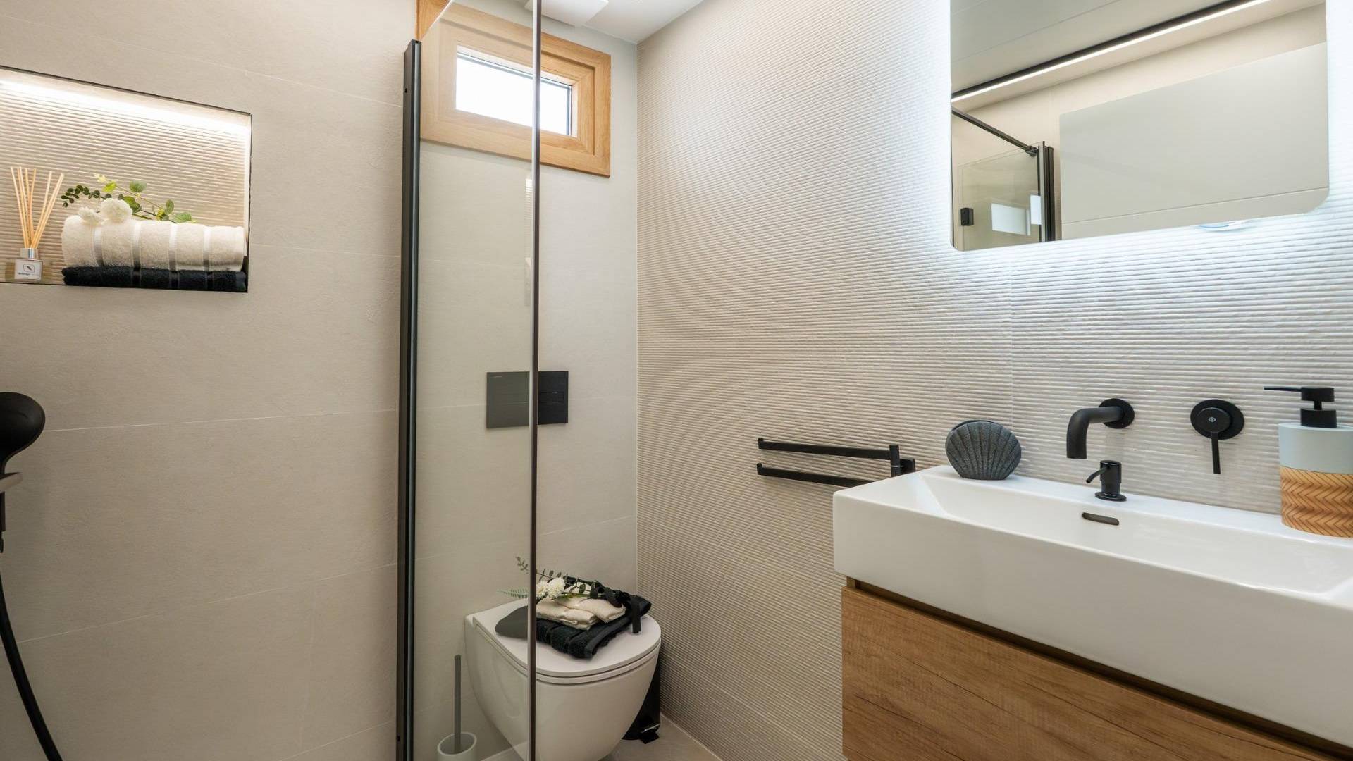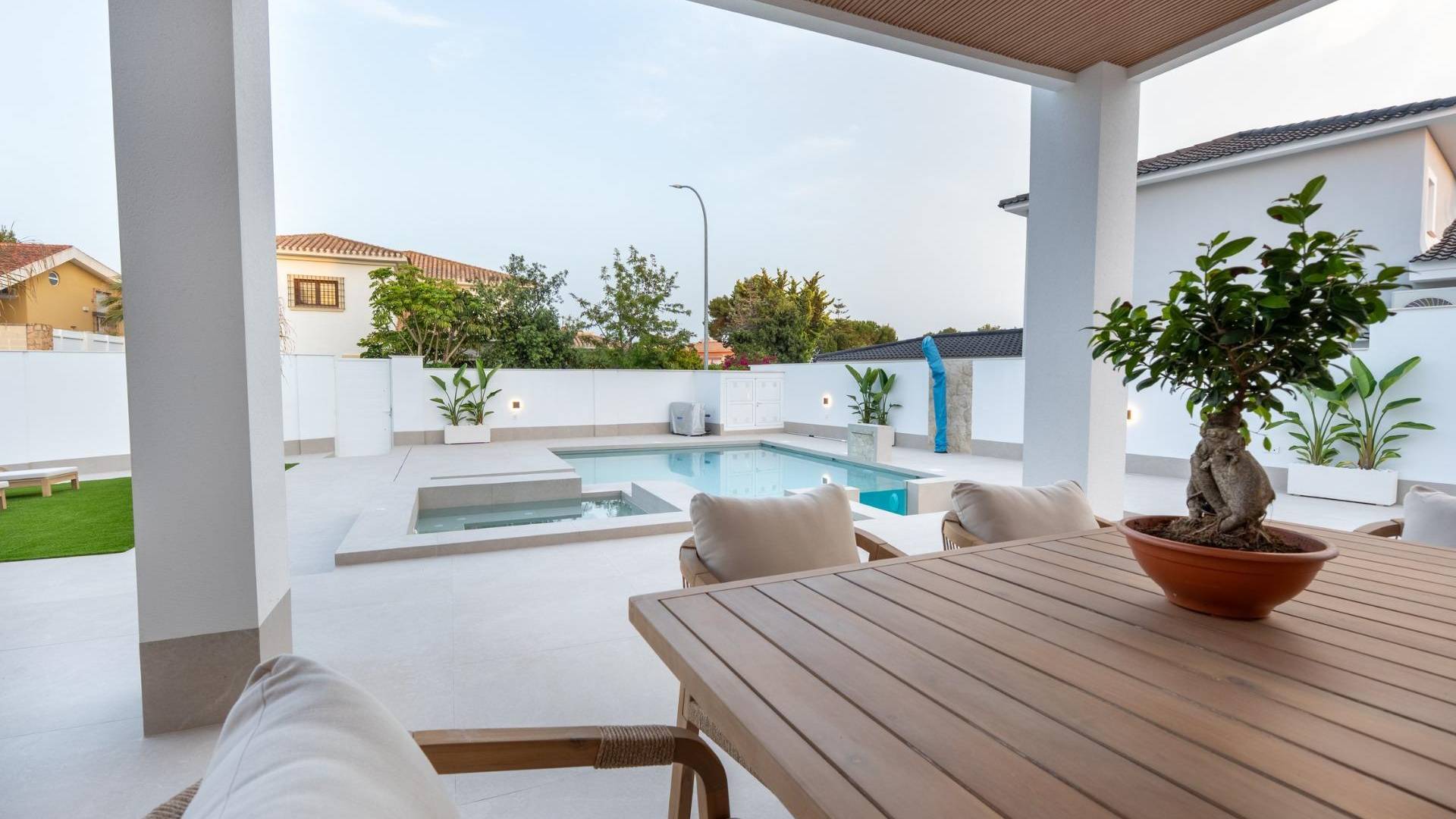 Villa de luxe à 800 mètres de la mer à Campoamor, Costa Blanca Sud Emplacement privilégié dans un cadre naturel et exclusif Située dans l'un des quartiers les plus calmes et les plus privés de Campoamor, cette villa spectaculaire allie luxe, confort et un emplacement exceptionnel à seulement 800 mètres des plages de Cala de Campoamor et Playa de los Diez Picos. Cette villa offre un accès exclusif à une zone sportive réservée aux propriétaires, qui comprend des courts de paddle, des terrains de tennis, de football, de basket-ball et plusieurs piscines. L'environnement naturel qui entoure la propriété comprend des espaces protégés tels que la Sierra Escalona et les salines de San Pedro del Pinatar et Torrevieja, idéaux pour les amoureux de la nature et de la biodiversité. Villa moderne au design contemporain et à l'efficacité énergétique Avec un terrain de 676 m² et une surface construite de 227 m² répartis sur deux étages, cette villa est conçue pour offrir un maximum de confort. Elle dispose de 4 chambres doubles, 5 salles de bains complètes et d'un spacieux salon-salle à manger avec cuisine intégrée de plus de 50 m². Le système d'aérothermie garantit l'efficacité énergétique et la durabilité. Intérieurs élégants et fonctionnels La cuisine, entièrement équipée d'appareils électroménagers Bosch, se distingue par son îlot central décoré de palissandre, son éclairage LED et une porte dissimulée pratique qui donne accès à la buanderie, au garage et à la salle de bains extérieure. Le salon dispose de grandes baies vitrées qui créent une connexion visuelle avec l'extérieur, renforçant l'espace et créant une atmosphère lumineuse et accueillante. Chambres et salles de bains conçues pour le confort La chambre principale dispose d'un dressing et d'une salle de bains en suite. Toutes les salles de bains présentent un design exclusif, avec des finitions modernes et des sèche-serviettes électriques (sauf à l'extérieur). L'éclairage LED est soigneusement réparti dans toute la maison pour apporter chaleur et style. Spectaculaire espace extérieur avec piscine et cuisine en plein air La villa comprend deux porches, une piscine privée de 47 m² avec jacuzzi et plage, ainsi qu'un solarium à l'étage supérieur. L'espace chill out, agrémenté d'un éclairage LED, crée un cadre parfait pour se détendre. La cuisine extérieure fait de cette villa l'endroit idéal pour profiter du climat méditerranéen en famille ou entre amis. Points d'intérêt à proximité Plage de Campoamor : 0,8 km Parcours de golf Las Ramblas : 3 km Centre commercial Zenia Boulevard : 6 km Aéroport de Murcie : 45 km Aéroport d'Alicante : 70 km Centre de Torrevieja : 13 km Vivez la Costa Blanca à son maximum Profitez de plus de 300 jours de soleil par an, avec une température moyenne de 20 °C, dans une villa entièrement équipée, prête à emménager. Parfaite comme résidence principale ou comme maison de vacances. Contactez-nous dès aujourd'hui pour plus d'informations ou pour organiser une visite de cette propriété exclusive à Campoamor.