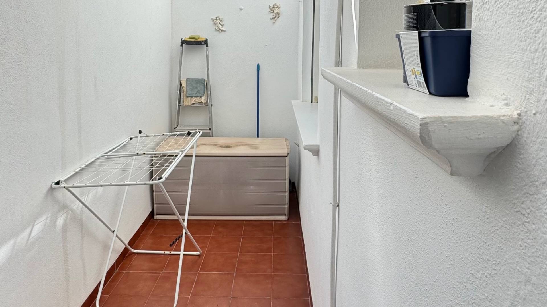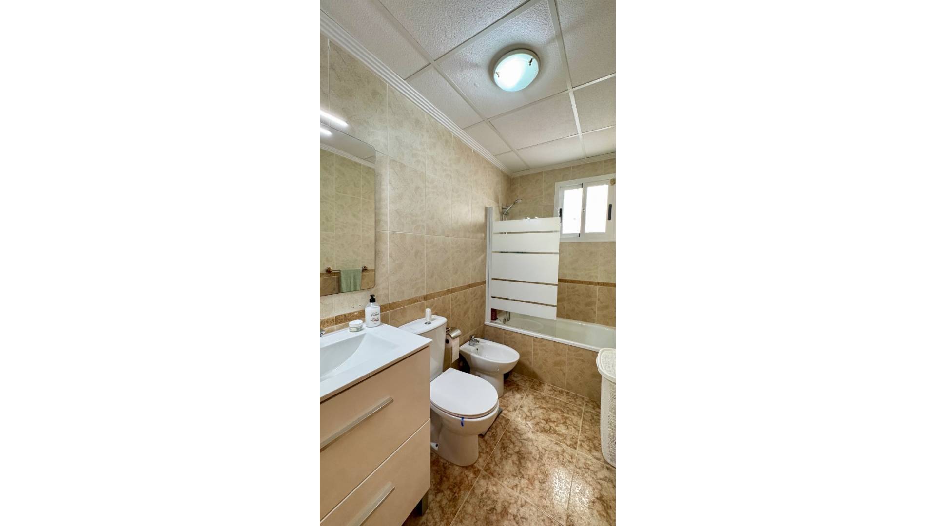 Situé dans un agréable résidentiel avec piscine communautaire, ce charmant bungalow tout au rez-de-chaussée offre un cadre de vie idéal pour des vacances au soleil. Le bien dispose de deux chambres et deux salles de bain, d’un séjour lumineux donnant accès à une terrasse couverte ainsi qu’à une grande terrasse orientée nord-ouest, ensoleillée tout l’après-midi, parfaite pour profiter du climat méditerranéen. La cuisine, entièrement équipée, est complétée par un patio arrière couvert, pratique pour accueillir la machine à laver et le boiler. La maison bénéficie également de la climatisation chaud / froid, garantissant un confort optimal tout au long de l’année. En complément, le logement comprend une place de parking en sous-sol ainsi qu’une cave de rangement, offrant un espace de stockage très appréciable. Son véritable atout reste sa localisation privilégiée, entre Punta Prima et Playa Flamenca, avec tous les services accessibles à pied : commerces, restaurants et loisirs. La mer se trouve à seulement 2 km, permettant de rejoindre facilement les plages sans voiture. Un bien pratique, confortable et parfaitement situé pour profiter pleinement de la Costa Blanca.