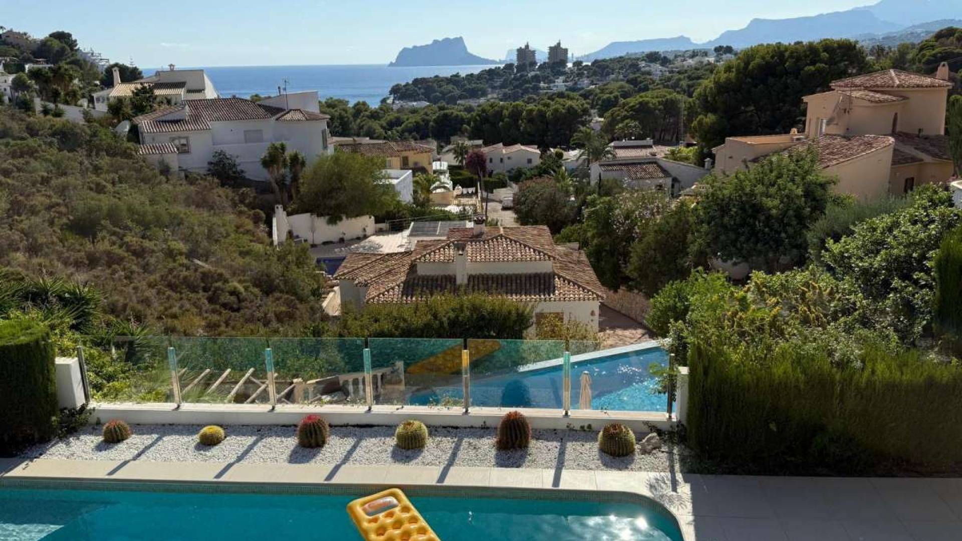 **Villa de rêve sur les hauteurs de la baie d’El Portet à Moraira – Vue imprenable & équipements haut de gamme**Située dans l’un des quartiers les plus prisés de Moraira, cette spacieuse villa de style espagnol se trouve à seulement **900 mètres au-dessus de la magnifique baie d’El Portet**. Vous profiterez ici d’une vue mer à couper le souffle, d’un environnement paisible et d’un accès facile à la plage, aux restaurants, commerces et au charmant centre-ville de Moraira (à env. 2 km).--- Données clés :* **Surface habitable** : env. 373 m²* **Terrain** : env. 836 m²* **Chambres** : 4 – chacune avec salle de bain privée et climatisation* **Salles de bain** : 4* **Piscine privée** : 9 x 4 m avec vue mer et douche extérieure* **Capacité** : jusqu’à 8 personnes--- Espaces extérieurs :* **Terrasse couverte** avec grande table en bois pour 8 personnes* **Grande terrasse ensoleillée** avec transats, système audio Bose extérieur et coin lounge ombragé* **Vue panoramique** sur la mer et les montagnes depuis plusieurs niveaux* **Piscine privée** avec escaliers romains et éclairage subaquatique* **Panier de basket, table de ping-pong, barre de traction** – parfait pour les familles et les amateurs de sport* **Jardin paysager** avec arbres et haies, jouxtant une zone verte* **Carport pour 2 véhicules**, plus places de parking supplémentaires sur le terrain clôturé avec portail électrique--- Équipements & points forts :* **Séjour et salle à manger lumineux et ouverts**, avec vue mer et accès direct à la terrasse* **Chauffage au sol**, **fenêtres à double vitrage**, **volets roulants électriques*** **Installation photovoltaïque** – pour une énergie économique en journée* **Climatisation** dans le séjour/salle à manger et dans toutes les chambres* **Cuisine américaine moderne**, entièrement équipée avec appareils Bosch (plaque vitrocéramique, four, lave-vaisselle, micro-ondes, cafetière, grille-pain, etc.)* **Sol en marbre crème élégant** dans toute la maison* **4 chambres décorées avec goût**, chacune avec salle de bain en suite, TV, moustiquaires et climatisation* **Suite parentale** avec grand balcon privé et vue panoramique sur la mer et la Sierra Bernia* **Cave à vin (bodega)** au sous-sol – idéale pour les amateurs de vin* **Salle de cinéma privée** avec TV 85 pouces – parfaite pour les soirées cinéma ou les jeux vidéo---**Cette villa allie luxe, confort et l’un des meilleurs emplacements de la Costa Blanca.** Que ce soit pour un usage personnel, comme résidence secondaire ou bien en tant qu’investissement locatif haut de gamme – cette propriété répond à toutes les attentes.