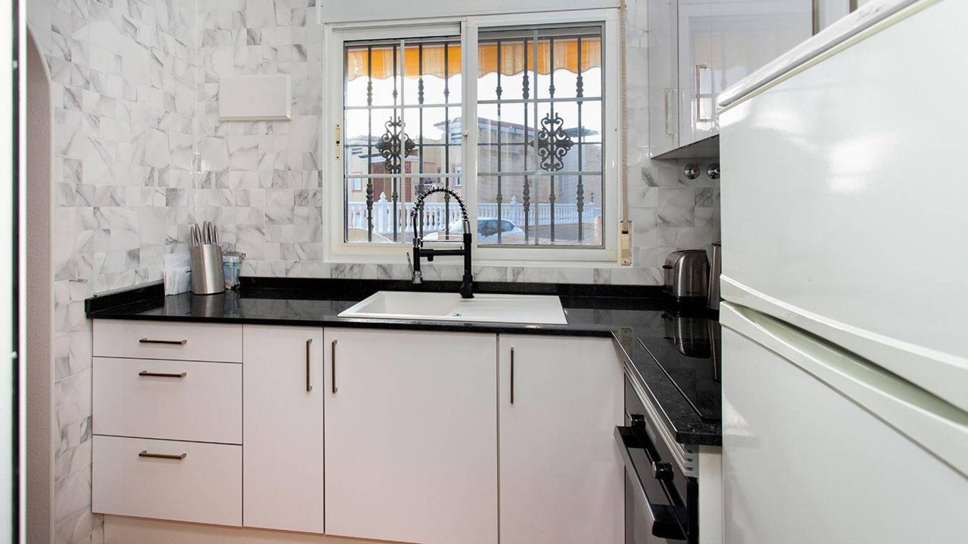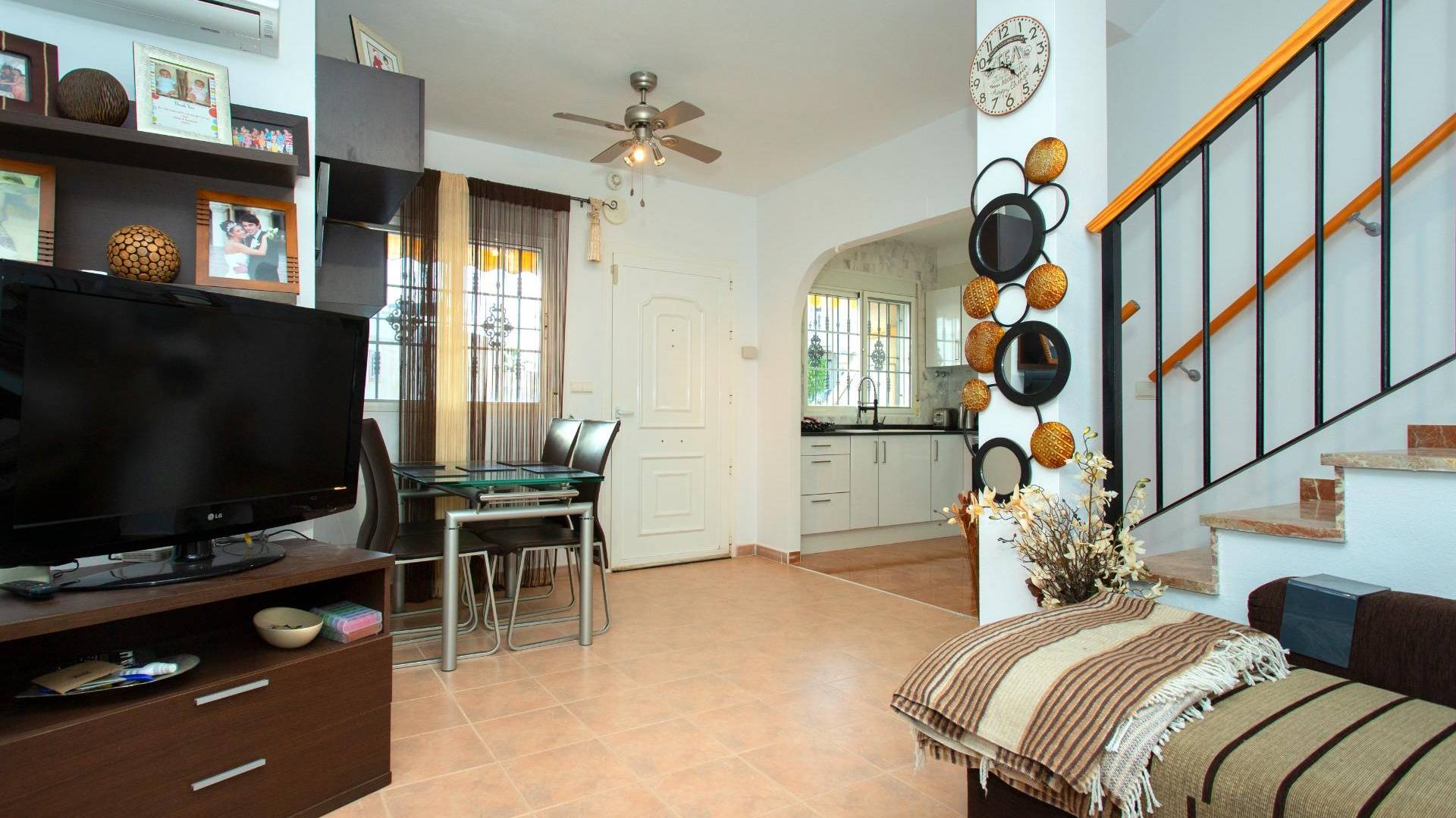 VUE MER · SOLARIUM PRIVÉ · ORIENTATION SUD Maison de ville de 2 chambres à Las Filipinas, Villamartin, Orihuela Costa. Maison de ville d’angle de revente rénovée, offrant 79 m² construits, répartis sur trois niveaux (année de construction 2003). Le rez-de-chaussée comprend une terrasse fermée et un patio avant privé relié à une grande terrasse d’angle, ainsi qu’un espace latéral clôturé utilisé comme stationnement sur la parcelle et zone barbecue. À l’intérieur se trouvent un séjour–salle à manger combiné avec cuisine américaine ouverte, des toilettes invités (sans douche) et un débarras séparé. Au premier étage se trouvent deux chambres doubles avec placards intégrés ; l’une d’elles dispose d’un accès direct à un balcon avec vues dégagées. Ce niveau comprend également la salle de bains principale avec douche. Le dernier étage offre un solarium d’angle avec vue sur la mer et vues panoramiques sur les environs. Un stationnement supplémentaire est disponible dans la rue intérieure. À env. 4,8 km de la plage (environ 15 minutes en voiture), très proche du golf de Villamartin et à environ 45 minutes de route de l’aéroport. Aucune licence touristique en place et aucune note légale indiquée. Convient pour une résidence à l’année ou comme pied-à-terre de vacances facile à entretenir.
