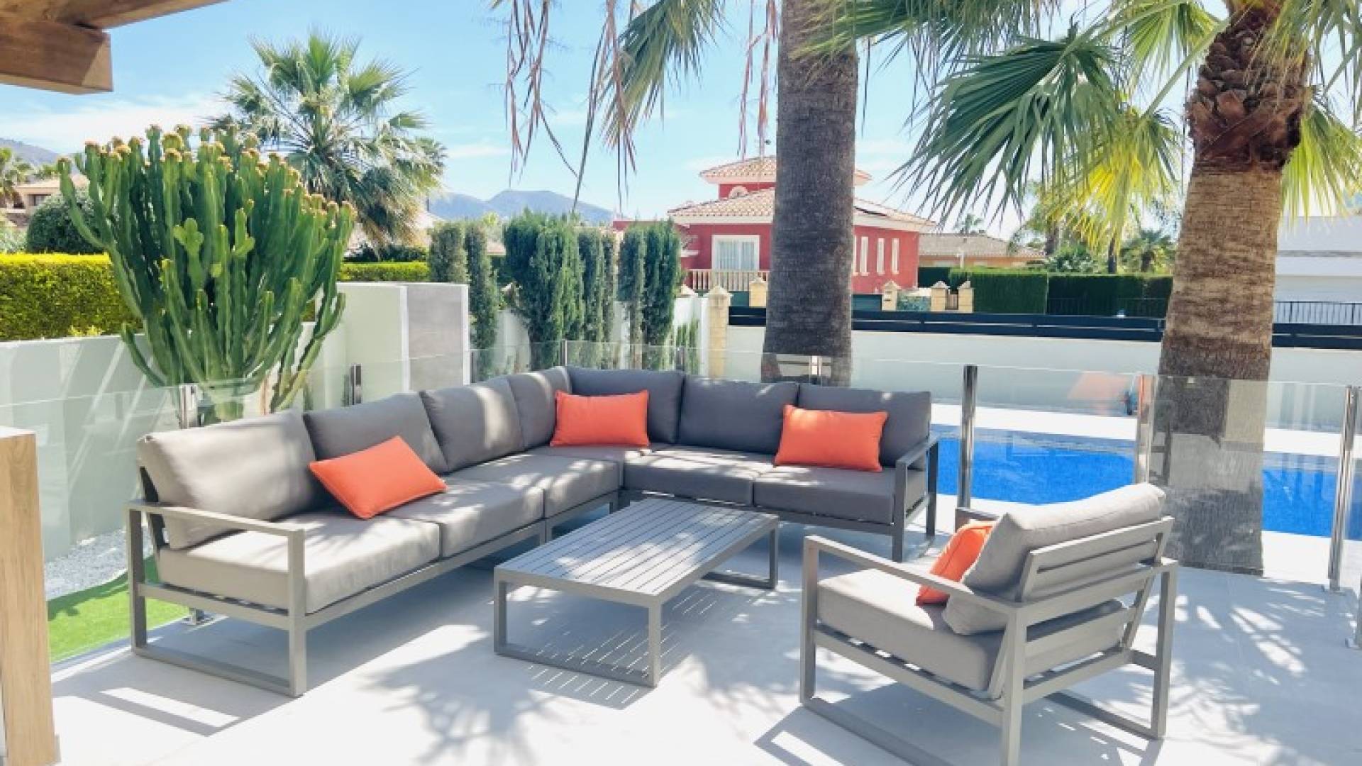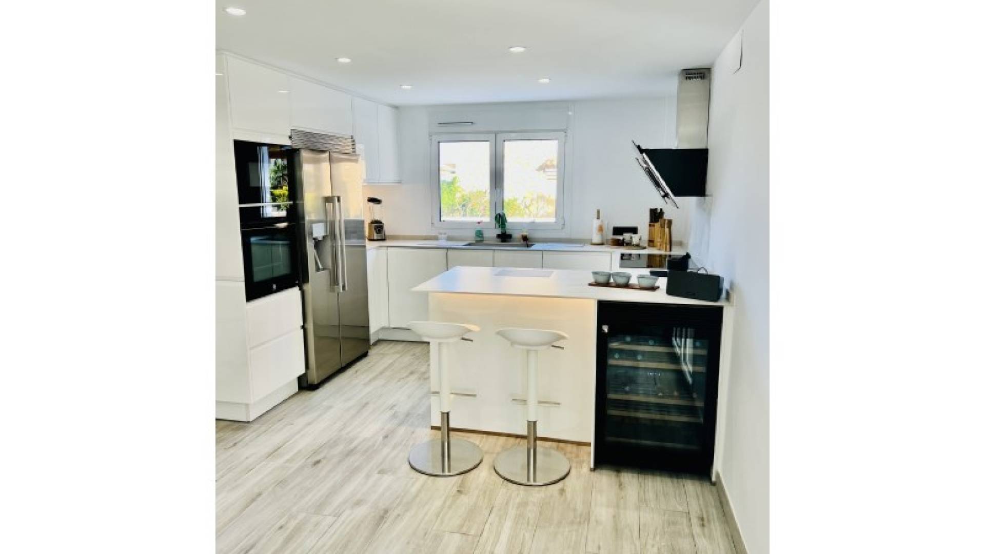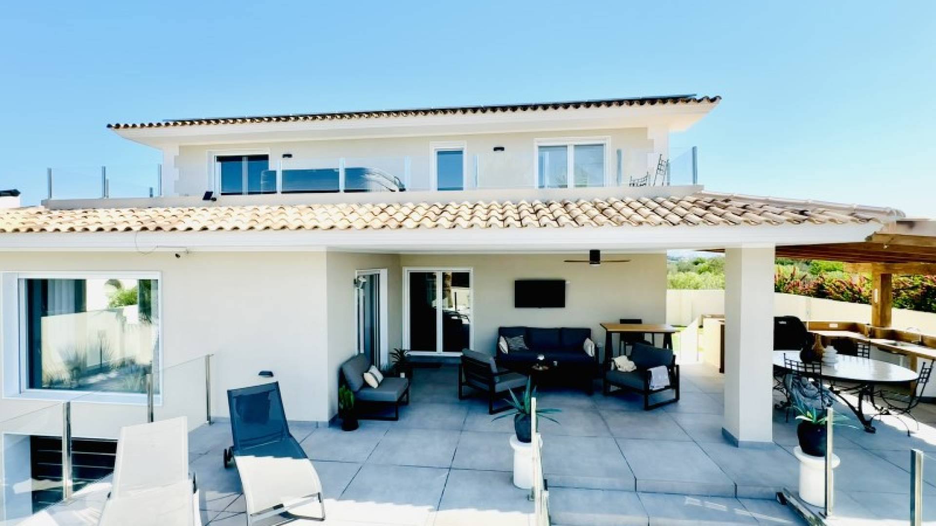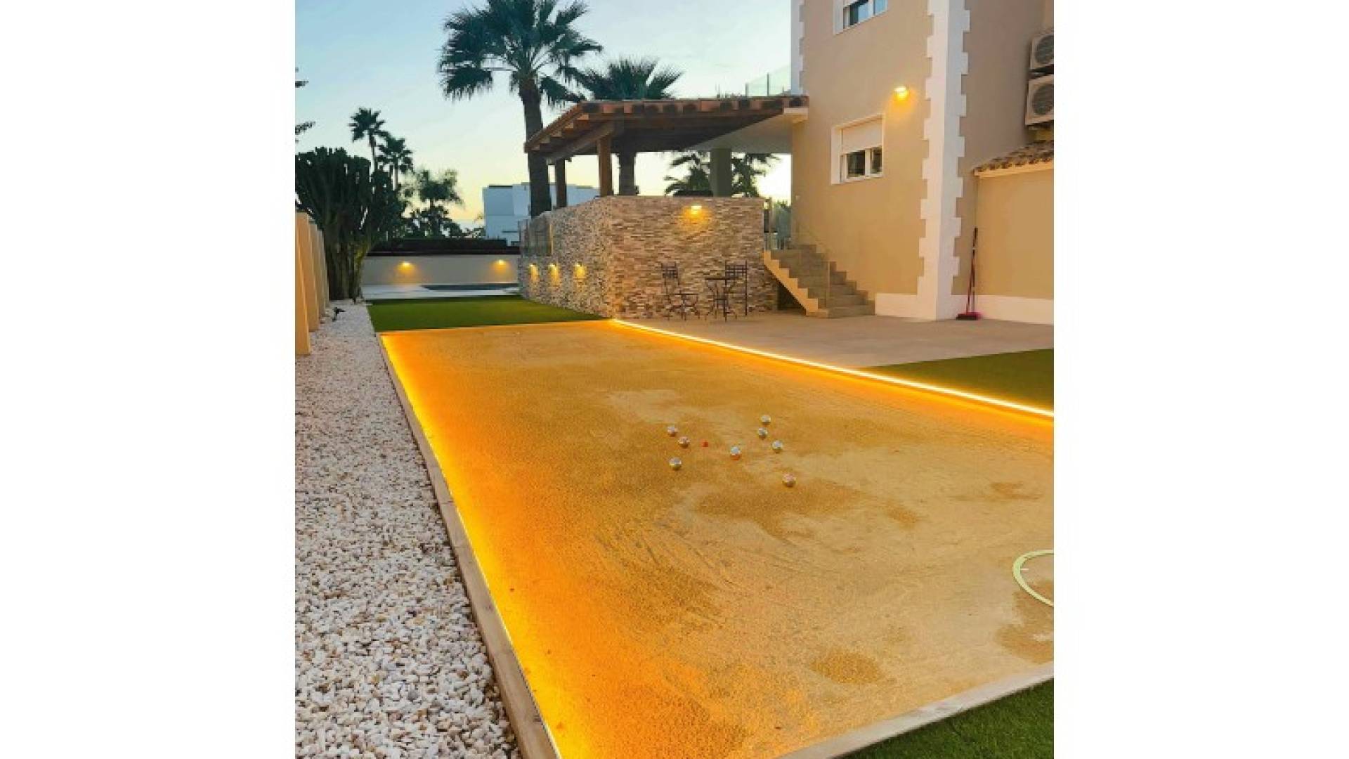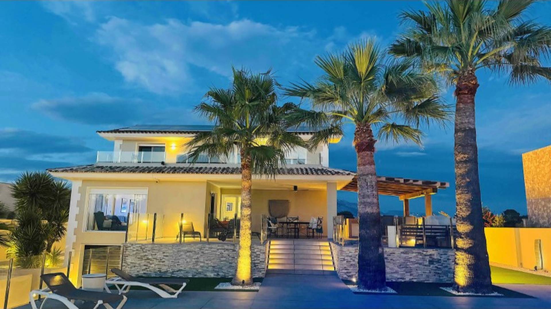 Stunning Modern Villa in Alfaz del PiKey Features:Prime Location: Nestled in the tranquil area of Pueblo-Urbanzaciones in Alfaz del Pi, just 10 minutes from the beach and 15 minutes from Benidorm, with easy access to local amenities and attractions.Spacious and Bright Living Areas: Boasting a built area of 347 m² on a 1,250 m² plot, this villa offers an open-plan, modern design that seamlessly connects the living, dining, and kitchen areas.Functional Layout: The property is spread over two floors and a basement. The main floor features a spacious living-dining room with large windows, a high-end open kitchen, one bedroom/office, and a full bathroom. The upper floor comprises three bedrooms, two of which are en-suite, with private terrace access.Spectacular Outdoor Area: A large 11x5 metre swimming pool with night lighting, landscaped gardens, a terrace with an outdoor dining area, a pergola with seating space, and an outdoor kitchen with a barbecue. Additionally, there is a pétanque court with LED lighting and a mini putting green for golf enthusiasts.Comfort and Sustainability: Equipped with underfloor heating, air conditioning, filtered drinking water, electric blinds, double glazing, a security system, and solar panels for energy efficiency and self-sufficiency.Garage and Storage: The basement includes a garage for one car, ample storage space, and direct access to the house.Detailed Description:This villa, fully renovated in 2023, combines modern design with comfort and functionality. On the main floor, large windows allow for plenty of natural light, while integrated LED lighting creates a cosy ambiance in the evening. The high-end open kitchen, complete with a central island, is perfect for daily living and entertaining.The upper floor offers privacy and exclusivity, with spacious bedrooms. The master bedroom stands out with its walk-in wardrobe, en-suite bathroom, and access to a private terrace featuring a jacuzzi and stunning views of Benidorm's skyline.The exterior is designed to embrace the Mediterranean lifestyle, with numerous spaces to relax and entertain. From the illuminated pool to the games area, every detail has been carefully crafted for maximum enjoyment and comfort.This move-in ready property represents the best of Mediterranean living.Don't miss the opportunity to visit this exceptional villa! Contact us for more information or to arrange a viewing. ref:VIL_1