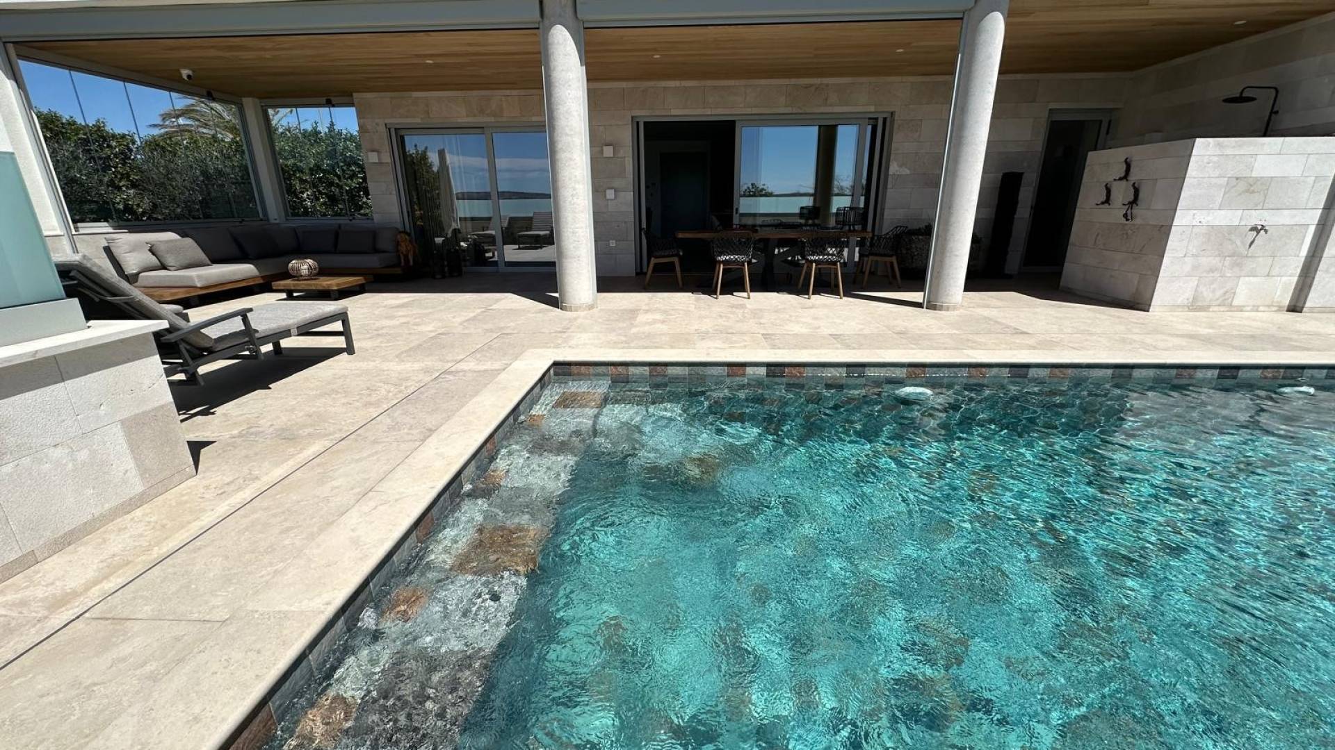 Ceci n’est pas une villa ordinaire. C’est une création exceptionnelle, réalisée avec vision, savoir-faire et une qualité sans compromis. Une opportunité rare d’investir dans une résidence qui incarne le luxe, la durabilité et l’exclusivité dans les moindres détails. Construite sur une fondation innovante et équipée d’une isolation hautement performante (IKO Enertherm Alu TG, spécialement importée), cette villa se situe au sommet de l’efficacité énergétique et du confort. Des systèmes solaires avancés avec capacité de stockage garantissent des coûts énergétiques minimes – un avantage rare pour une propriété de cette envergure. Chaque détail reflète la qualité : volets roulants et protections solaires entièrement électriques, système de chauffage de pointe et installation de purification d’eau ultramoderne distribuant de l’eau pure dans toute la villa. Tous les matériaux – sols, menuiseries et sanitaires – ont été soigneusement sélectionnés et harmonisés, pour un résultat d’une élégance raffinée. Agencement & Espaces de vie 4 chambres spacieuses, chacune avec sa propre salle de bain ensuite, dont une suite parentale exclusive avec accès direct à la piscine Un spectaculaire solarium de 57 m² avec vue panoramique à couper le souffle – l’endroit idéal pour des réceptions élégantes ou des couchers de soleil inoubliables Une terrasse magnifiquement aménagée de 176 m² au total, comprenant une grande piscine carrelée de 11 x 4 mètres. Sur cette surface, 46,3 m² sont couverts et peuvent être entièrement fermés par des panneaux élégants (screens) et haut de gamme – pour un confort et une intimité en toute saison Sur le côté de la villa se trouve un jardin supplémentaire de 80 m², agrémenté d’une belle végétation méditerranéenne qui apporte encore plus de charme et d’exclusivité Un vaste séjour avec baies vitrées toute hauteur reliant harmonieusement intérieur et extérieur Le sous-sol spacieux offre un garage pour plusieurs voitures, un cinéma privé, une salle de sport ou une suite d’invités – les possibilités sont infinies. Pourquoi cette villa est unique Là où des villas de ce calibre coûteraient le double, voire le triple dans d’autres emplacements prestigieux, cette résidence à Benijófar offre un potentiel d’investissement inégalé. Plus qu’une maison – un art de vivre, un symbole et un investissement sûr pour l’avenir.