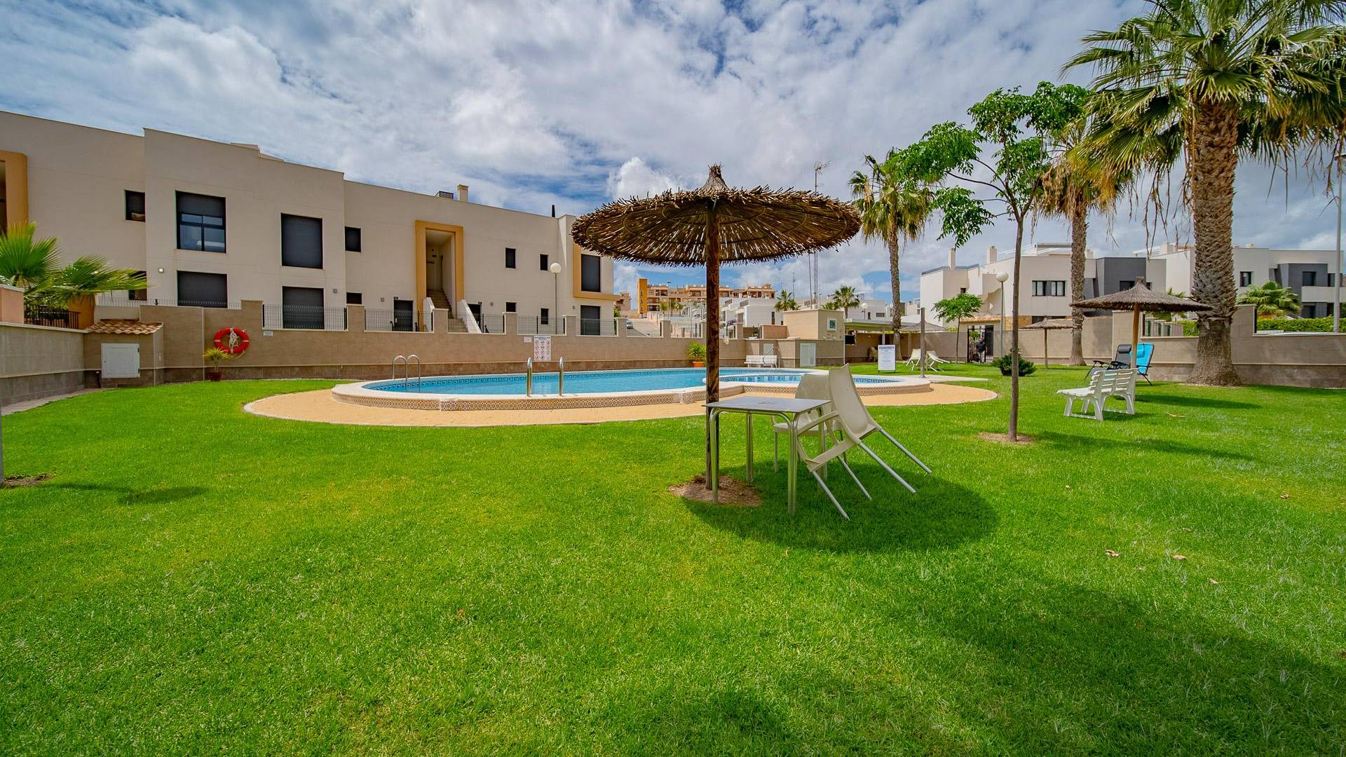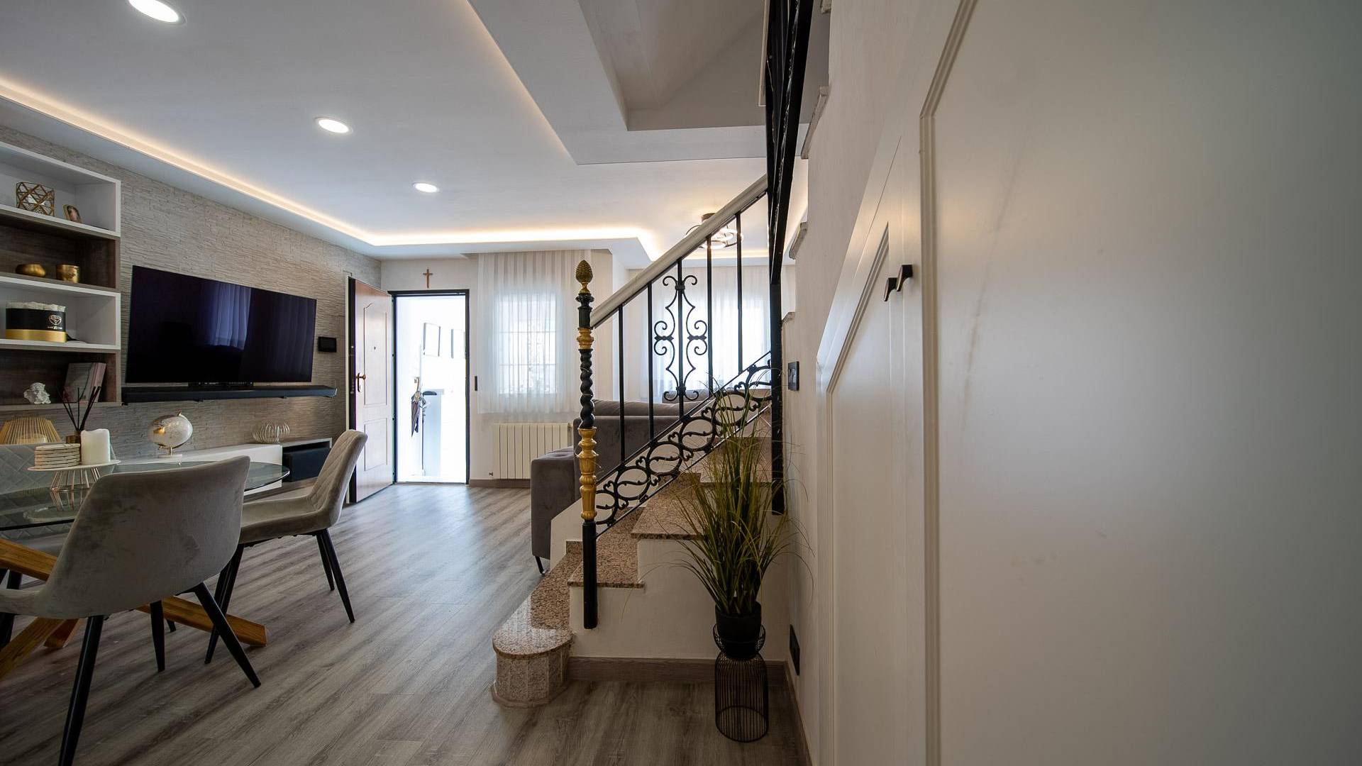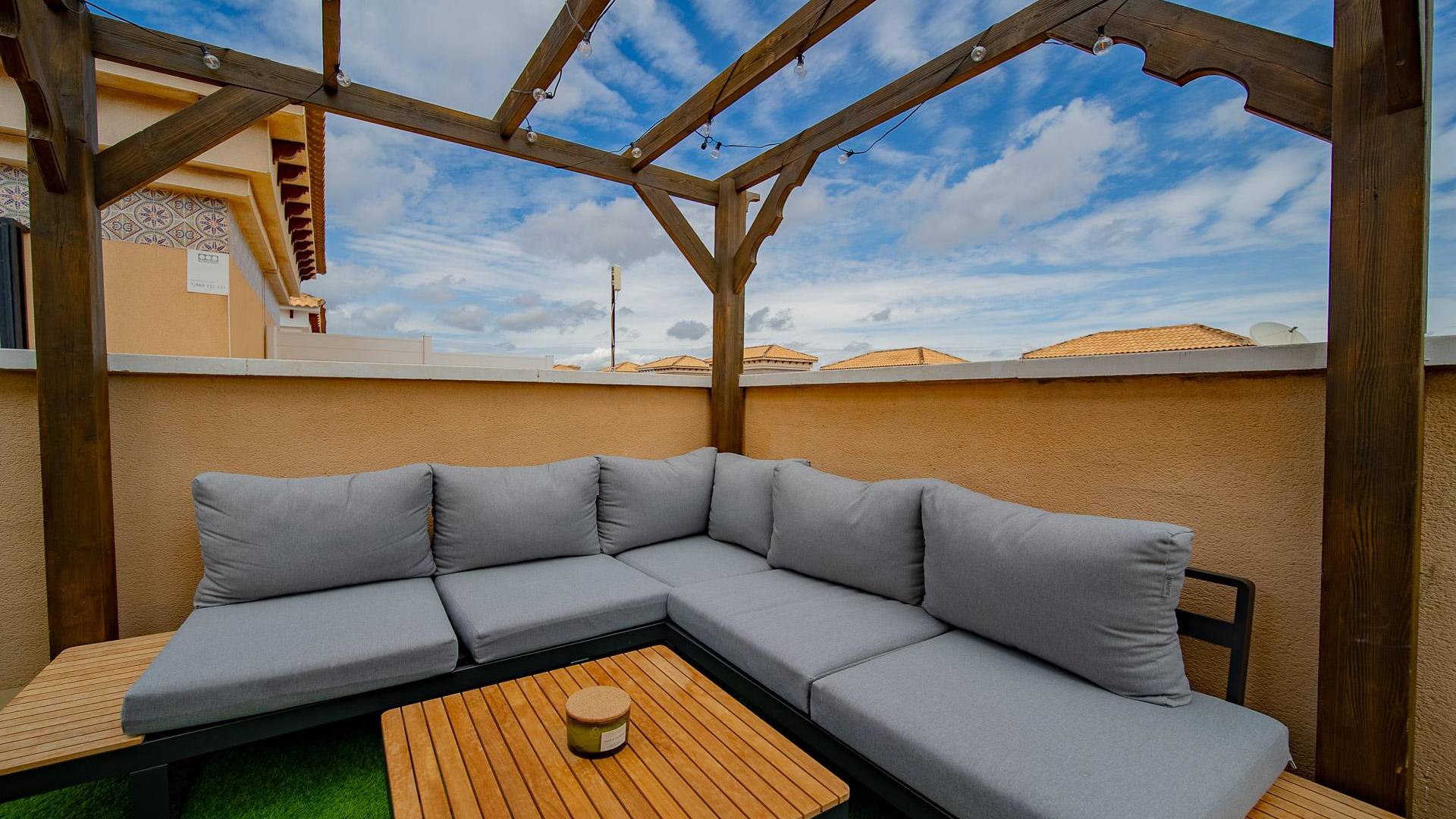 Maison mitoyenne entièrement rénovée à Pau 26, Orihuela CostaSituée dans une résidence calme avec piscine commune, cette maison d’angle a été entièrement rénovée et offre de beaux espaces extérieurs ainsi qu’une bonne intimité.Construite en 2005 sur un terrain de 81 m², elle dispose de 76 m² construits répartis sur deux étages.Caractéristiques :3 chambres2 salles de bainsCuisine ouverteTerrasse et solarium privatifsDébarras ou buanderiePlace de parking sur la parcellePartiellement meubléeOrientation nord-ouestPiscine communautaireFrais annuels :IBI : 295 €Charges de copropriété : 275 €