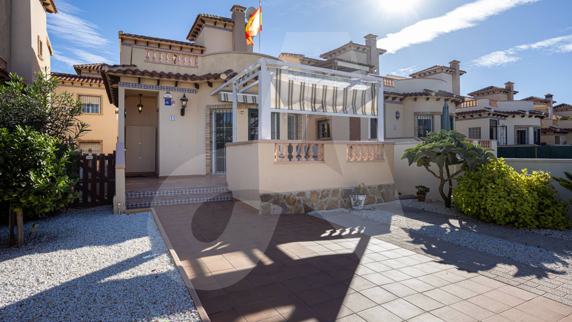 Vous entrez dans la villa par le parking privé et une terrasse agréable, parfaite pour profiter de la vie en plein air espagnole.