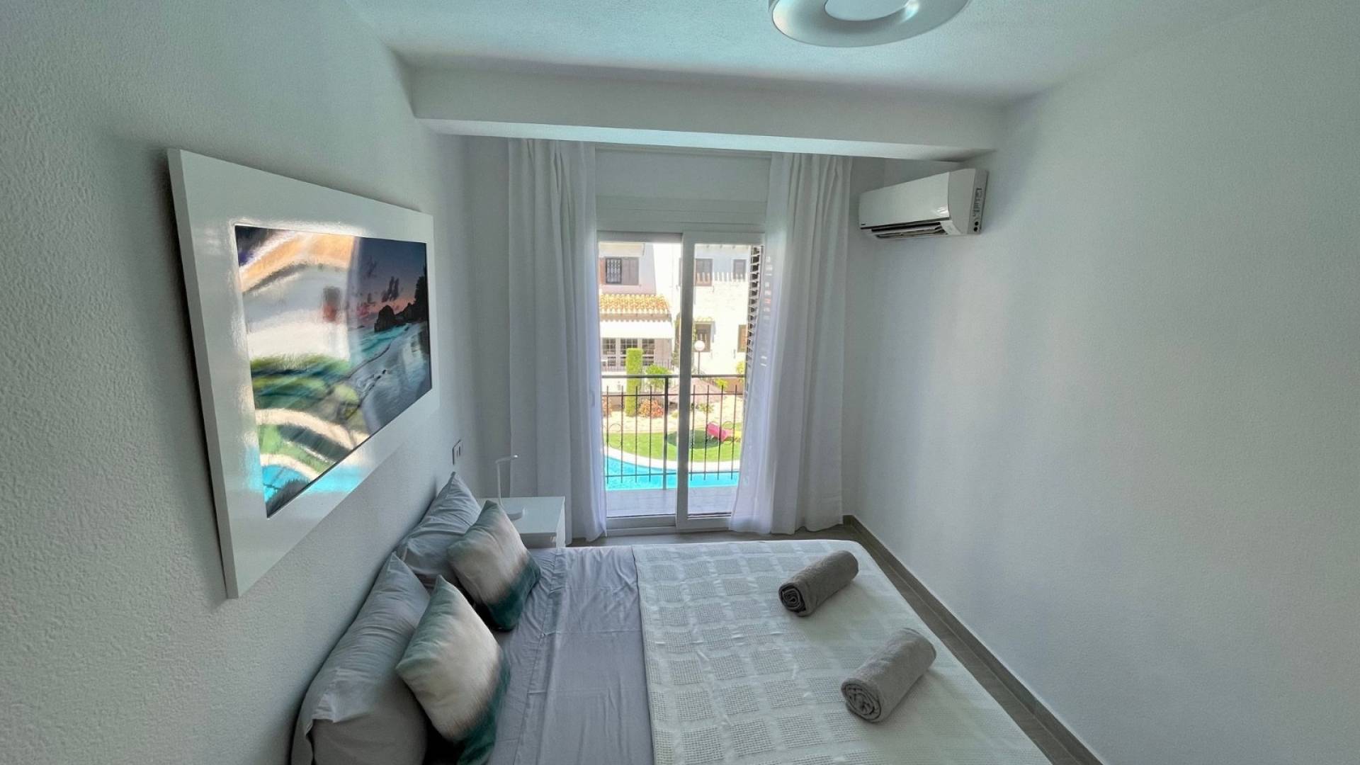 Appartement récemment rénové, très agréable et confortable, situé au premier étage et orienté sud-est. Climatisation dans toutes les pièces, piscine communautaire et terrasse fermée avec rideaux de verre. À 800 m de la plage. Situé à environ 7 minutes à pied de la plage, à proximité de nombreux cafés et restaurants sur la zone de Cabo Roig. Deux chambres doubles, salle de bain avec douche à l’italienne, climatisation dans toutes les pièces (chambres et salon). 65 m² de surface habitable. Le balcon ainsi que la terrasse donnent sur la piscine et la rue. Place de parking couverte dans la résidence.