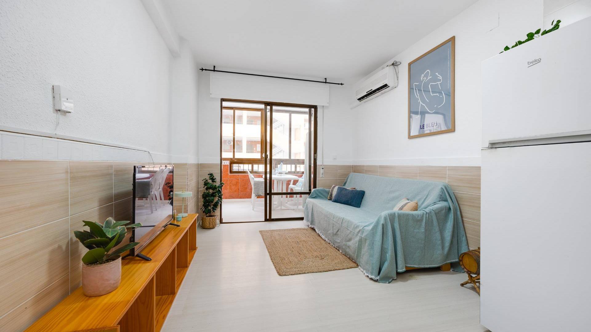 Vivez l’essence de la Méditerranée dans ce lumineux appartement au style marin, situé en deuxième ligne de plage, à seulement quelques pas de la mer. Orienté au nord, il est idéal pour rester au frais en été tout en bénéficiant d’une belle luminosité naturelle. Ce bien offre un parfait équilibre entre calme et confort urbain. Le logement se compose d’un salon-salle à manger chaleureux avec une cuisine ouverte et entièrement équipée. Le salon donne accès à une terrasse vitrée de 8 m² avec vue latérale sur la mer, un espace idéal pour se détendre toute l’année. Il dispose de deux chambres (une double et une individuelle) ainsi que d’une salle de bain fonctionnelle avec douche. Atout majeur dans ce secteur : une place de stationnement, garantissant un confort optimal dans un emplacement privilégié proche de tous les services. Que ce soit pour un investissement rentable ou comme résidence secondaire, cet appartement est une opportunité unique sur la Costa Blanca.