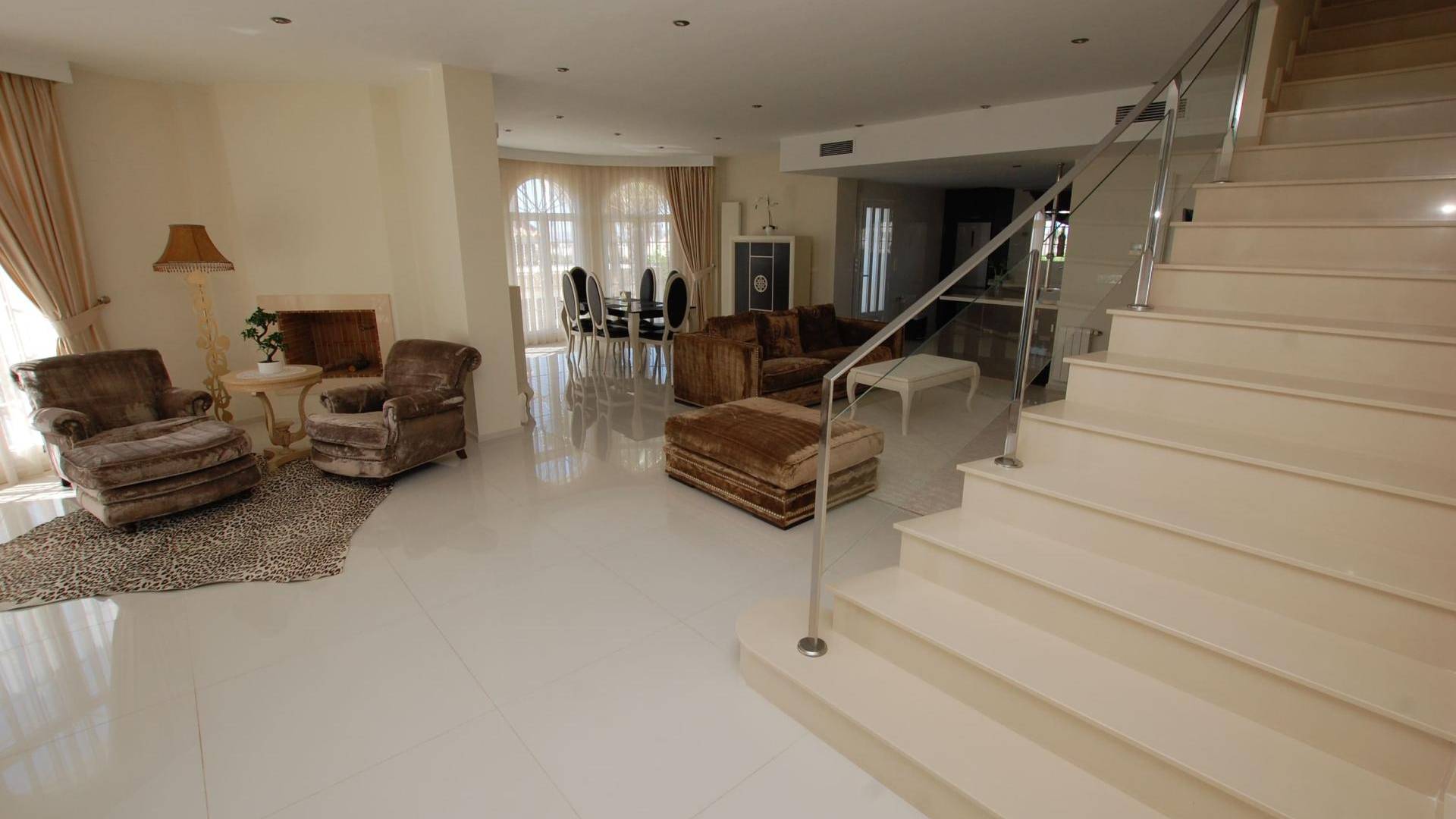 Le cœur de la maison est un vaste salon, couronné d'une cheminée qui apporte chaleur et distinction. Cinq chambres spacieuses et quatre salles de bains garantissent espace et intimité à toute la famille. La grande cuisine entièrement équipée ravira les gourmets.Luxe et divertissement :