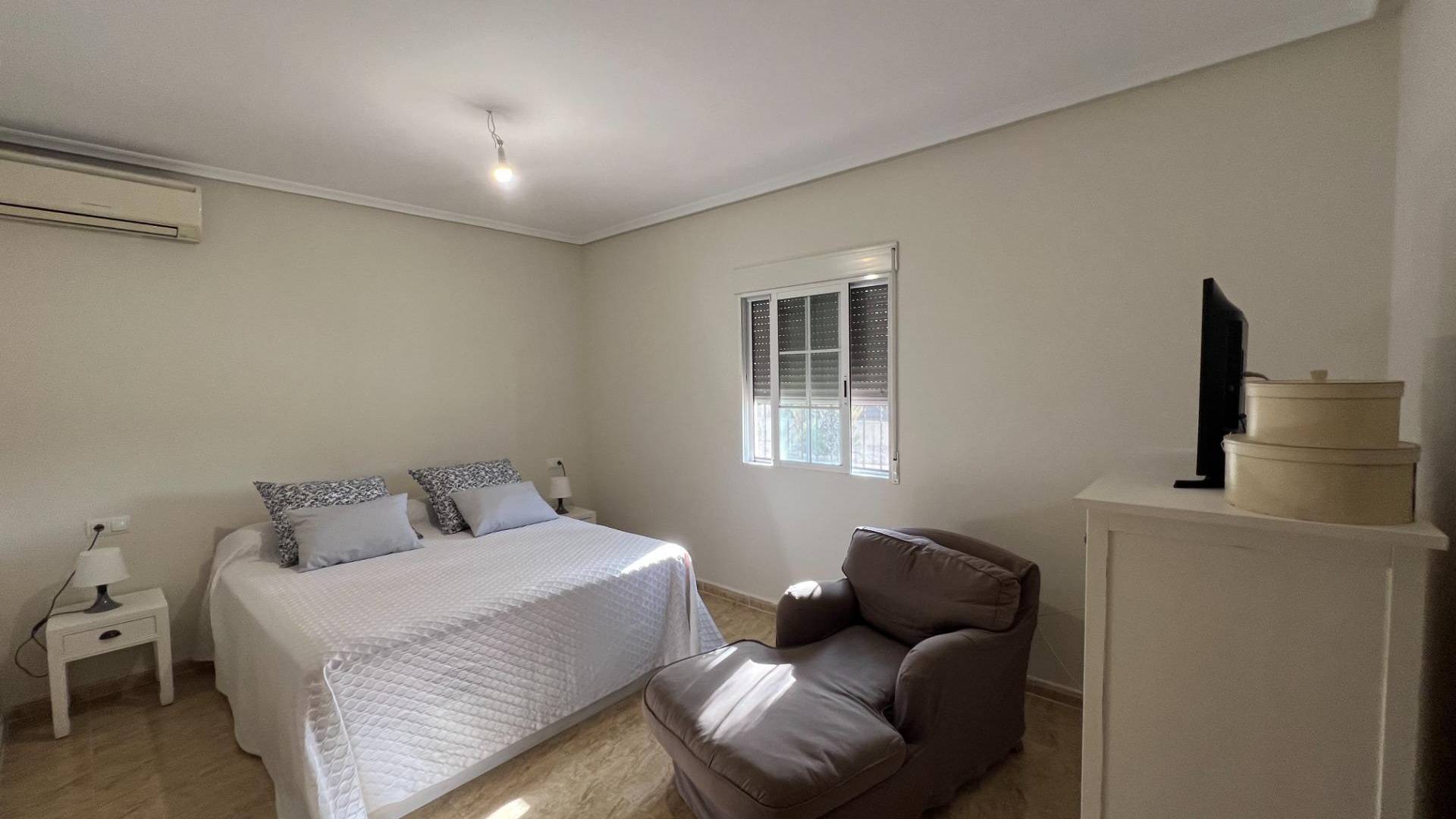 Villa individuelle de 3 chambres à Dolores, ALICANTE. La propriété est lumineuse, bien entretenue et spacieuse avec une grande cuisine, un salon/salle à manger, 3 chambres - 2 ont des placards intégrés, une a une salle de bain privée. Il y a aussi une salle de bain familiale supplémentaire. Accès depuis la cuisine au garage double intégré. Un porche couvert est idéal pour les repas en plein air. La piscine se trouve dans la partie murée de 1700 m2 du terrain de 9078 m2 avec des arbres fruitiers et des arbustes matures. Une dépendance dispose d'une cuisine d'été, d'un barbecue, d'un coin repas et de WC. L'emplacement est paisible et entouré de champs bien qu'à une courte distance de la ville et de toutes les commodités. Idéalement situé à quelques minutes en voiture des plages et d'un accès facile par l'autoroute à l'aéroport d'Alicante/Elche et au-delà !