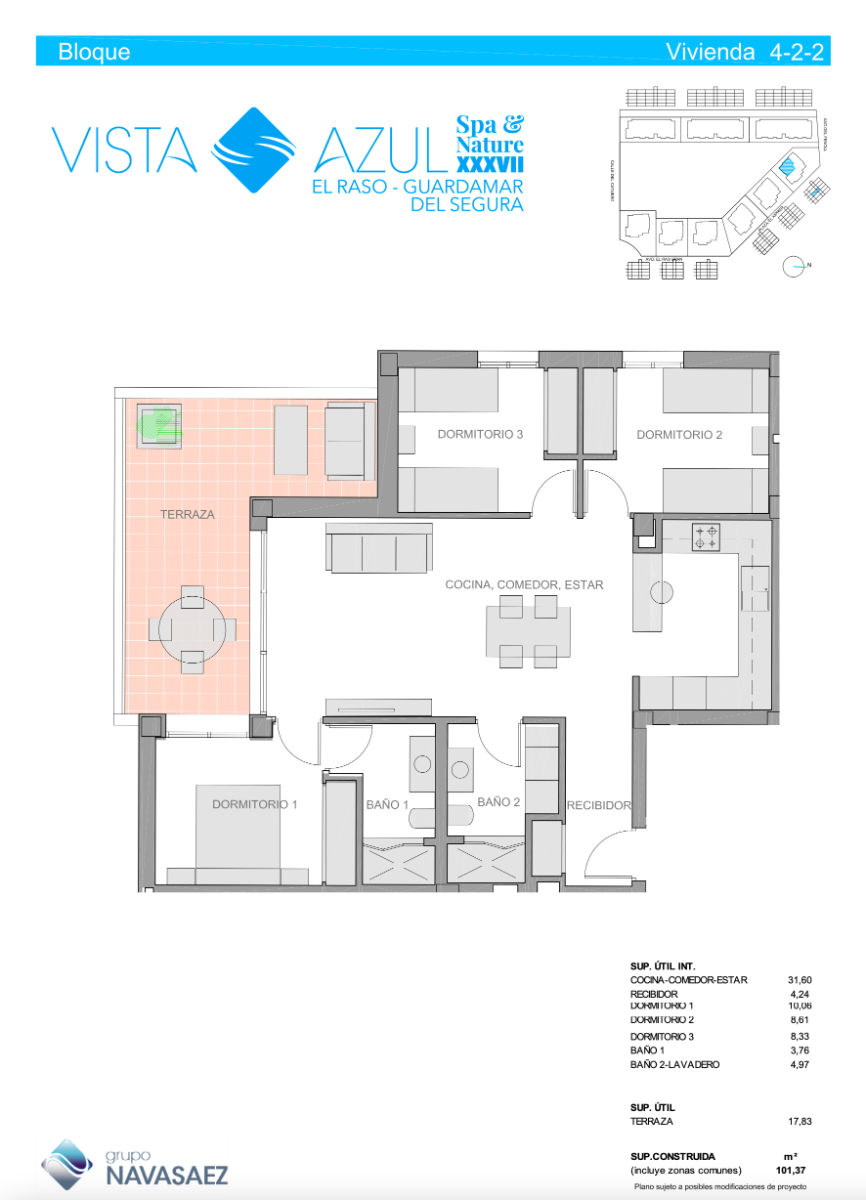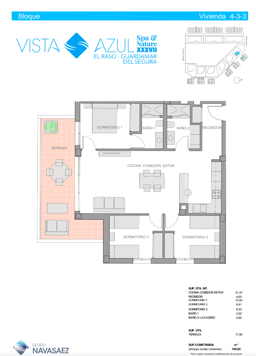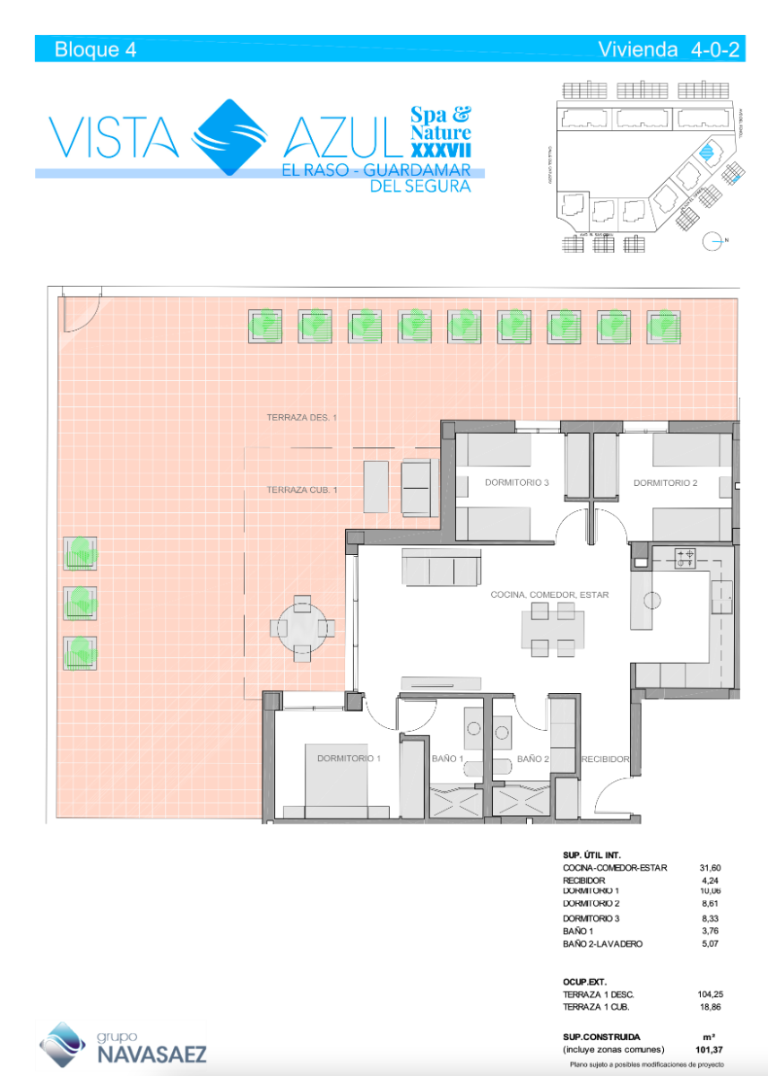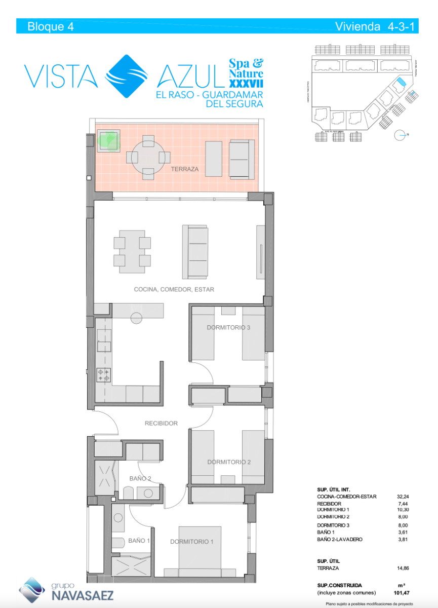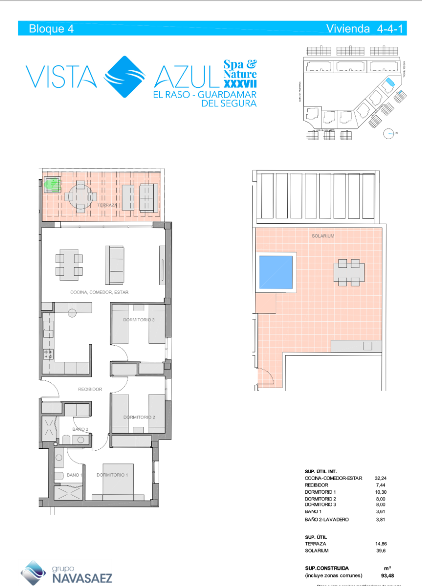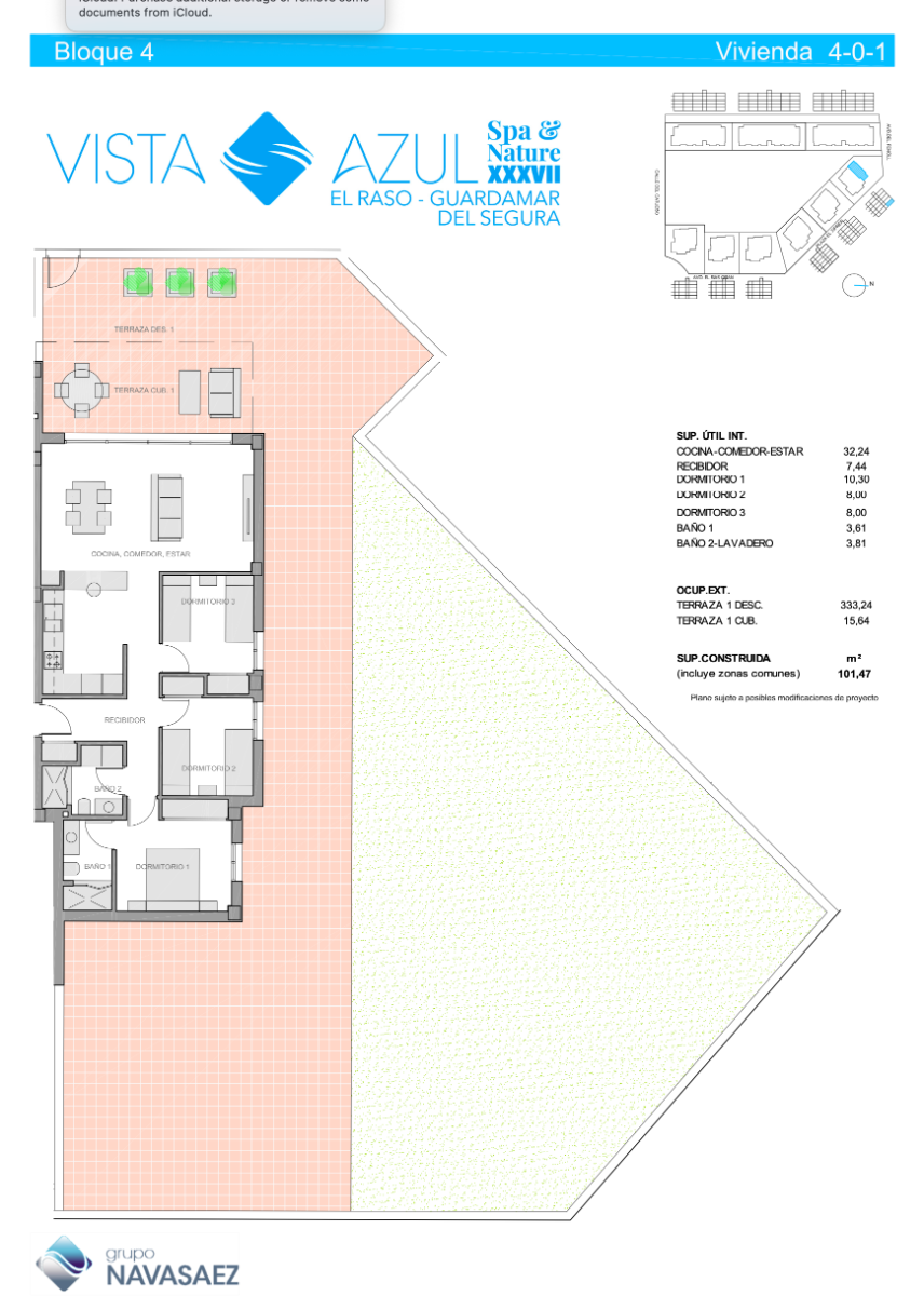 Cette nouvelle résidence disposera de vastes espaces communs où vous pourrez vous détendre dans la grande piscine d'été ou dans le spa chauffé, les enfants pourront profiter du "Vista Azul Park" et les plus sportifs d'une zone de gymnastique avec des machines bio-santé et un "Putting Green Golf" pour pratiquer leur swing, tout cela dans un complexe fermé avec de grands espaces verts bien entretenus pour le plaisir de tous.