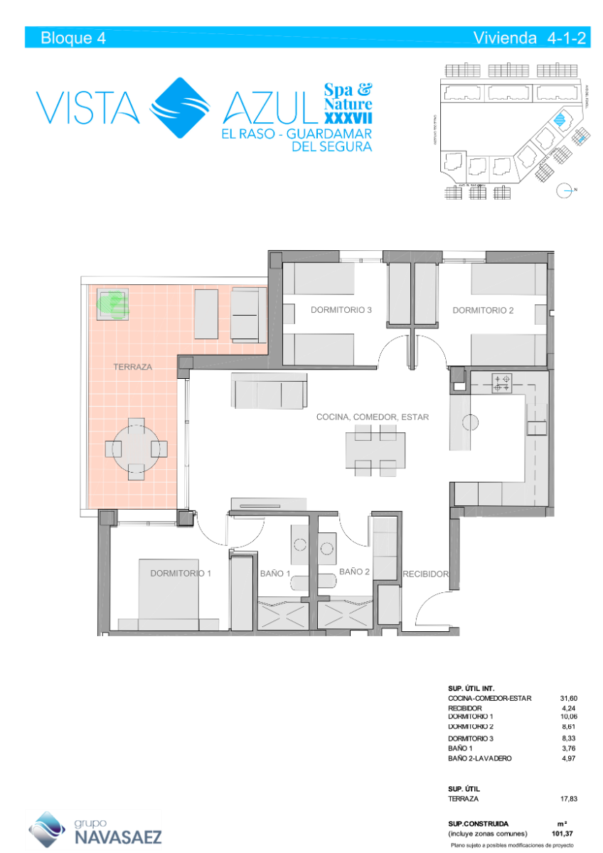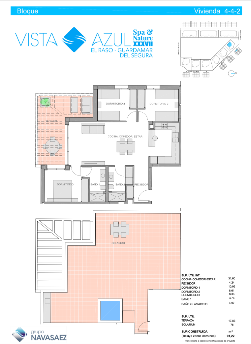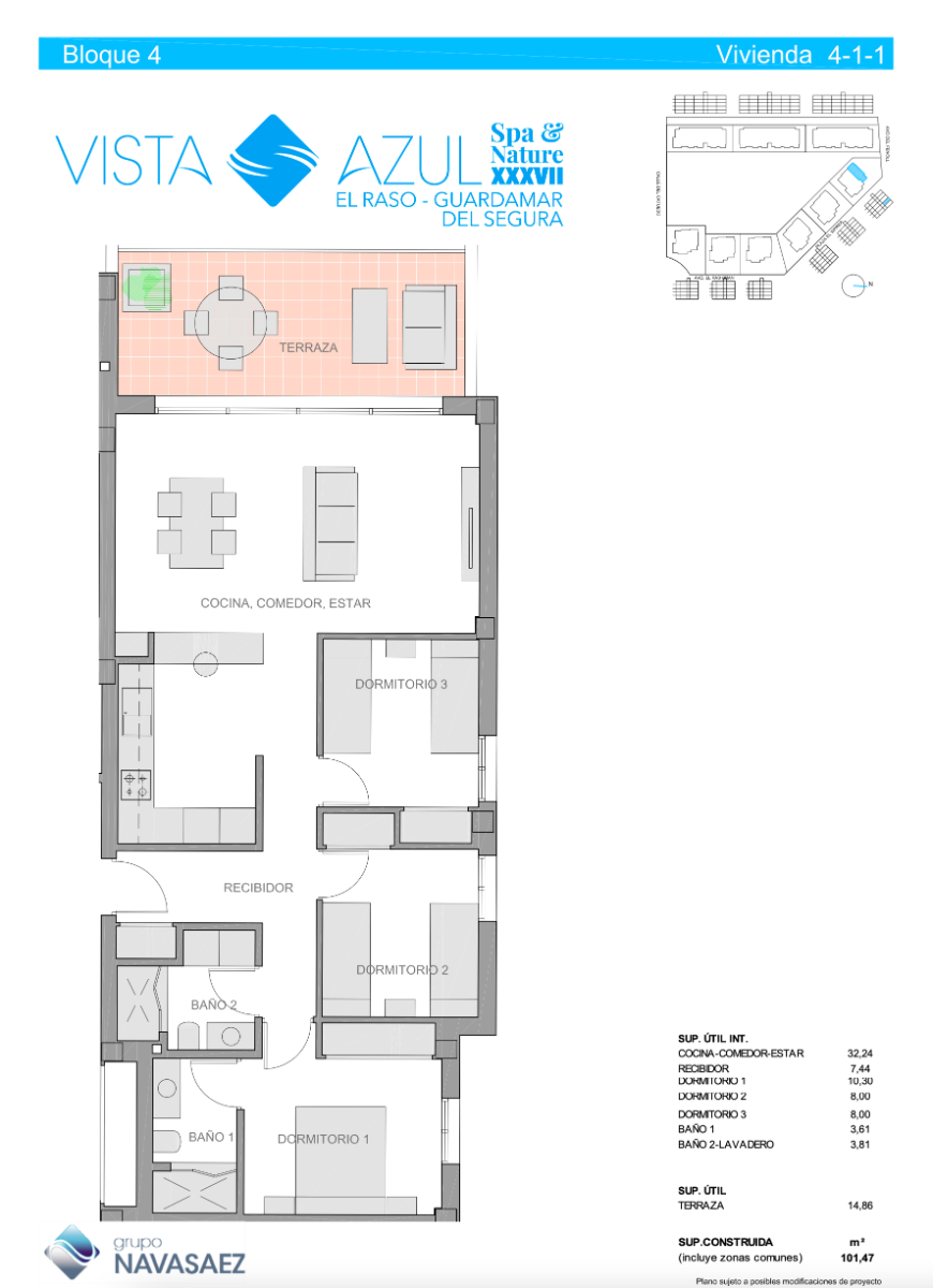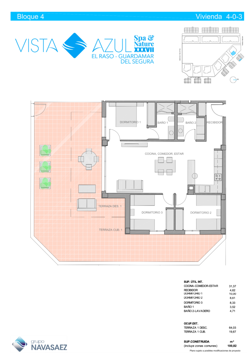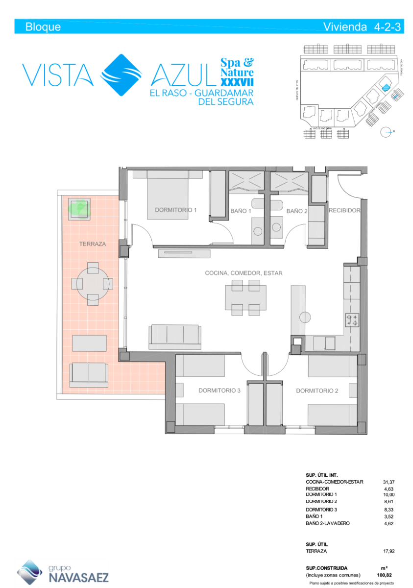 Cette nouvelle résidence disposera de vastes espaces communs où vous pourrez vous détendre dans la grande piscine d'été ou dans le spa chauffé, les enfants pourront profiter du "Vista Azul Park" et les plus sportifs d'une zone de gymnastique avec des machines bio-santé et un "Putting Green Golf" pour pratiquer leur swing, tout cela dans un complexe fermé avec de grands espaces verts bien entretenus pour le plaisir de tous.