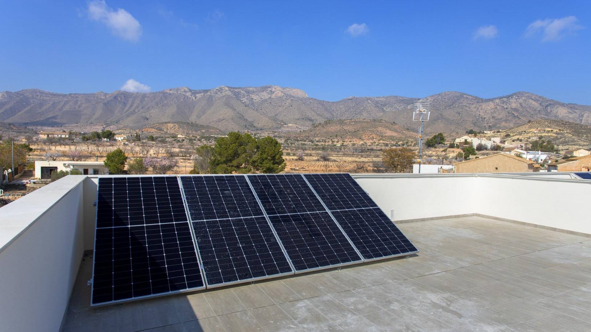 NIEUWBOUW BUNGALOWS IN HONDÓN DE LAS NIEVES Nieuwbouw 4 bungalows gelegen in Hondón de las Nieves (Alicante) Alle bungalows hebben 3 slaapkamers met inbouwkasten, 2 badkamers, grote woonkamer, inbouwkeuken en terras. De woningen zijn beschikbaar op de begane grond met terras/tuin voor en achter en op de bovenste verdieping met terras en privésolarium. De woningen op de eerste verdieping hebben fotovoltaïsche panelen op het dak voor energiebesparing. De keukens zijn volledig ingericht en afgewerkt met granieten of synthetisch agglomeraat werkbladen (silestone of vergelijkbaar). De badkamers zijn afgewerkt met hoogwaardig sanitair en kranen met ingebouwde stortbak. Deze woningen hebben een pre-installatie voor airconditioning met warmtepomp, geforceerde ventilatie met warmteterugwinning, aerothermisch systeem voor sanitair warm water, de modernste thermische en akoestische isolatie, aluminium buitenschrijnwerk met koudebrugonderbreking en rolluiken. Hondón de las Nieves is een stad in de Valenciaanse Gemeenschap, Spanje. Het ligt in het zuidwesten van de provincie Alicante, in de regio Vinalopó Medio. De stranden en de luchthaven van Alicante liggen op slechts 30 minuten rijden.