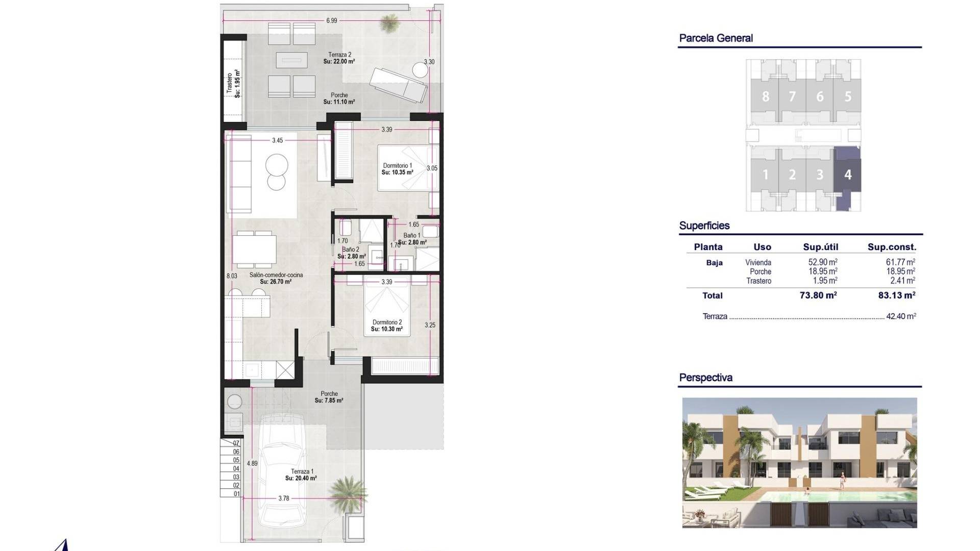 NIEUWBOUW BUNGALOW APPARTEMENTEN IN SAN PEDRO DEL PINATAR Nieuwbouw wooncomplex met moderne bungalowappartementen in San Pedro Del Pinatar. De gelijkvloerse bungalow met 2 slaapkamers heeft een terras met privétuin. De bovenste verdieping bungalow met 3 slaapkamers hebben een groot solarium. Alle bungalows hebben een parkeerplaats. Er is een gemeenschappelijke tuin met zwembad. De bevoorrechte ligging van San Pedro del Pinatar aan de Mar Menor en de Middellandse Zeekust trekt mensen aan die geïnteresseerd zijn in zeilen en watersporten, met ligplaatsen in de jachthaven en zeilclubs, terwijl de stranden en natuurlijke modderbaden mensen aantrekken die op zoek zijn naar veilige zon, zee en strand. San Pedro del Pinatar heeft een gevestigde gemeenschap en biedt een uitstekend aanbod aan activiteiten, waaronder een overdekt zwembad en sportfaciliteiten, evenals het hele jaar door een programma van sociale activiteiten door het aangename winterweer. De voordelen van de modderbaden, typerend voor de regio, of het rustige water van de Mar Menor hebben de groei van Lo Pagán bevorderd, dat momenteel over allerlei voorzieningen beschikt. Bovendien heeft het een uitstekende ligging, op slechts 5 minuten van het commerciële centrum Dos Mares. Het vliegveld van Murcia/Corvera ligt op 30 minuten rijden en dat van Alicante op een uur rijden.