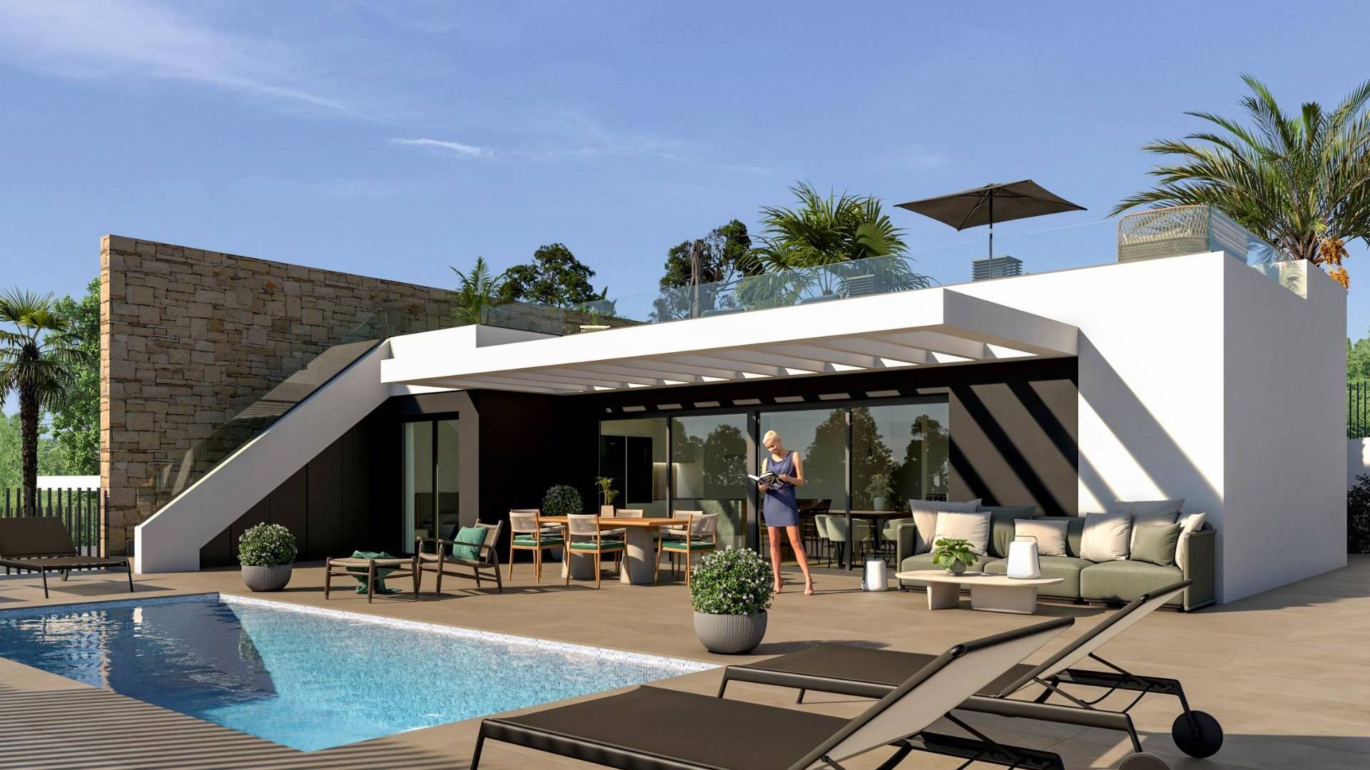 NIEUWBOUW HALFVRIJSTAANDE VILLA'S IN MUTXAMEL Nieuwbouw villa van het type twee-onder-een-kap in Mutxamel, op korte afstand van de luchthaven van Alicante, de stad Alicante en de stranden. Prachtige villa's gebouwd over 1 verdieping en heeft 3 slaapkamers, 3 badkamers, open keuken met de woonkamer, inbouwkasten, terras, solarium, prive tuin met het zwembad parkeerplaats. Mutxamel is een stad in de staat Alicante. Het staat ook bekend als Muchamiel en ligt in het noorden van de metropool Alicante.
