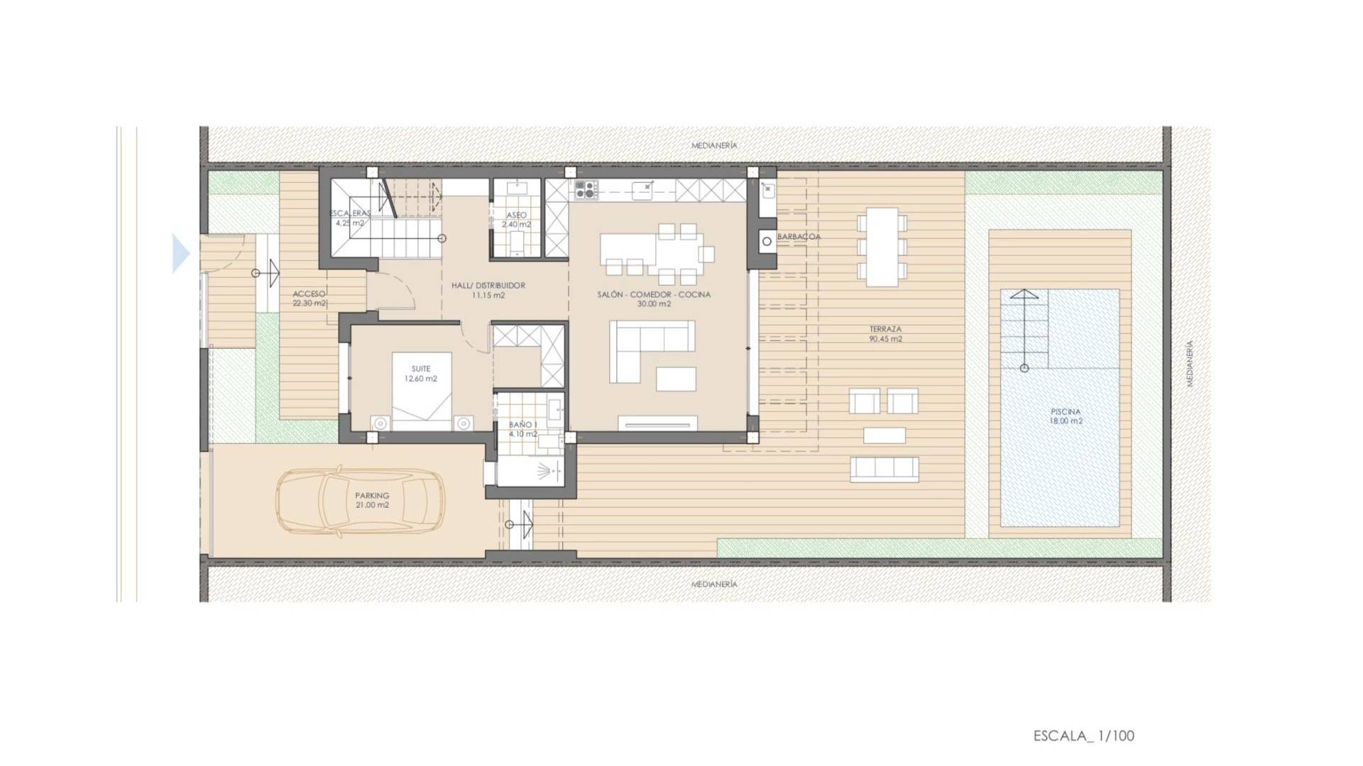 NIEUWBOUW VILLA'S IN SAN JUAN DE LOS TERREROS De eigentijdse en innovatieve architectuur van moderne villa's komt samen in een wooncomplex in de stad San Juan de los Terreros in Pulpí, Almería, in Zuid-Spanje. Deze zorgvuldig ontworpen woningen en het wooncomplex combineren een uitzonderlijk niveau van design en kwaliteit met de hoogste normen op het gebied van duurzaamheid en welzijn. Woningen die zorgvuldig zijn ontworpen door het technische team van architecten, zodat licht, ruimte en oriëntatie elk huis en elk perceel een speciaal karakter geven. Unieke ruimtes die de deur openen naar een nieuwe levensstijl om van te genieten. De fundering en de structuur van de huizen zijn gemaakt van gewapend beton en hebben een garantie van tien jaar. Gevels ontworpen om de energiebehoefte van het huis te verminderen, gecombineerd met verschillende materialen om een esthetische consistentie te bereiken in termen van compositie en kleur zoals weergegeven in de infografieken. Ruime terrassen uitgerust met solide borstweringen om veiligheid te bieden op de terrasbalustrades, die amplitude en helderheid verlenen. De buitenomheiningen van het perceel zullen worden behandeld met dezelfde materialen die in het huis worden gebruikt, waardoor integratie in het wooncomplex wordt gegarandeerd. Geventileerde en geïsoleerde platte daken op platen, met verschillende afwerkingen afhankelijk van hun locatie en gebruik. De toegangsdeur van het huis wordt gepantserd. De deuren naar de hoofdslaapkamer, secundaire badkamers en toiletten worden voorzien van sloten. Het buitenschrijnwerk bestaat uit ramen en openslaande deuren van gelakt aluminium met rolgordijnen van aluminium lamellen, gemotoriseerd in de woonkamers. Video-intercomsysteem, dat individuele toegangscontrole garandeert voor elk van de huizen. De badkamers zijn uitgerust met een wastafel, toilet en douche, en de toiletten hebben een toilet en wastafel. De badkamers zijn voorzien van modern design sanitair, gemaakt van wit geglazuurd porselein, van het merk Roca en model Gap, met chromen of matzwarte eenhendel kranen om uit te kiezen. De douchewanden worden bevestigd met 8mm gehard glas met een lengte van 80cm. Elke pre-installatie is ontworpen voor een systeem van maximaal 10 panelen, die kunnen worden geïnstalleerd met een omvormer die wordt aangesloten op het elektriciteitsnet van de woning om het elektriciteitsverbruik te minimaliseren. Deze panelen worden geïntegreerd op het dak, in de installatiezone, verborgen van de buitenkant van de woning. De luchttoevoer naar de woningen wordt verzekerd door het inbouwen van een microventilatiesysteem in de ramen van woon- en slaapkamers. Onafhankelijke rookafvoer voor de afzuigkap in de keuken. Een pre-installatie van domotica in de woning met voorbereiding voor een toekomstige installatie van domotica voor het regelen van het klimaat en de verwarming in de kamer, jaloezieën en mogelijke inbraakalarmsystemen. Pre-installatie van videobewaking op de parkeerplaats en binnenzones van het perceel. Elke woning krijgt een volledig geïnstalleerde keuken afgewerkt in mat wit, volgens ontwerp, met een GOLA-systeem. De binnenkasten zullen wit zijn, met scharnierende deuren en laden met remmen onder de keramische kookplaat, klaar om zichtbare apparatuur te installeren. Apparaten zijn niet inbegrepen. Slaapkamers met ingebouwde kasten worden geleverd met schuifdeuren in mat wit. Deze woningen zullen energiezuinig zijn en weinig vervuiling veroorzaken. Ze zijn ontworpen met een focus op grotere efficiëntie voor lager energieverbruik, waardoor rationeel energiegebruik wordt gestimuleerd en tegelijkertijd zorg wordt gedragen voor het milieu, de kwaliteit en het klimaatcomfort in de woning. Glas met een lage emissiviteit voorkomt warmteverlies naar buiten, wat resulteert in economische besparingen door warmte in de woning vast te houden in de winter en te voorkomen dat warmte binnenkomt in de zomer. De HVAC- en warmwatersystemen zijn ontworpen met individuele systemen om het verbruik en de efficiëntie van elke woning te maximaliseren. San Juan de los Terreros is een kustgehucht dat deel uitmaakt van de gemeente Pulpí. Het staat bekend om zijn prachtige stranden, de laatste van Andalusië. Voor de kust van San Juan de los Terreros liggen twee kleine vulkanische eilandjes die het natuurmonument Isla de Terreros-Isla Negra vormen. Het meest karakteristieke monument van de stad is het kasteel van San Juan de los Terreros, gebouwd in 1764 op een voorgebergte vanwaar, op heldere dagen, een groot deel van de kustlijn van Almería en Murcia te zien is. Geïntegreerd in de rust en schoonheid van de eigen natuur, badend in stranden en baaien met kristalhelder water, geclassificeerd als een van de beste van Spanje. Omringd door beschermde natuurlandschappen die ons vervullen met rust en ons tegelijkertijd opladen met energie, dankzij een bruisend gastronomisch, sociaal en sportief aanbod. Exclusieve restaurants, sportclubs en natuurlijk uitstekende golfbanen met uitzicht op zee zoals Aguilón Golf. Een perfecte bestemming om het hele jaar door met het gezin van te genieten.
