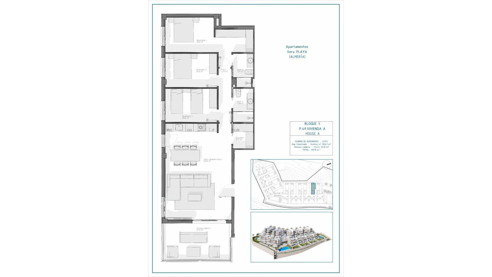 Nieuwbouwappartementen in Vera Playa, Almería – Moderne woningen vlak bij de zee Eigentijds wonen in Pueblo Salinas, op slechts 2 km van het strand Maak kennis met een prachtig nieuw woonproject in de gewilde omgeving van Vera Playa, in de exclusieve urbanisatie Pueblo Salinas. Dit moderne complex biedt een bevoorrechte levensstijl op slechts 2 km van de stranden van Vera (Almería), met een spectaculair uitzicht op zee en een rustige mediterrane omgeving die ideaal is om het hele jaar door te wonen of te genieten van uw vakantie. Elegante woningen met modern comfort en stijl Dit nieuwe project bestaat uit 60 hoogwaardige appartementen verdeeld over 5 laagbouwblokken, met slechts twee woningen per verdieping. Kies uit indelingen met 2 of 3 slaapkamers, ontworpen met het oog op functionaliteit, comfort en stijl. De opties omvatten: Begane grond met privétuin Appartementen op de middelste verdiepingen met ruime terrassen Penthouses op de bovenste verdieping met grote solariums, inclusief zomerkeuken en pergola met zonnepanelen. Alle woningen zijn voorzien van: Open, volledig uitgeruste keukens met ingebouwde koelkast, vaatwasser, inductiekookplaat, oven, magnetron en afzuigkap Lichte woonruimtes en ledverlichting in het hele huis (behalve in de slaapkamers) Gemotoriseerde aluminium rolluiken in de slaapkamers Badkamers met moderne afwerking, inclusief handdoekverwarmers, douchebakken met glazen schermen en ingebouwde meubels Voorbereiding voor airconditioning Aerothermisch systeem voor efficiënte warmwaterproductie Beveiligde toegangsdeur Uitzonderlijke gemeenschappelijke voorzieningen Bewoners hebben toegang tot een breed scala aan voorzieningen die zijn ontworpen om het comfort en de vrijetijdsbesteding te verbeteren, waaronder: Twee buitenzwembaden, perfect voor de zomermaanden Een verwarmd binnenzwembad dat het hele jaar door kan worden gebruikt Privé parkeerplaats en berging bij elke woning Voorbereiding voor het opladen van elektrische auto's op de parkeerplaatsen Toplocatie met uitstekende verbindingen Vera Playa is een populaire kustbestemming die bekend staat om zijn brede zandstranden en ontspannen levensstijl. De locatie van het project biedt gemakkelijke toegang tot essentiële voorzieningen en bezienswaardigheden: Strand: 2 km Desert Springs Golf Resort: 8 km Centrum van Vera: 5 km Jachthaven en restaurants van Garrucha: 6 km Parque Comercial Mojácar: 10 km Luchthaven Almería: 85 km (1 uur met de auto) Maak van Vera Playa uw nieuwe thuis Of u nu op zoek bent naar een permanente woning, een vakantiehuis of een slimme investering, deze nieuwbouwappartementen bieden een ongeëvenaarde waarde in een van de meest gewilde gebieden van de Costa de Almería. Neem vandaag nog contact met ons op voor meer informatie en om uw bezoek te plannen.