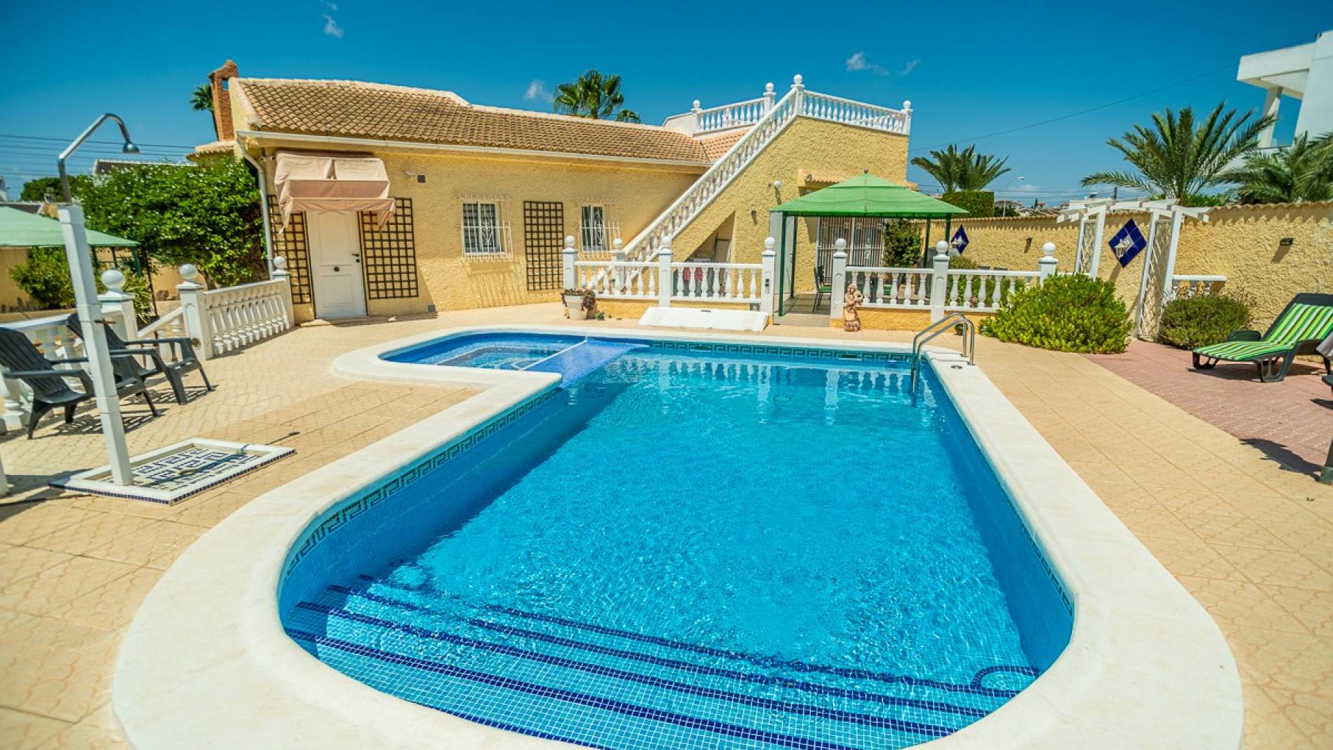 Te koop: Prachtige villa in mediterrane stijl met uitzicht op het dak en zwembad in La Siesta, Torrevieja Ontdek uw droomhuis in de rustige woonwijk La Siesta , vlakbij de spectaculaire zoutmeren van het Parque Natural de Torrevieja , beroemd om zijn unieke roze Laguna Rosa . Deze ruime, lichte villa in mediterrane stijl biedt een adembenemend dakterras met uitzicht op de lagune en de skyline van Torrevieja, perfect om te ontspannen en gasten te ontvangen. Deze uitzonderlijke woning beschikt over circa 156 m² woonoppervlakte op een royaal perceel van 800 m² . De villa beschikt over een prachtig ontworpen zwembad met ingebouwde jacuzzi en een stijlvolle poolbar , aangevuld met ruime terrassen om te genieten van de mediterrane zon. Hoogtepunten van het pand: Hoofdhuis met 3 ruime slaapkamers en 3 moderne badkamers Groot dakterras met panoramisch uitzicht op Laguna Rosa en Torrevieja Prachtige tuin en buitenruimtes van 800 m² Luxe zwembad met ingebouwde jacuzzi en poolbar voor ultieme ontspanning Snelle WiFi en Smart TV met YouTube en Netflix inbegrepen 4 airconditioningunits voor comfort het hele jaar door Toplocatie en lokale attracties: Wandel naar La Siesta Park , met speeltuinen voor kinderen, paddletennisbanen, behendigheidsparcoursen en de grootste verharde pumptrack van Spanje In de buurt ligt Aquapark Flamingo met kleurrijke waterglijbanen en buitenzwembaden Dichtbij supermarkten, banken, apotheken, restaurants en levendige lokale bars met livemuziek en karaoke Op enkele minuten van het winkelcentrum Habaneras en enkele van de mooiste stranden van de Costa Blanca, waaronder La Mata en Moncayo Beach Gemakkelijke toegang tot de luchthaven van Alicante (~35 minuten) en de luchthaven van Murcia (~50 minuten) met de auto Deze mediterrane villa is perfect als permanente woning, vakantiehuis of investeringspand in een van de meest gewilde gebieden van Torrevieja. De combinatie van luxe, privacy en een toplocatie nabij natuurschoon en levendige voorzieningen maakt het een werkelijk unieke ervaring. Neem vandaag nog contact met ons op om een bezichtiging te regelen en maak van deze spectaculaire villa uw nieuwe thuis in de zon!