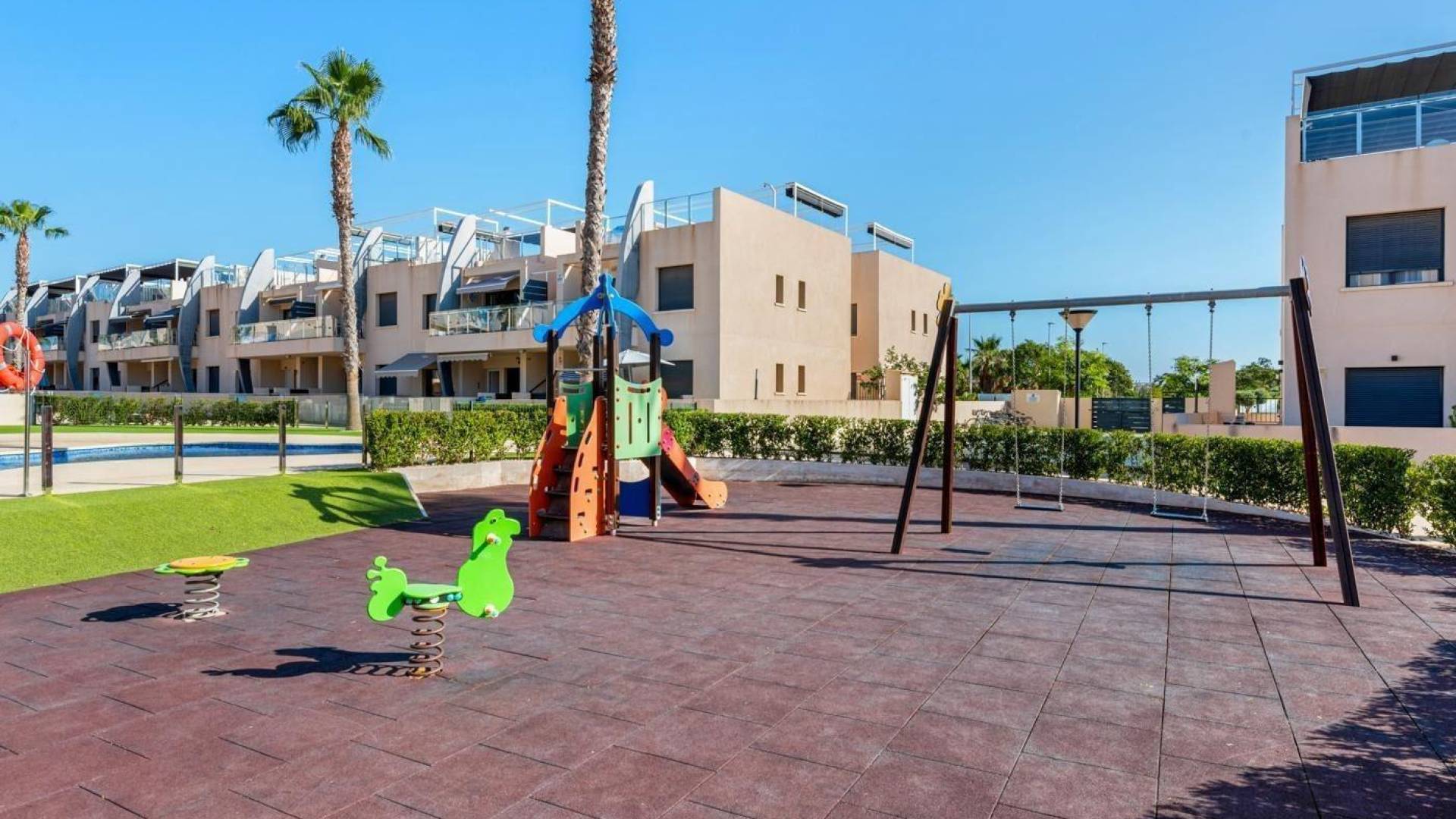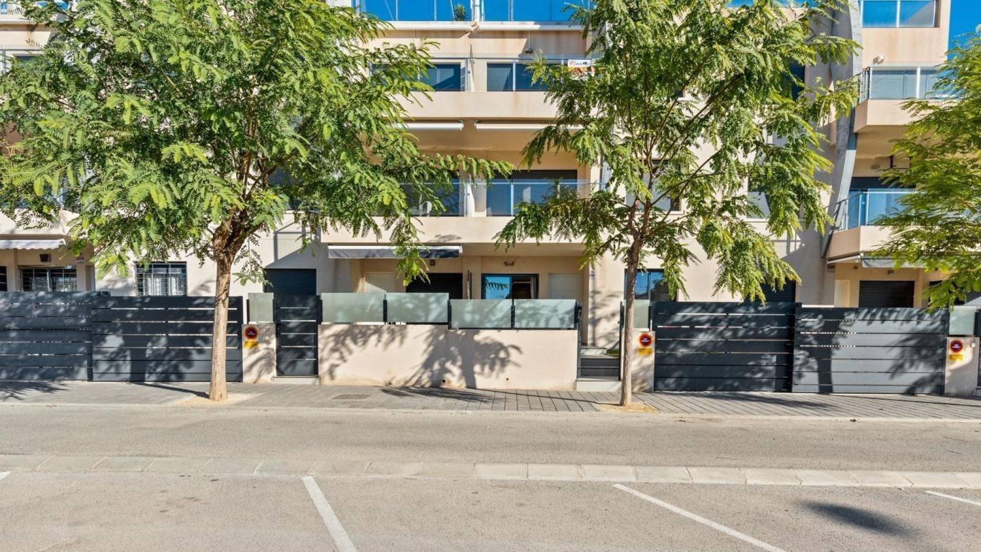 Welkom in dit sfeervolle gelijkvloers appartement, rustig gelegen tussen Mil Palmeras en Torre de la Horadada, op slechts 500 meter van de zee. Deze geliefde omgeving combineert prachtige zandstranden met een gezellige selectie aan restaurants, sportfaciliteiten en golf, waardoor het de ideale plek is om te genieten van het mediterrane leven, zowel tijdens vakanties als het hele jaar door. Het appartement beschikt over een bebouwde oppervlakte van 60 m² en voelt aangenaam licht en open aan dankzij de zuidgerichte oriëntatie. De woning biedt een comfortabele woonkamer met open keuken, twee slaapkamers en twee badkamers, waarvan één en-suite, wat zorgt voor extra privacy en comfort voor bewoners en gasten. De buitenruimte vormt een natuurlijke verlenging van de leefruimte, met verschillende zithoeken waar je in alle rust kan genieten van het buitenleven en het zachte klimaat van de Costa Blanca. Daarnaast is er toegang tot een gemeenschappelijk zwembad, ideaal om te ontspannen en te genieten van zonnige dagen. Gebouwd in 2017 en voorzien van airconditioning, dubbel glas en een verzorgde afwerking, is deze woning volledig klaar om meteen van te genieten. Dankzij de combinatie van ligging, comfort en sfeer is dit een bijzonder fijne woning voor wie op zoek is naar een zorgeloze plek dicht bij zee.